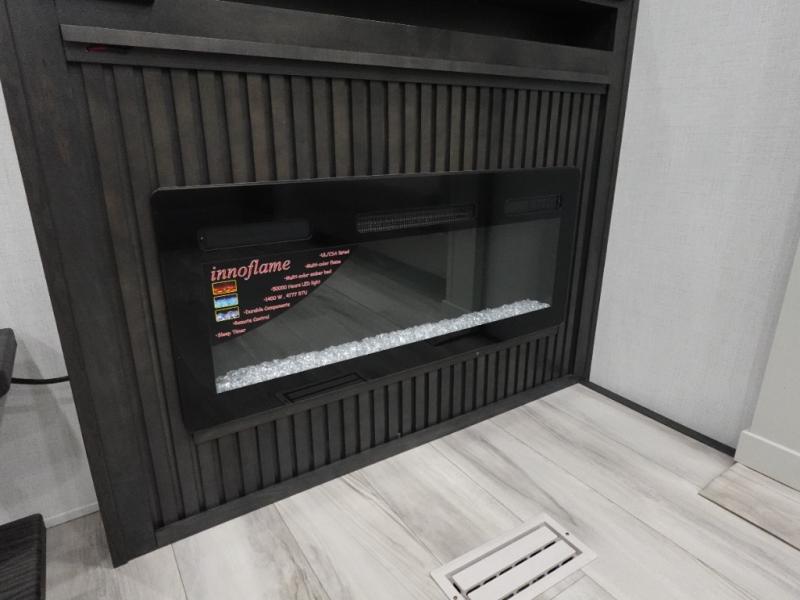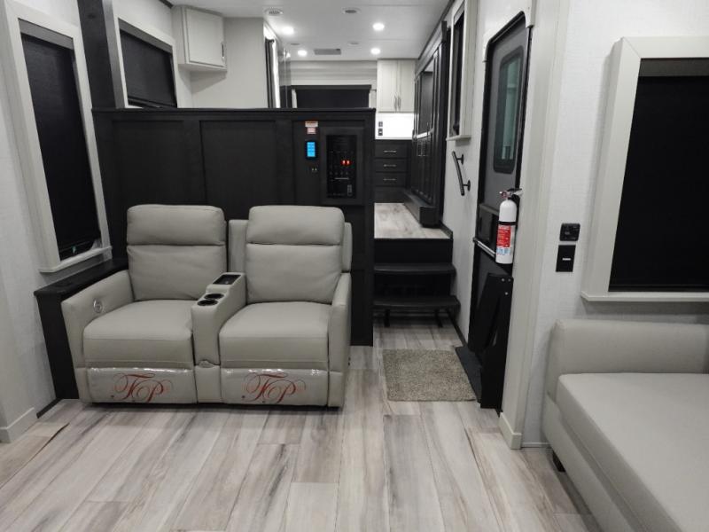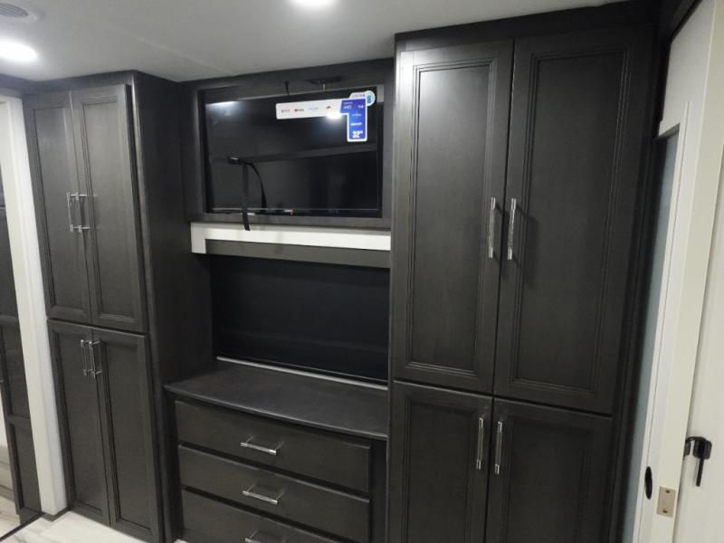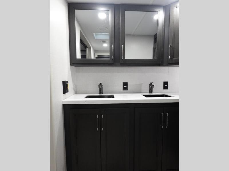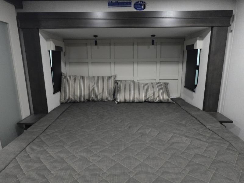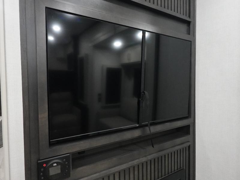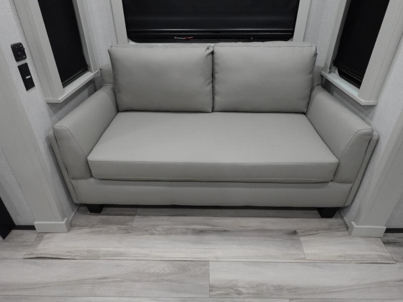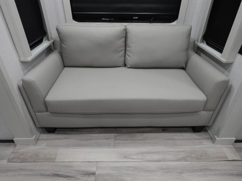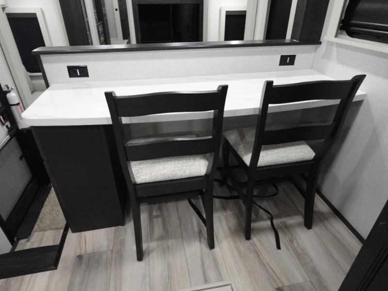This fifth wheel is decked out in luxuries! The full rear bathroom has a walk-in shower to freshen up in each morning, a dual sink vanity for two to get ready at once, plus washer and dryer prep. You will enjoy a good night's rest on the king bed slide inside the private bedroom and others can sleep on the opposing tri-fold sofa sleeper slides in the living room. There is also a theater seating here, along with a fireplace and 50" LED TV for movie nights. The front kitchen is where it's really at in this fifth wheel; ample counter space, a bar top with stools, pull-out drawers, plus a pantry and closet for even more storage!