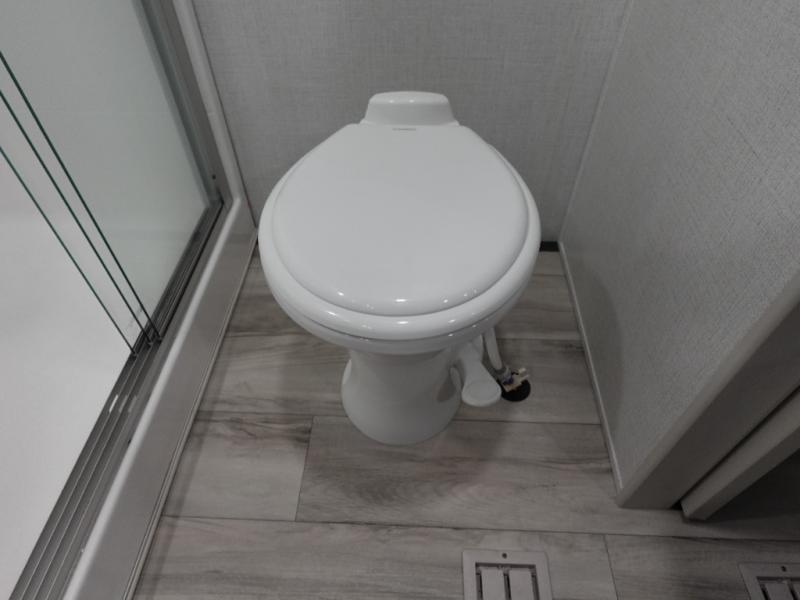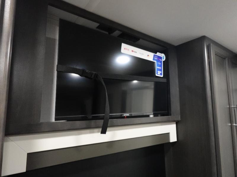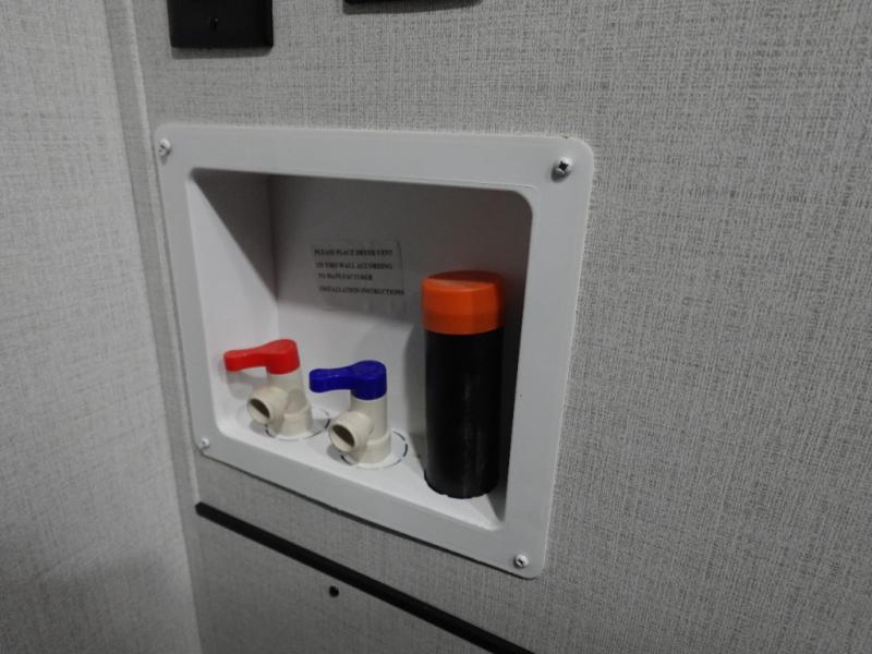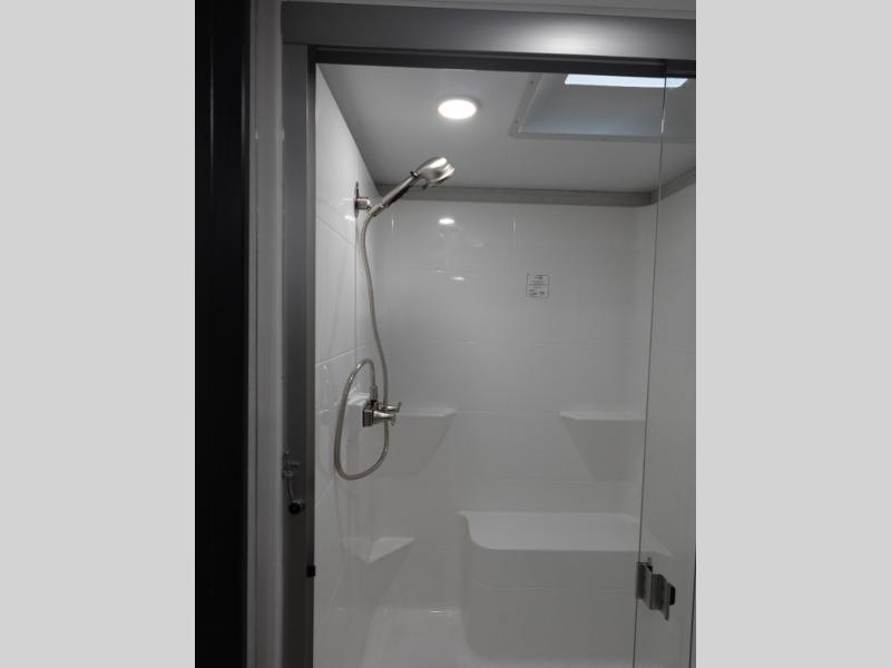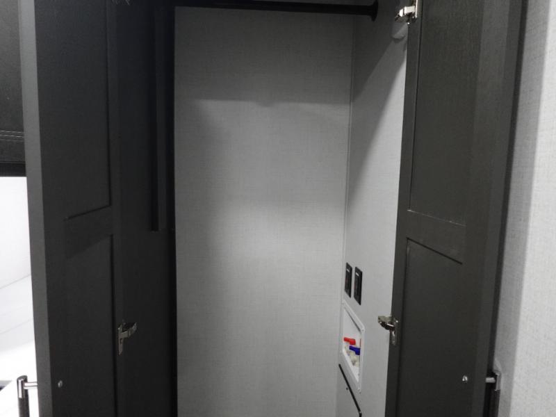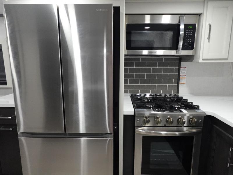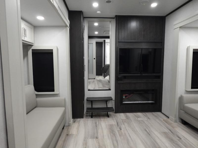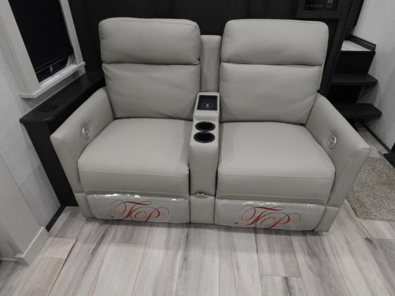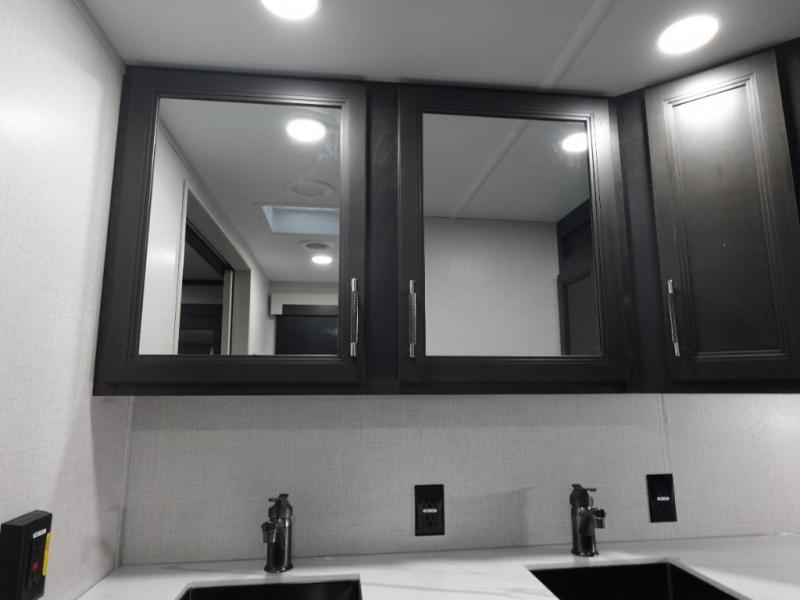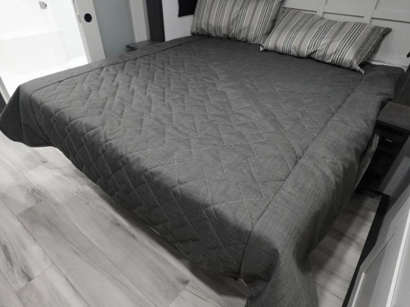 This fifth wheel is decked out in luxuries! The full rear bathroom has a walk-in shower to freshen up in each morning, a dual sink vanity for two to get ready at once, plus washer and dryer prep. You will enjoy a good night's rest on the king bed slide inside the private bedroom and others can sleep on the opposing tri-fold sofa sleeper slides in the living room. There is also a theater seating here, along with a fireplace and 50" LED TV for movie nights. The front kitchen is where it's really at in this fifth wheel; ample counter space, a bar top with stools, pull-out drawers, plus a pantry and closet for even more storage!