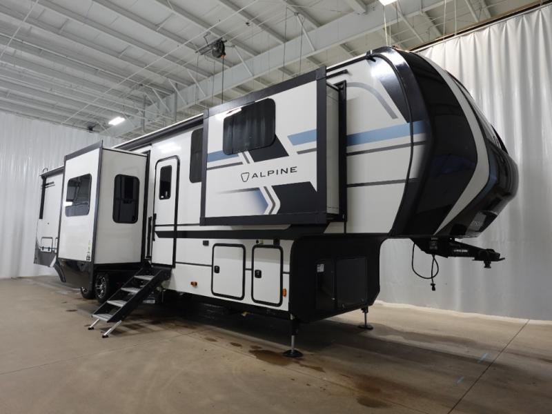 Luxury is not an option, it is a standard with each one of these Keystone RV Alpine fifth wheels! A 8' 4" wide body construction will create an open, residential feeling, and cutting-edge technology will provide a hassle-free camping experience. The Tru-Fit slide construction is more durable and minimizes motor structural stress, as well as resists leaking, and the Blade Pure airflow system provides residential comfort with its high-performance. Each fifth wheel includes designer flooring throughout, stunning solid wood cabinet doors, luxurious crown molding, and solid surface countertops in the kitchen. The exterior also includes an outside shower with hot and cold water, Lippert strut assisted SolidSteps, Hitch Vision with LED lighting, and many more conveniences!