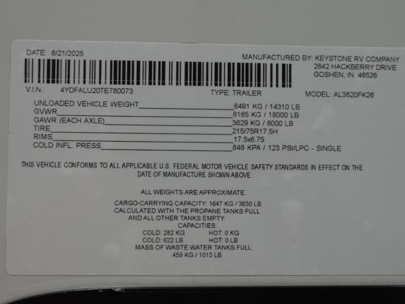 New 2026 Keystone RV Alpine 3820FK Fifth Wheel