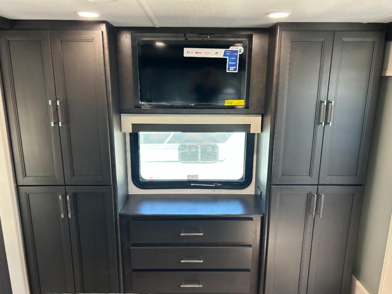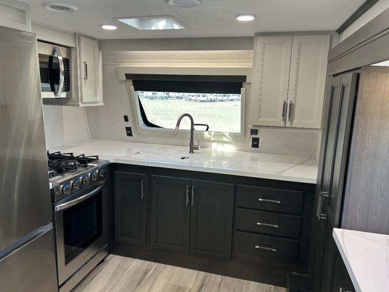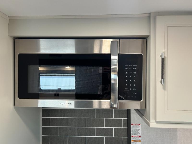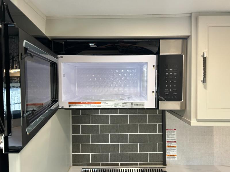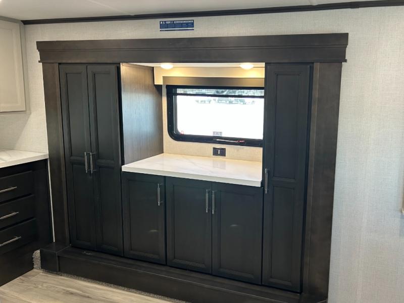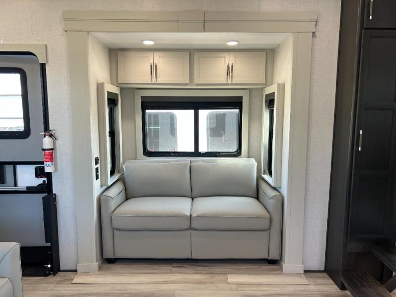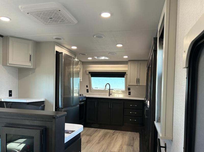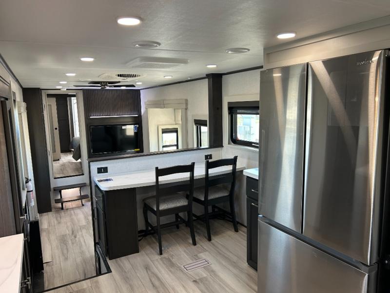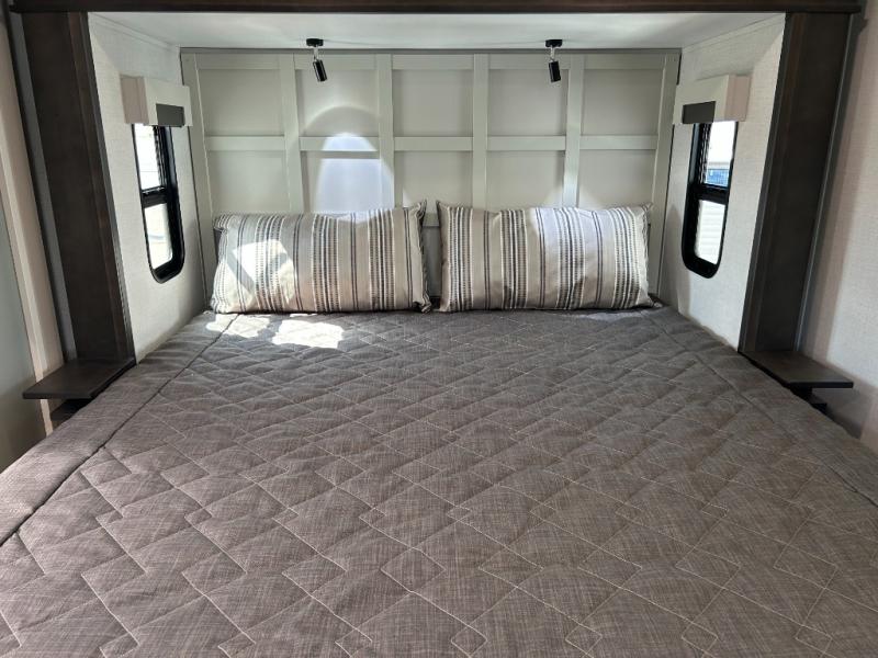 This fifth wheel is decked out in luxuries! The full rear bathroom has a walk-in shower to freshen up in each morning, a dual sink vanity for two to get ready at once, plus washer and dryer prep. You will enjoy a good night's rest on the king bed slide inside the private bedroom and others can sleep on the opposing tri-fold sofa sleeper slides in the living room. There is also a theater seating here, along with a fireplace and 50" LED TV for movie nights. The front kitchen is where it's really at in this fifth wheel; ample counter space, a bar top with stools, pull-out drawers, plus a pantry and closet for even more storage!