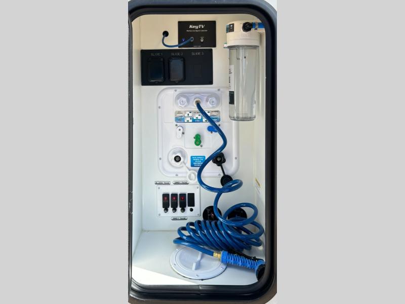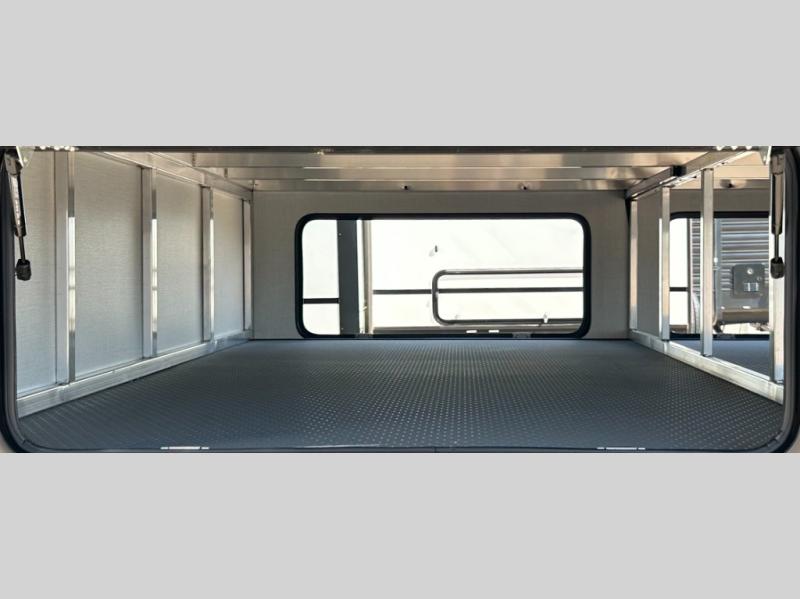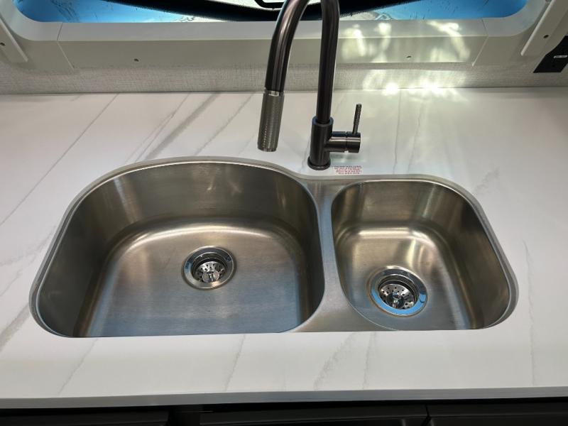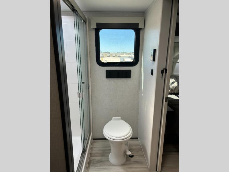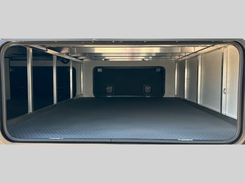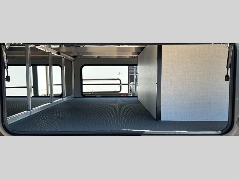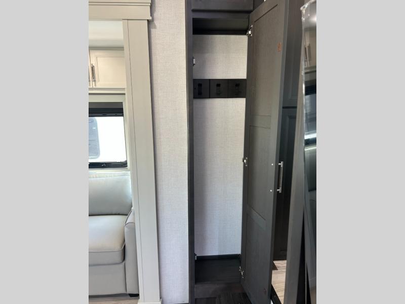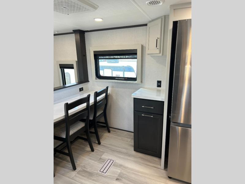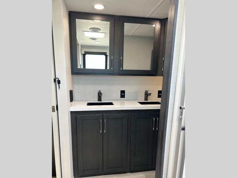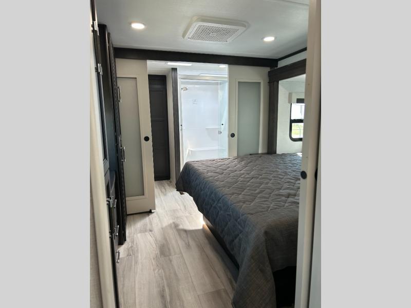 This fifth wheel is decked out in luxuries! The full rear bathroom has a walk-in shower to freshen up in each morning, a dual sink vanity for two to get ready at once, plus washer and dryer prep. You will enjoy a good night's rest on the king bed slide inside the private bedroom and others can sleep on the opposing tri-fold sofa sleeper slides in the living room. There is also a theater seating here, along with a fireplace and 50" LED TV for movie nights. The front kitchen is where it's really at in this fifth wheel; ample counter space, a bar top with stools, pull-out drawers, plus a pantry and closet for even more storage!