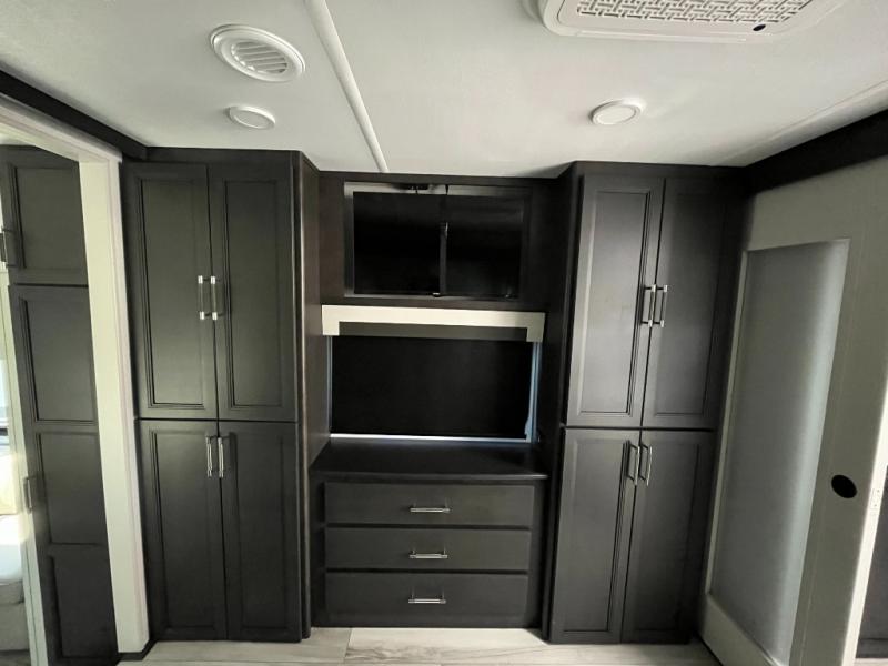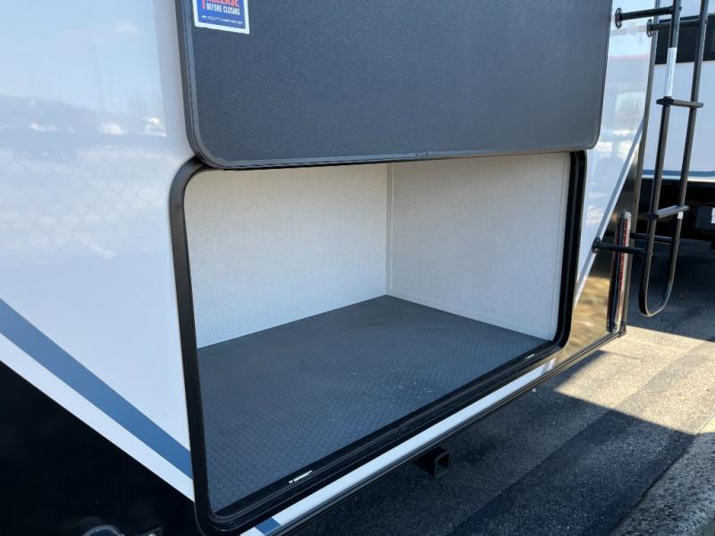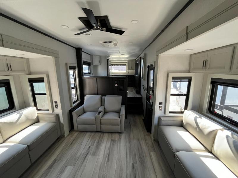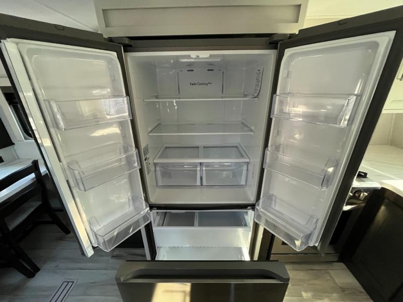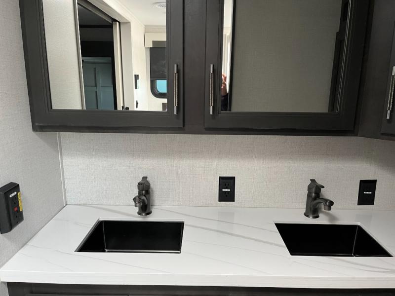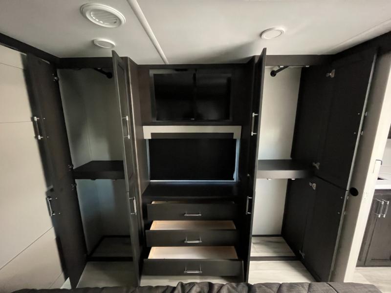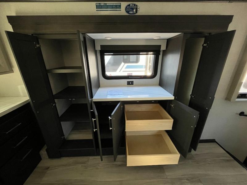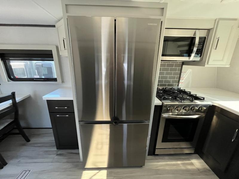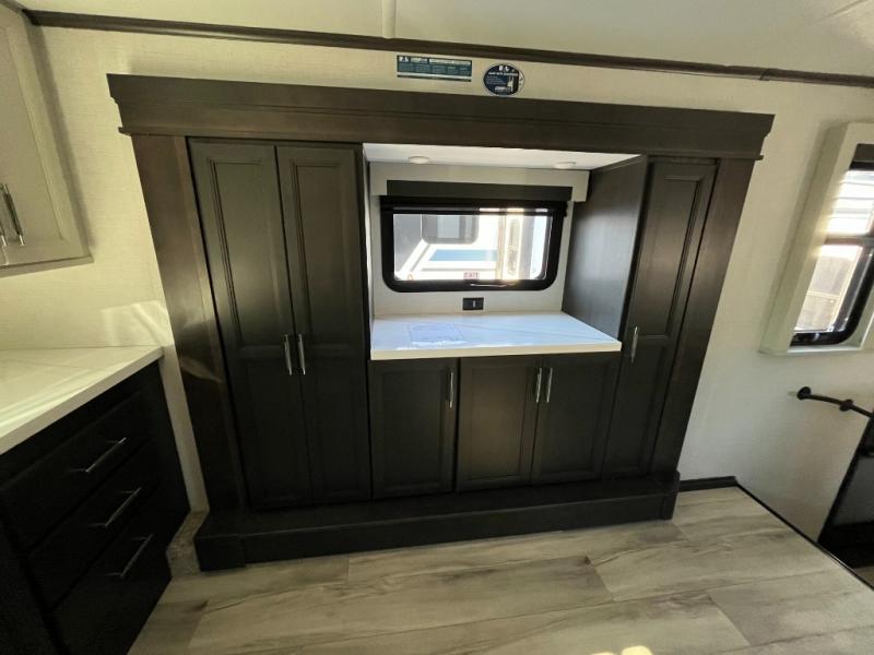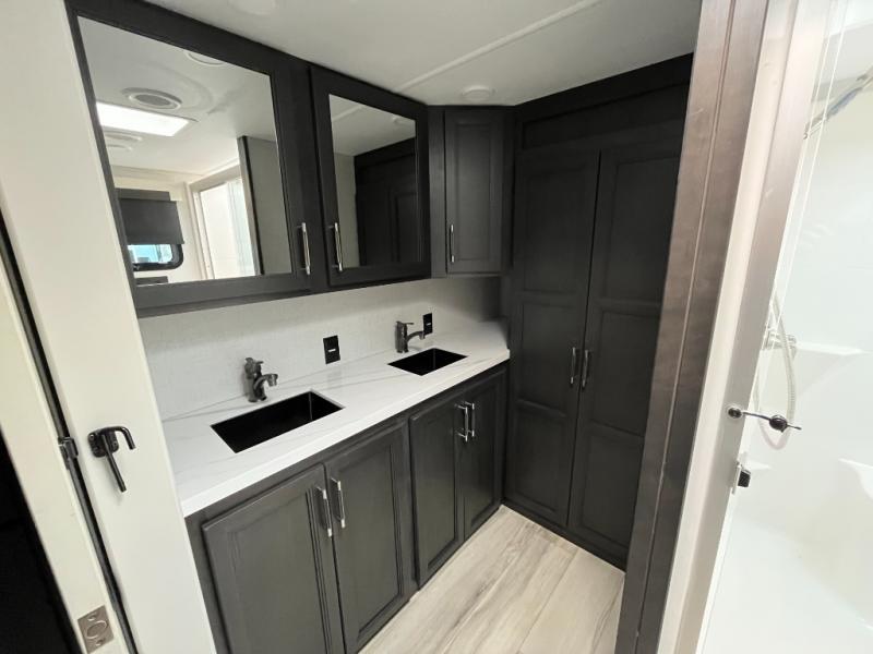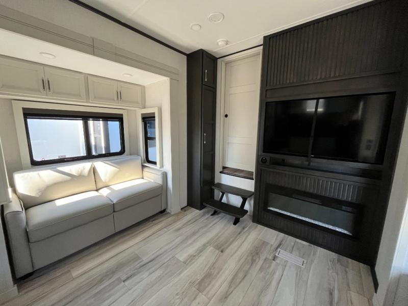 This fifth wheel is decked out in luxuries! The full rear bathroom has a walk-in shower to freshen up in each morning, a dual sink vanity for two to get ready at once, plus washer and dryer prep. You will enjoy a good night's rest on the king bed slide inside the private bedroom and others can sleep on the opposing tri-fold sofa sleeper slides in the living room. There is also a theater seating here, along with a fireplace and 50" LED TV for movie nights. The front kitchen is where it's really at in this fifth wheel; ample counter space, a bar top with stools, pull-out drawers, plus a pantry and closet for even more storage!