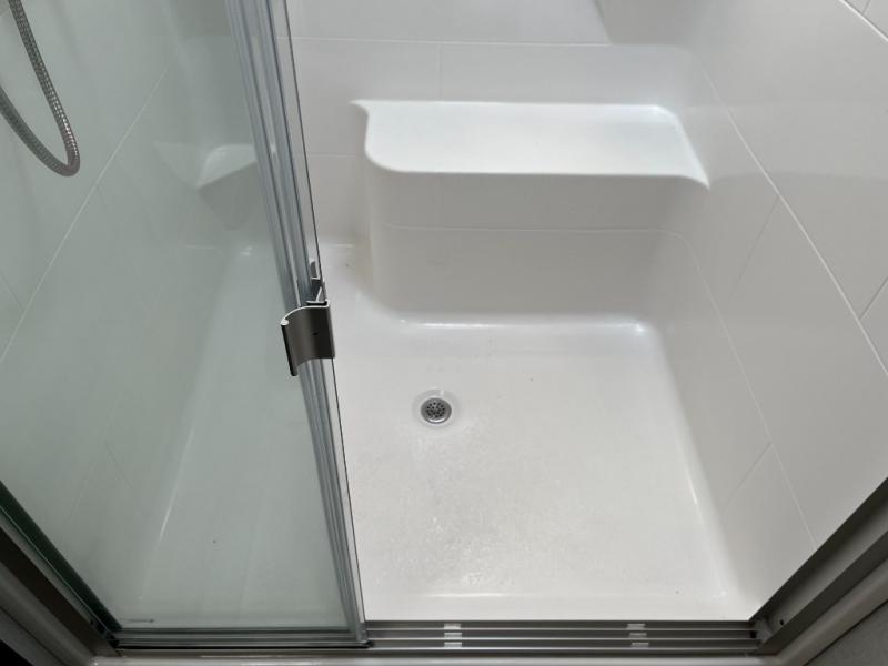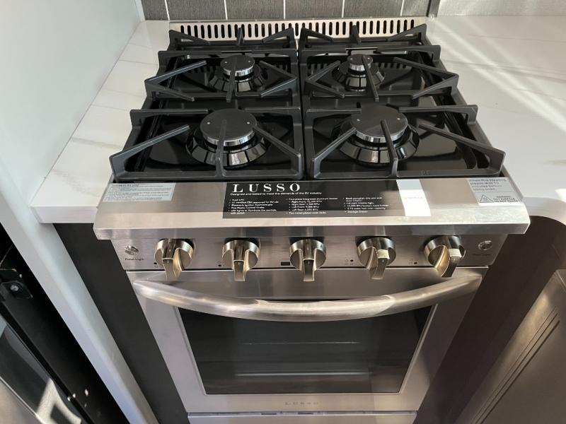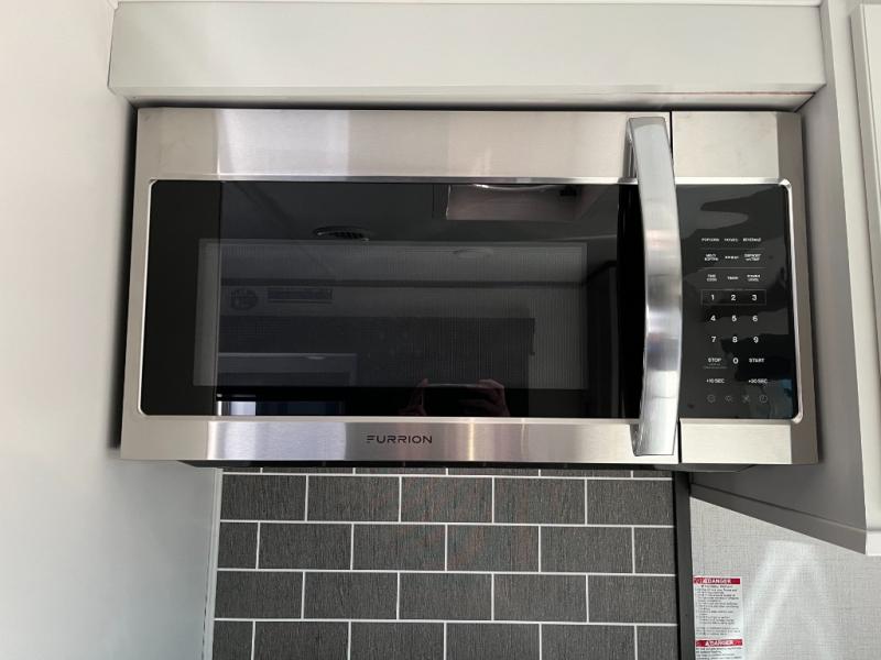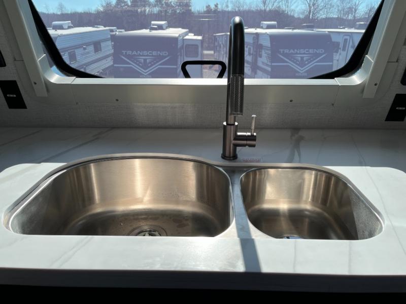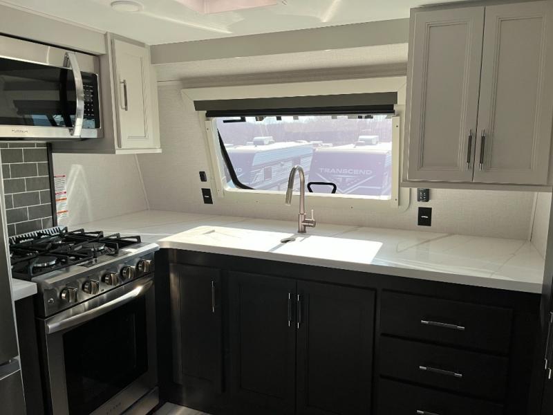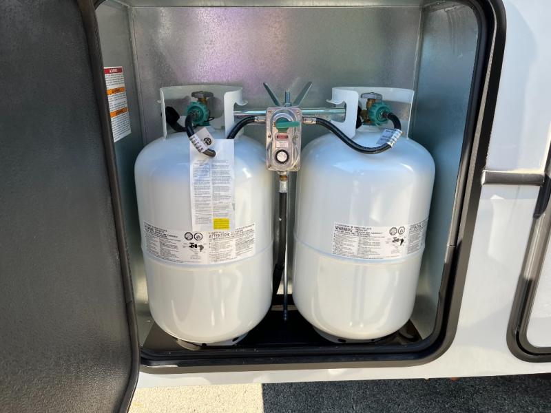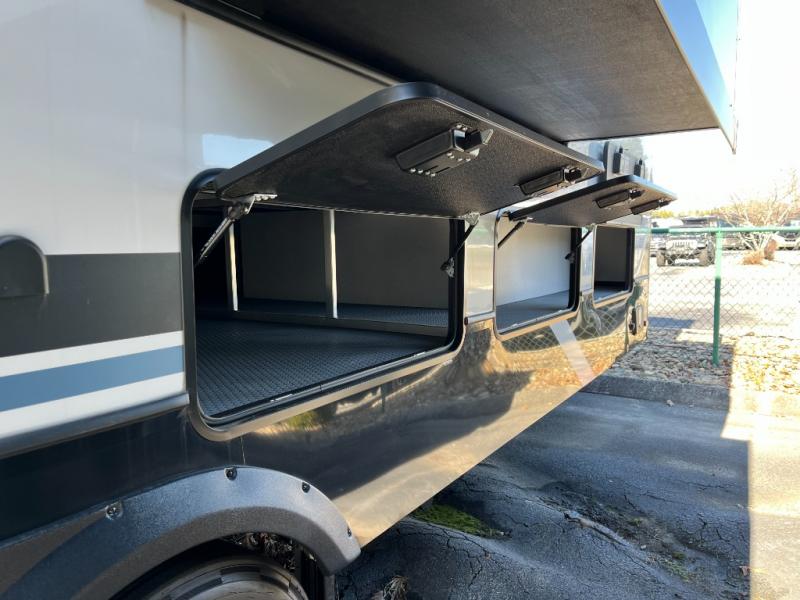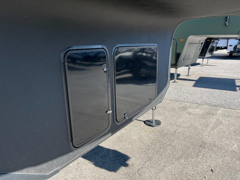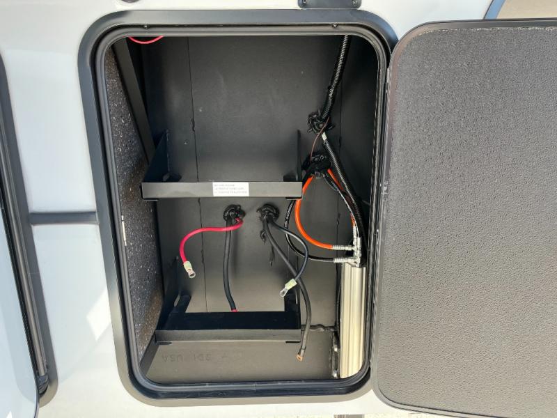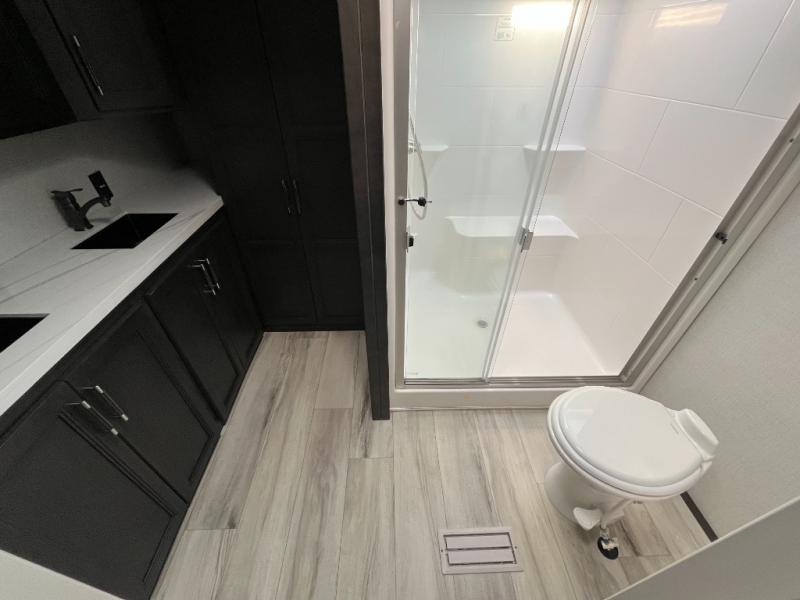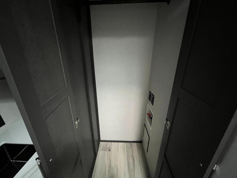 This fifth wheel is decked out in luxuries! The full rear bathroom has a walk-in shower to freshen up in each morning, a dual sink vanity for two to get ready at once, plus washer and dryer prep. You will enjoy a good night's rest on the king bed slide inside the private bedroom and others can sleep on the opposing tri-fold sofa sleeper slides in the living room. There is also a theater seating here, along with a fireplace and 50" LED TV for movie nights. The front kitchen is where it's really at in this fifth wheel; ample counter space, a bar top with stools, pull-out drawers, plus a pantry and closet for even more storage!