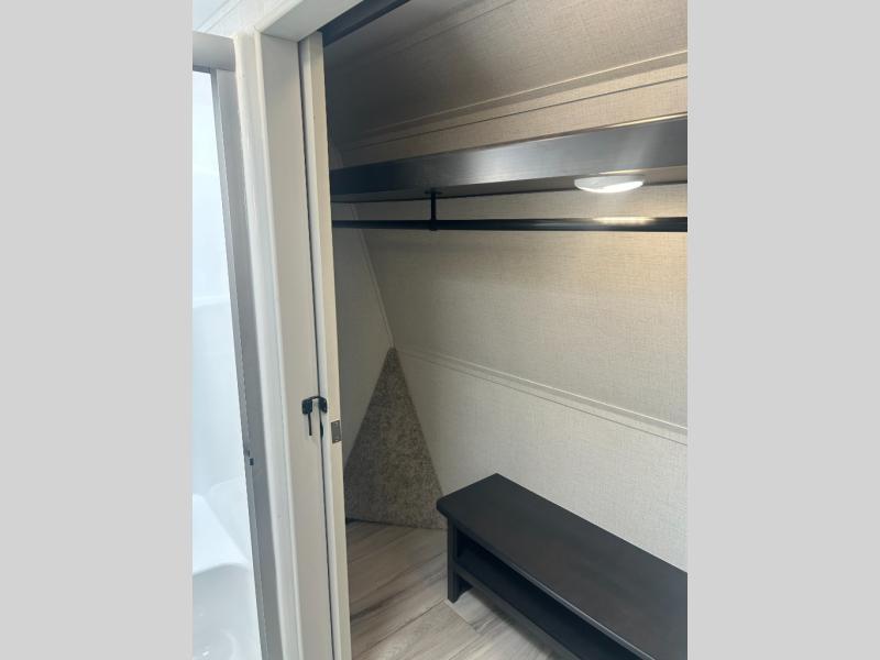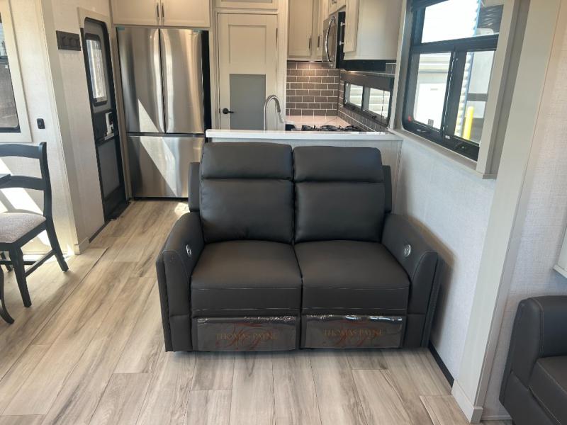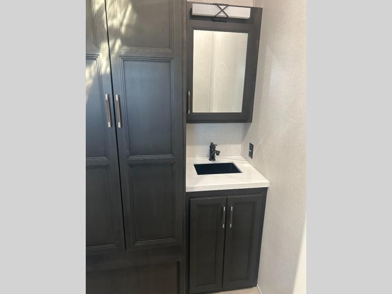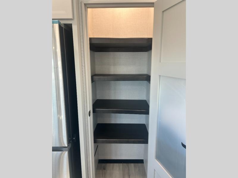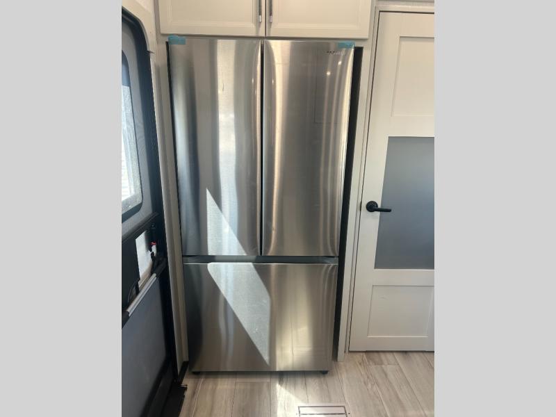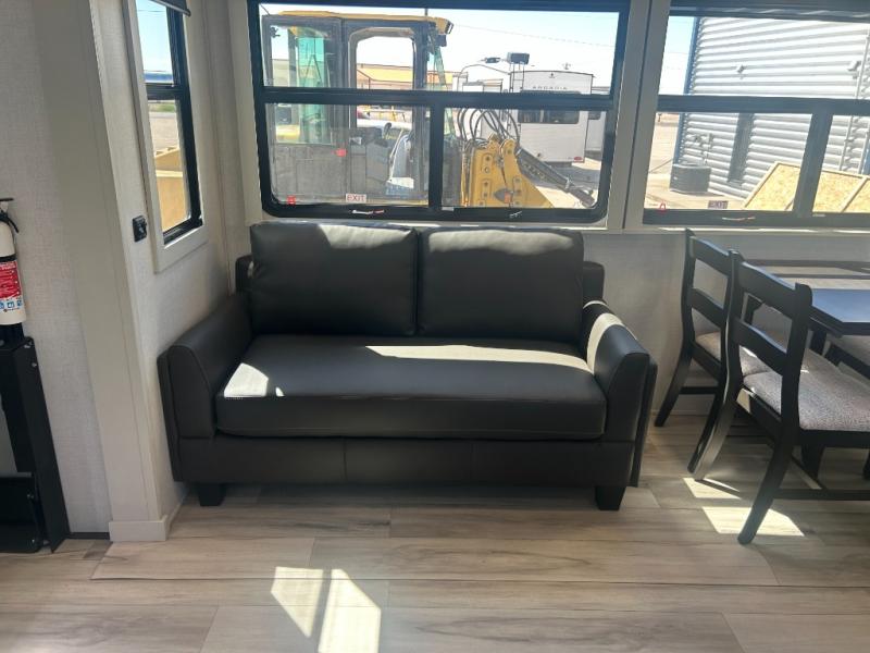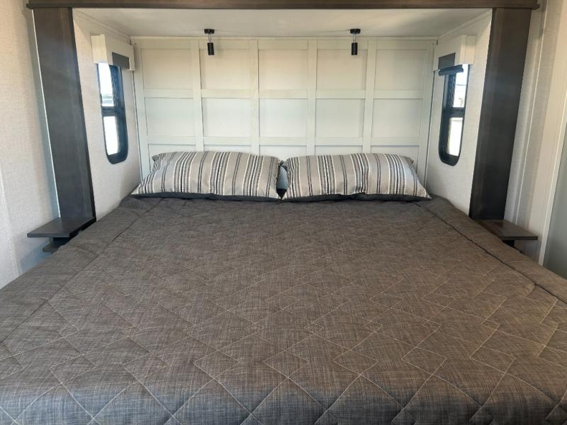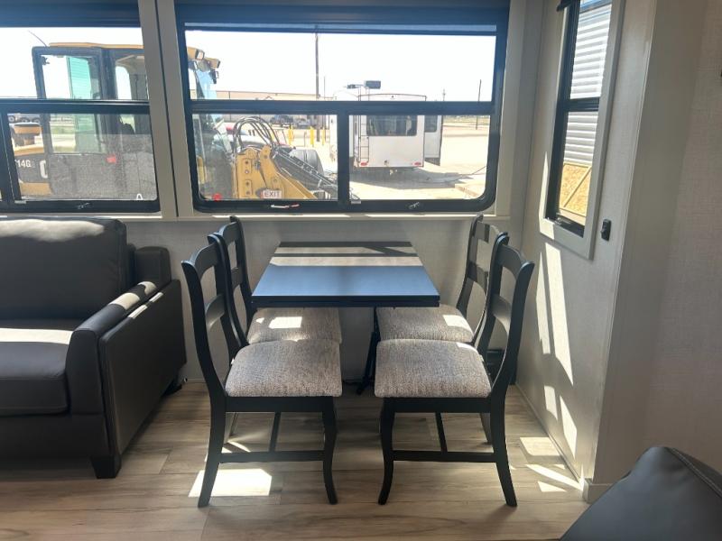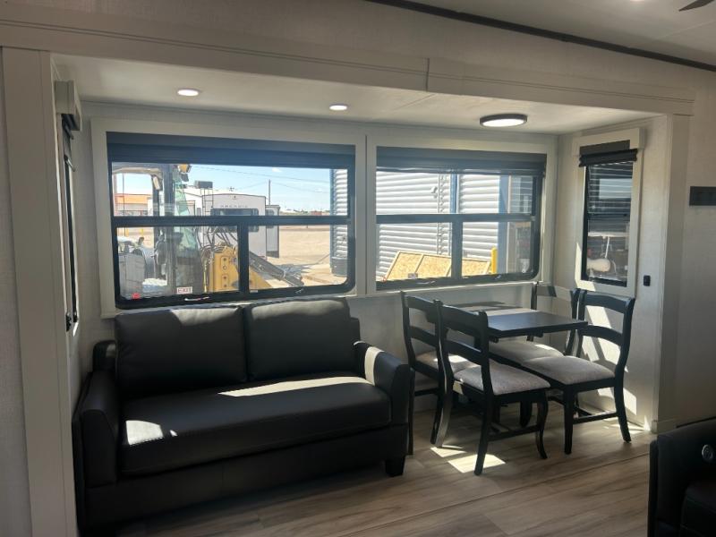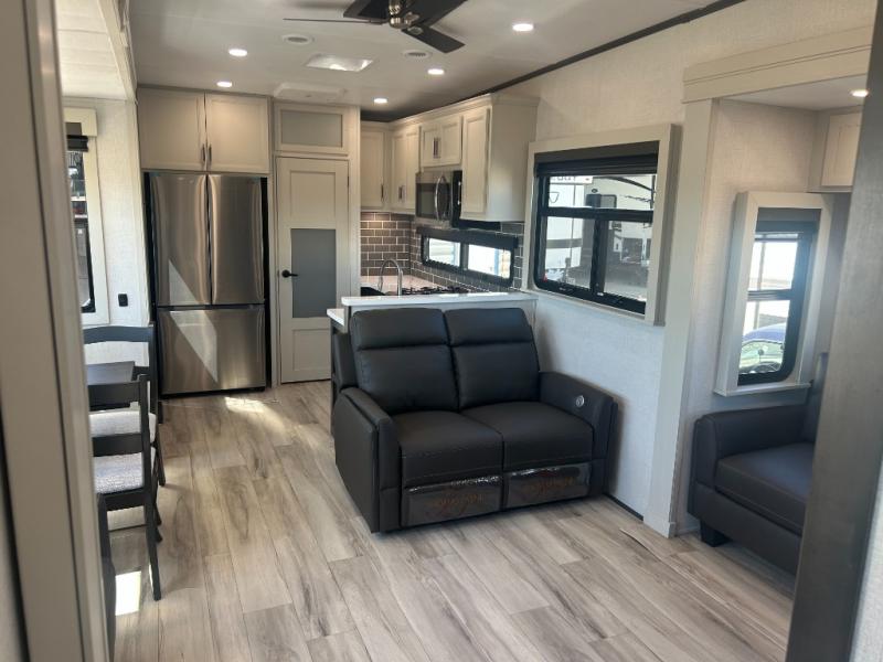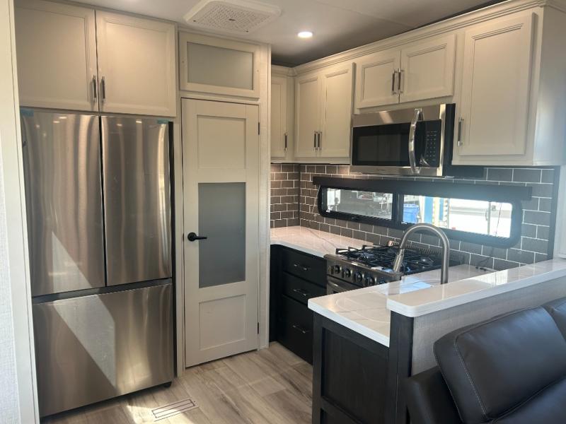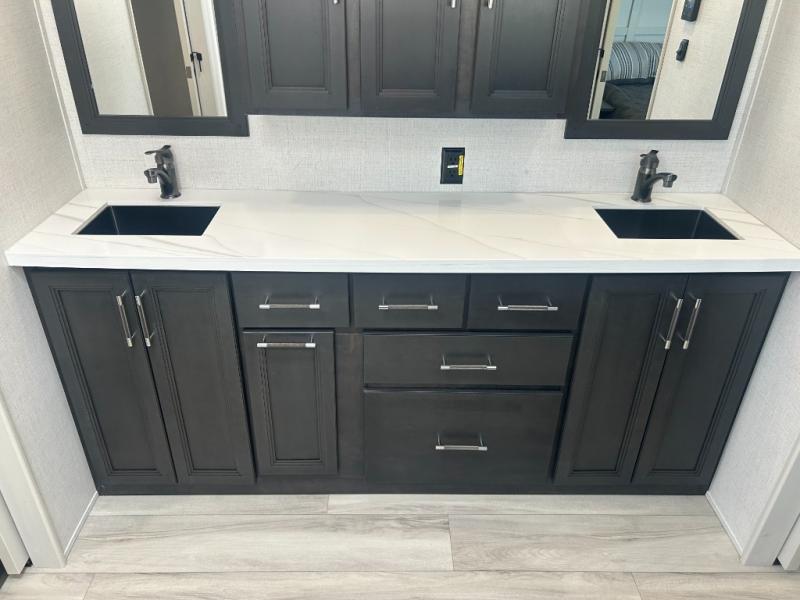 With a bath and a half, it's a clean decision to take this fifth wheel with you on your next camping trip! One of the dual entry doors leads directly into the rear kitchen which has a large pantry and an 18 cu. ft. residential refrigerator to store your food items. The free standing dinette and tri-fold sofa sleeper slide and opposing tri-fold sofa sleeper slide opens up the middle living area for more interior space. The half bathroom is conveniently located straight in through the main entry and features washer and dryer prep for clean clothes throughout your entire trip. The master suite not only has a king bed slide with storage underneath and a bench next to a dresser, but also access into the front full bathroom which has a dual sink vanity, a shower with a seat, and a toilet with privacy walls!