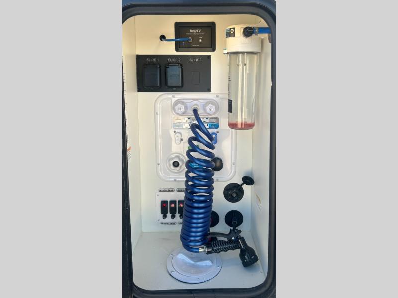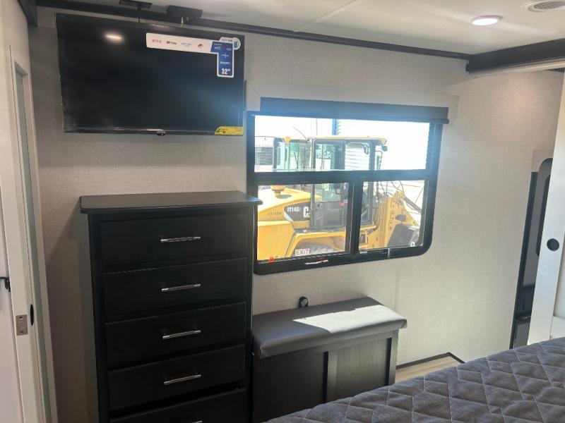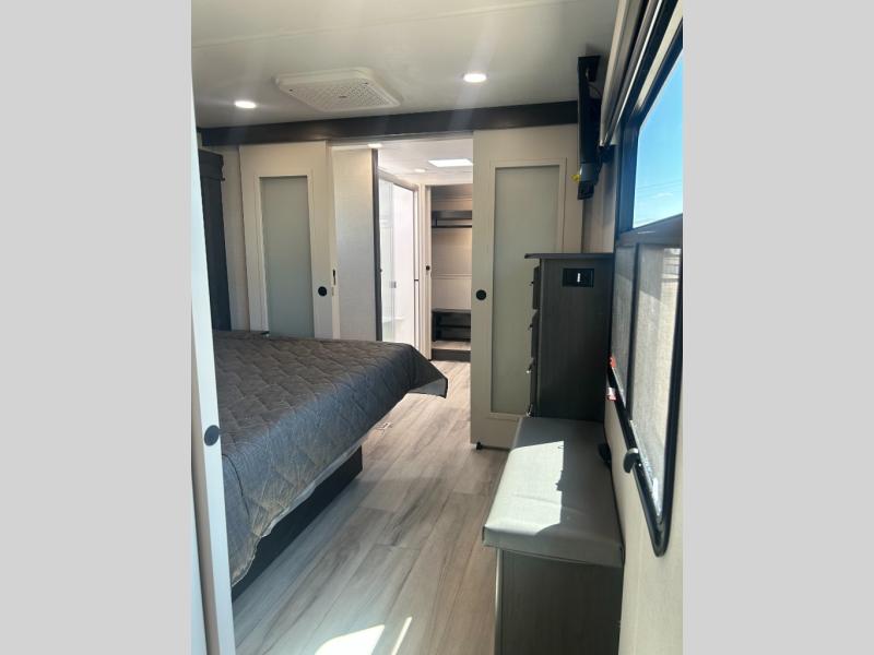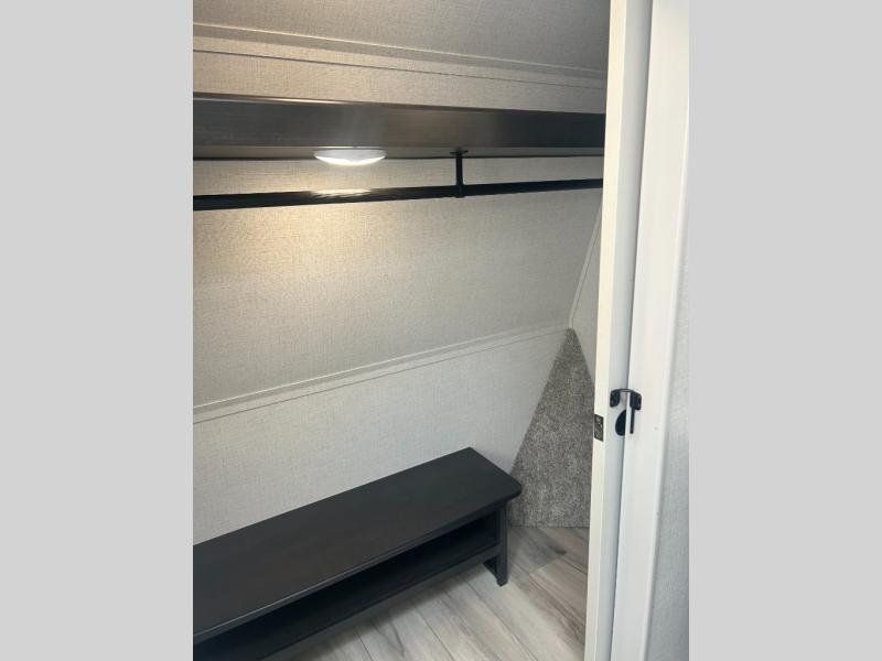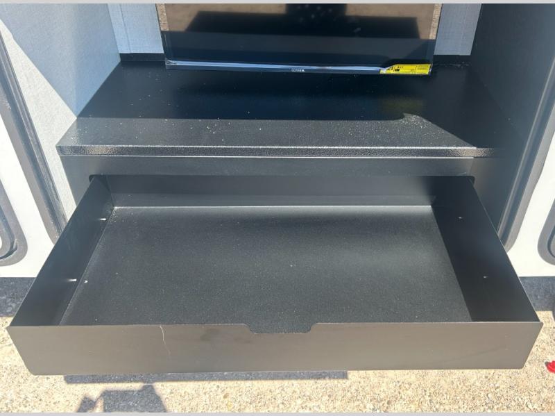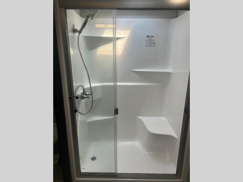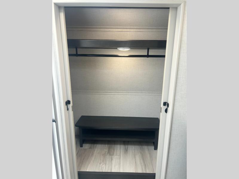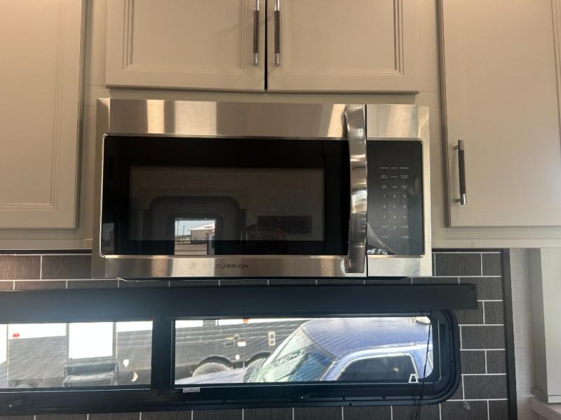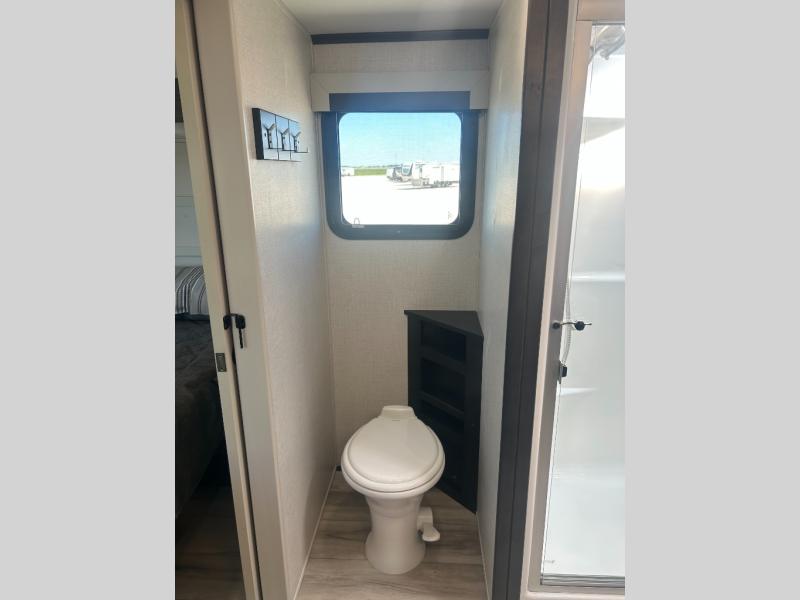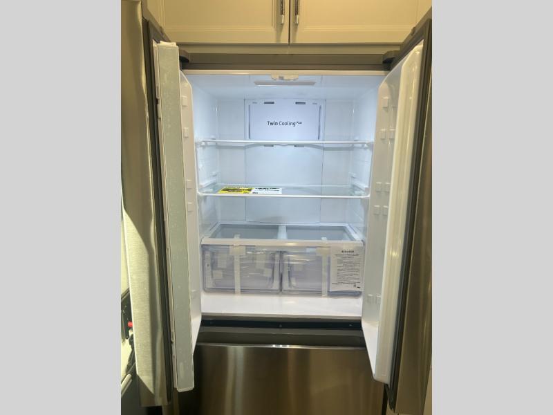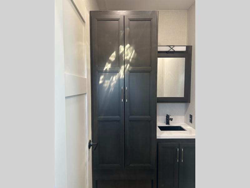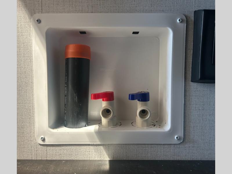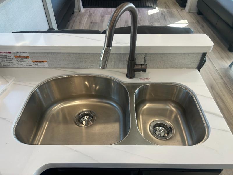 With a bath and a half, it's a clean decision to take this fifth wheel with you on your next camping trip! One of the dual entry doors leads directly into the rear kitchen which has a large pantry and an 18 cu. ft. residential refrigerator to store your food items. The free standing dinette and tri-fold sofa sleeper slide and opposing tri-fold sofa sleeper slide opens up the middle living area for more interior space. The half bathroom is conveniently located straight in through the main entry and features washer and dryer prep for clean clothes throughout your entire trip. The master suite not only has a king bed slide with storage underneath and a bench next to a dresser, but also access into the front full bathroom which has a dual sink vanity, a shower with a seat, and a toilet with privacy walls!