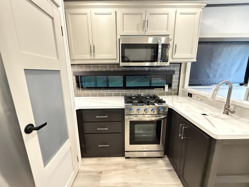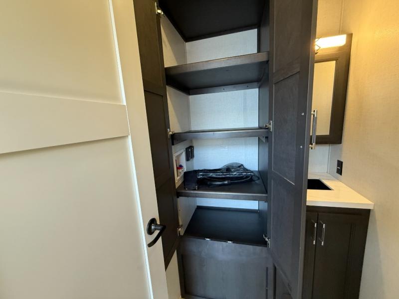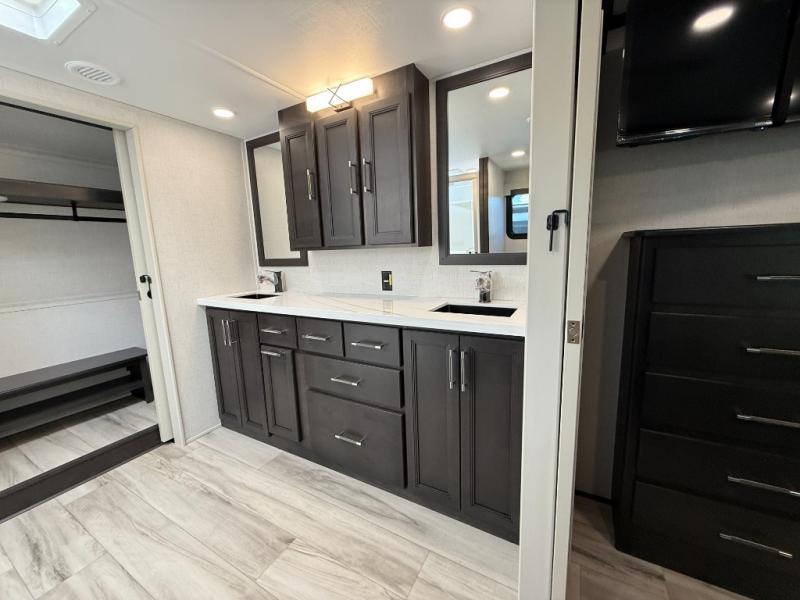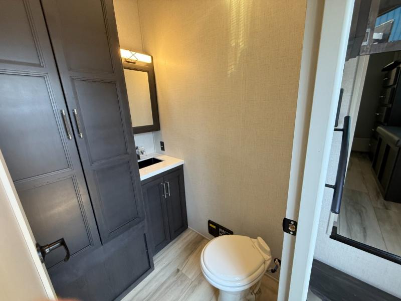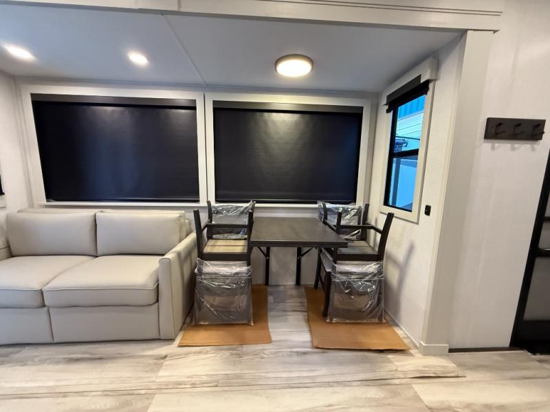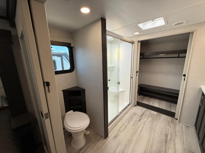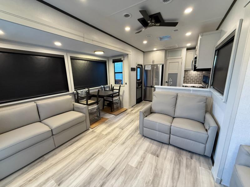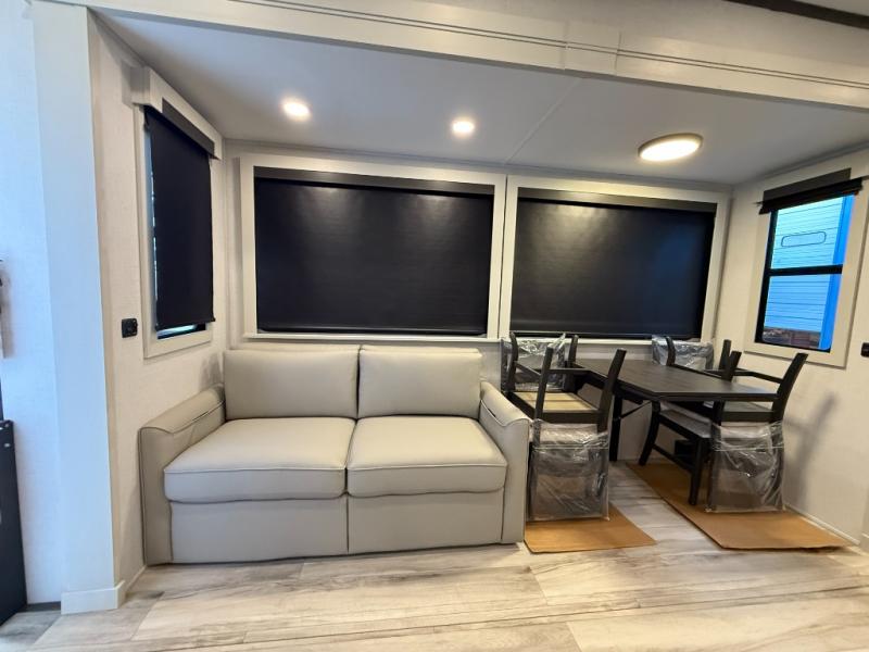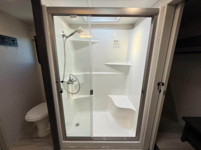 With a bath and a half, it's a clean decision to take this fifth wheel with you on your next camping trip! One of the dual entry doors leads directly into the rear kitchen which has a large pantry and an 18 cu. ft. residential refrigerator to store your food items. The free standing dinette and tri-fold sofa sleeper slide and opposing tri-fold sofa sleeper slide opens up the middle living area for more interior space. The half bathroom is conveniently located straight in through the main entry and features washer and dryer prep for clean clothes throughout your entire trip. The master suite not only has a king bed slide with storage underneath and a bench next to a dresser, but also access into the front full bathroom which has a dual sink vanity, a shower with a seat, and a toilet with privacy walls!