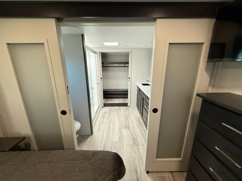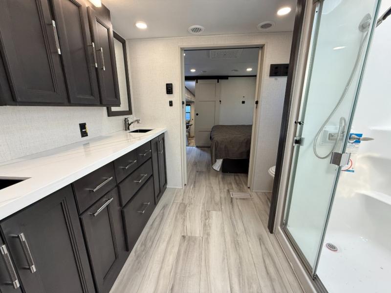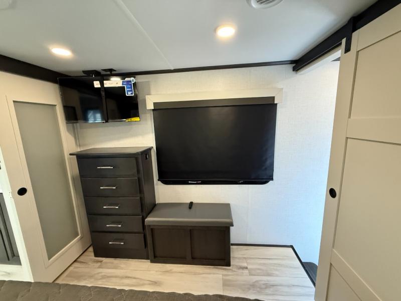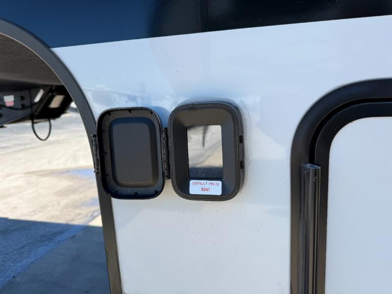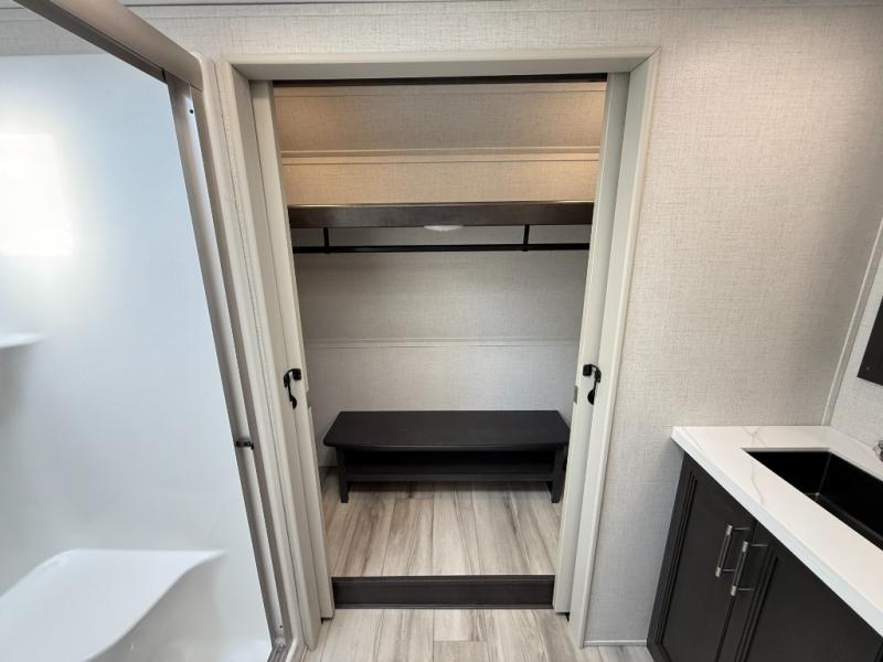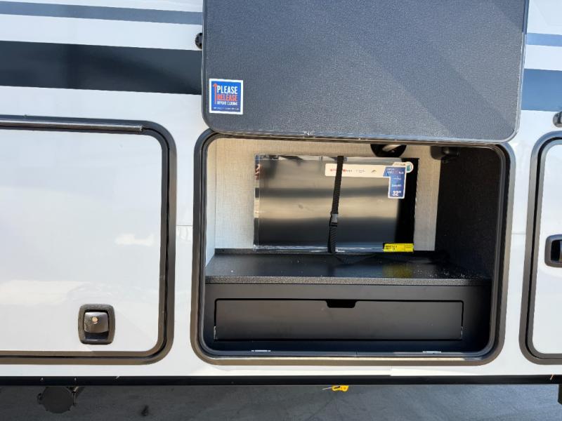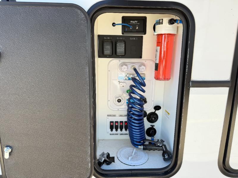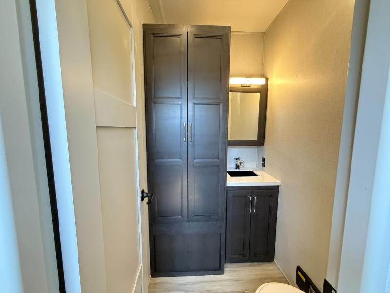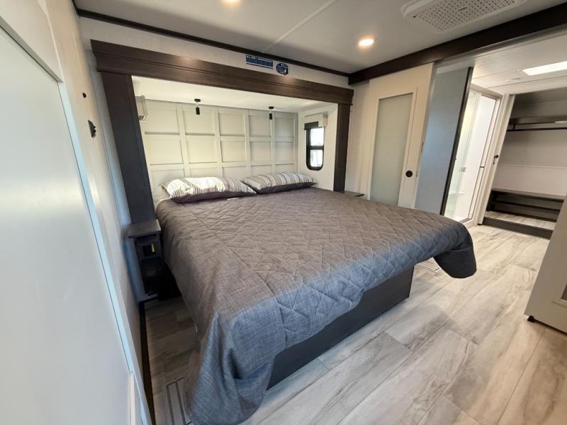 With a bath and a half, it's a clean decision to take this fifth wheel with you on your next camping trip! One of the dual entry doors leads directly into the rear kitchen which has a large pantry and an 18 cu. ft. residential refrigerator to store your food items. The free standing dinette and tri-fold sofa sleeper slide and opposing tri-fold sofa sleeper slide opens up the middle living area for more interior space. The half bathroom is conveniently located straight in through the main entry and features washer and dryer prep for clean clothes throughout your entire trip. The master suite not only has a king bed slide with storage underneath and a bench next to a dresser, but also access into the front full bathroom which has a dual sink vanity, a shower with a seat, and a toilet with privacy walls!