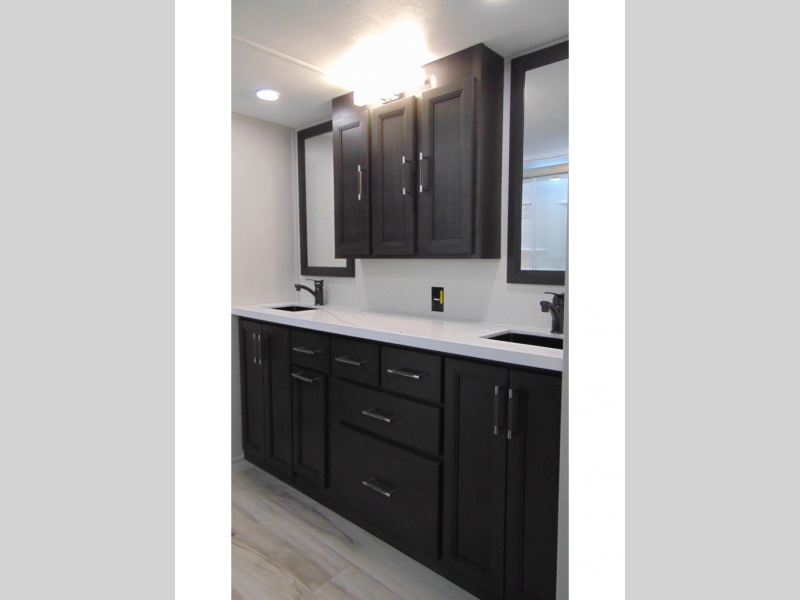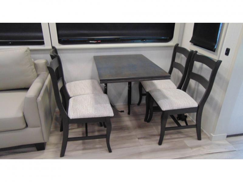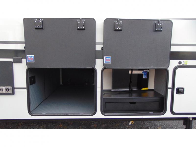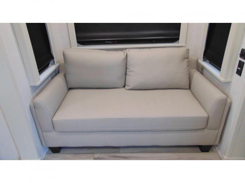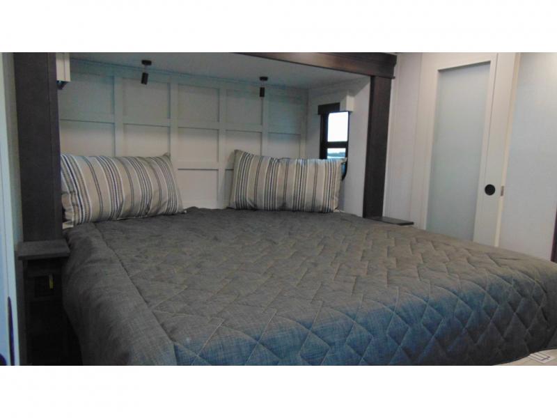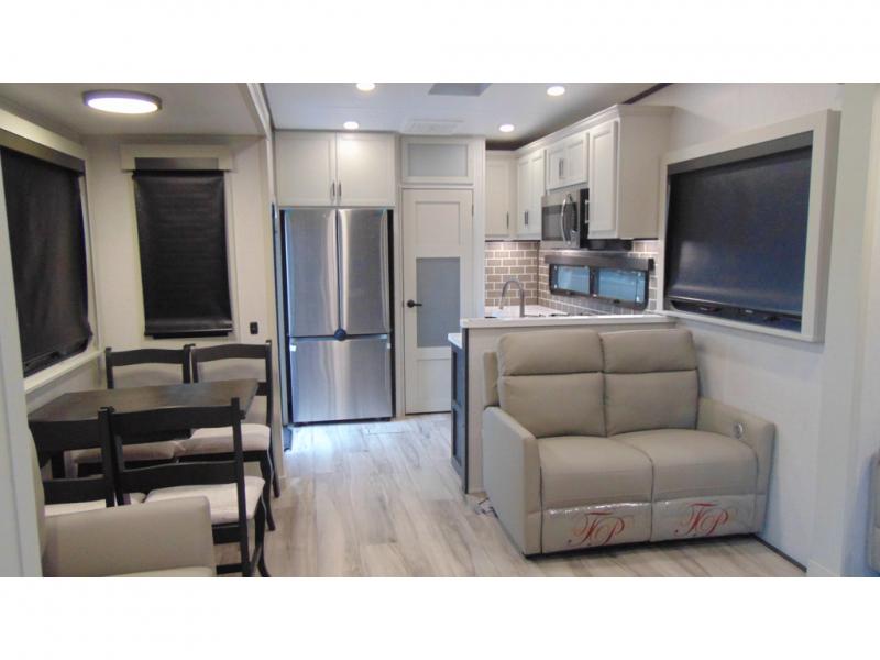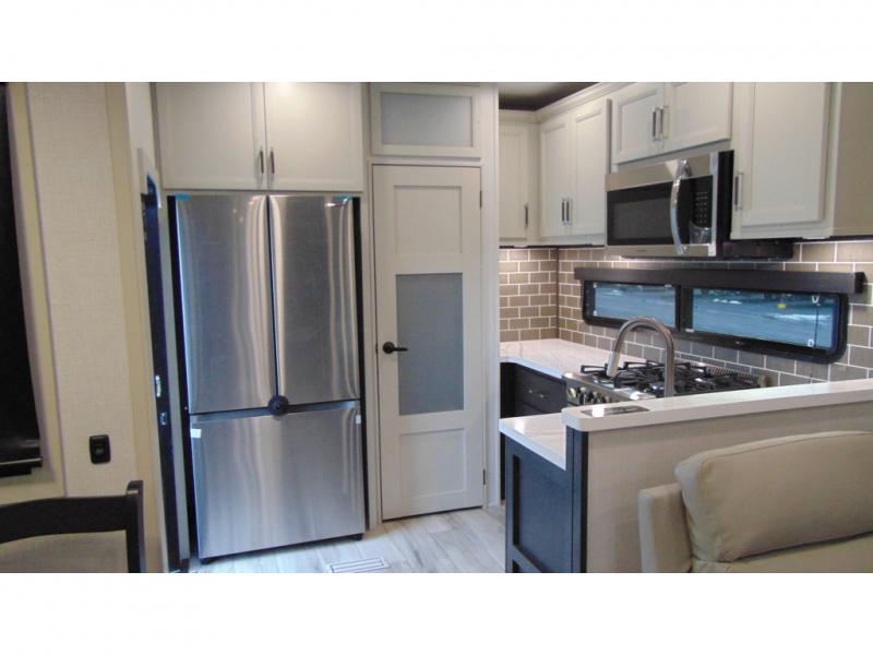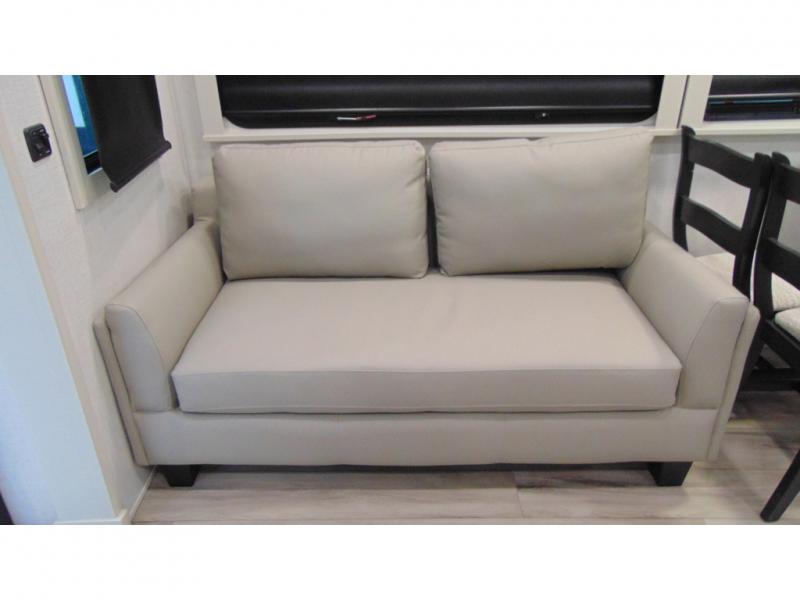 With a bath and a half, it's a clean decision to take this fifth wheel with you on your next camping trip! One of the dual entry doors leads directly into the rear kitchen which has a large pantry and an 18 cu. ft. residential refrigerator to store your food items. The free standing dinette and tri-fold sofa sleeper slide and opposing tri-fold sofa sleeper slide opens up the middle living area for more interior space. The half bathroom is conveniently located straight in through the main entry and features washer and dryer prep for clean clothes throughout your entire trip. The master suite not only has a king bed slide with storage underneath and a bench next to a dresser, but also access into the front full bathroom which has a dual sink vanity, a shower with a seat, and a toilet with privacy walls!