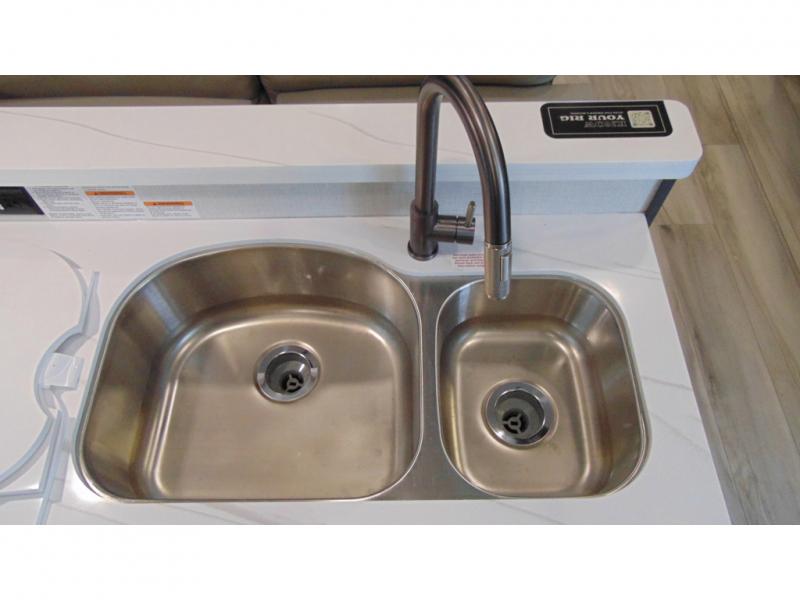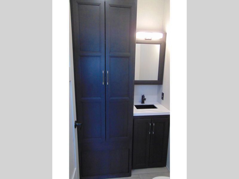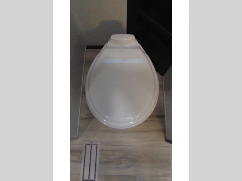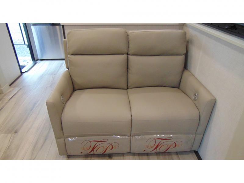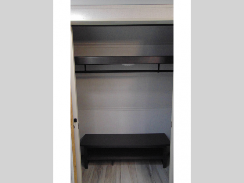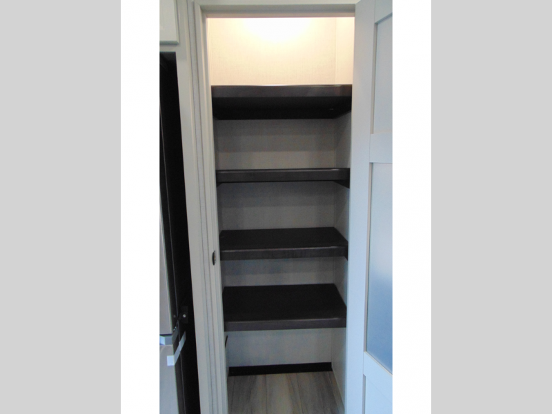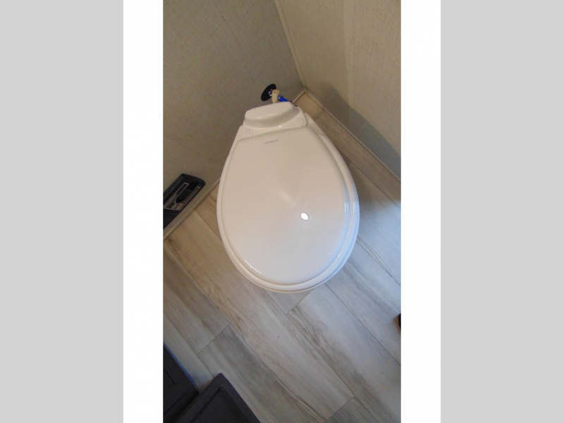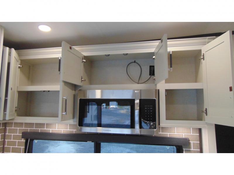 With a bath and a half, it's a clean decision to take this fifth wheel with you on your next camping trip! One of the dual entry doors leads directly into the rear kitchen which has a large pantry and an 18 cu. ft. residential refrigerator to store your food items. The free standing dinette and tri-fold sofa sleeper slide and opposing tri-fold sofa sleeper slide opens up the middle living area for more interior space. The half bathroom is conveniently located straight in through the main entry and features washer and dryer prep for clean clothes throughout your entire trip. The master suite not only has a king bed slide with storage underneath and a bench next to a dresser, but also access into the front full bathroom which has a dual sink vanity, a shower with a seat, and a toilet with privacy walls!