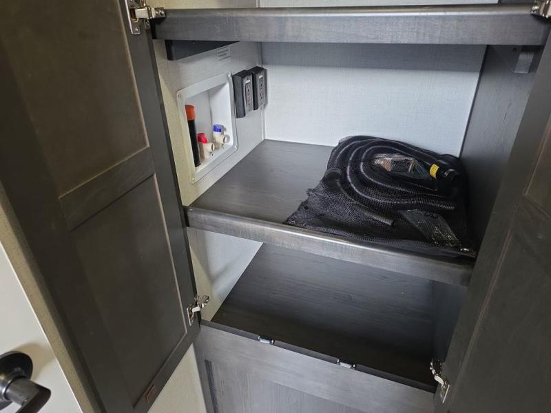 With a bath and a half, it's a clean decision to take this fifth wheel with you on your next camping trip! One of the dual entry doors leads directly into the rear kitchen which has a large pantry and an 18 cu. ft. residential refrigerator to store your food items. The free standing dinette and tri-fold sofa sleeper slide and opposing tri-fold sofa sleeper slide opens up the middle living area for more interior space. The half bathroom is conveniently located straight in through the main entry and features washer and dryer prep for clean clothes throughout your entire trip. The master suite not only has a king bed slide with storage underneath and a bench next to a dresser, but also access into the front full bathroom which has a dual sink vanity, a shower with a seat, and a toilet with privacy walls!