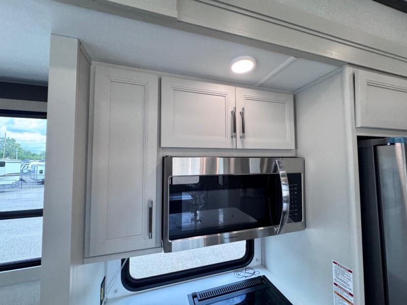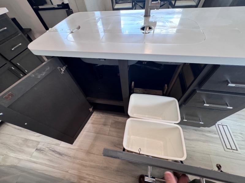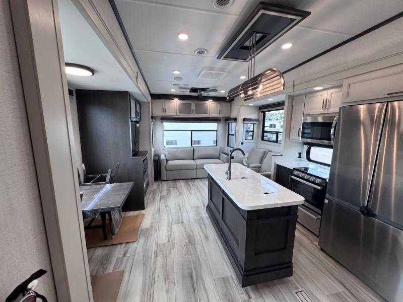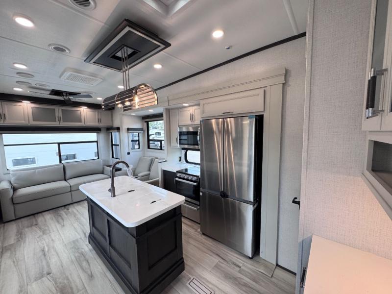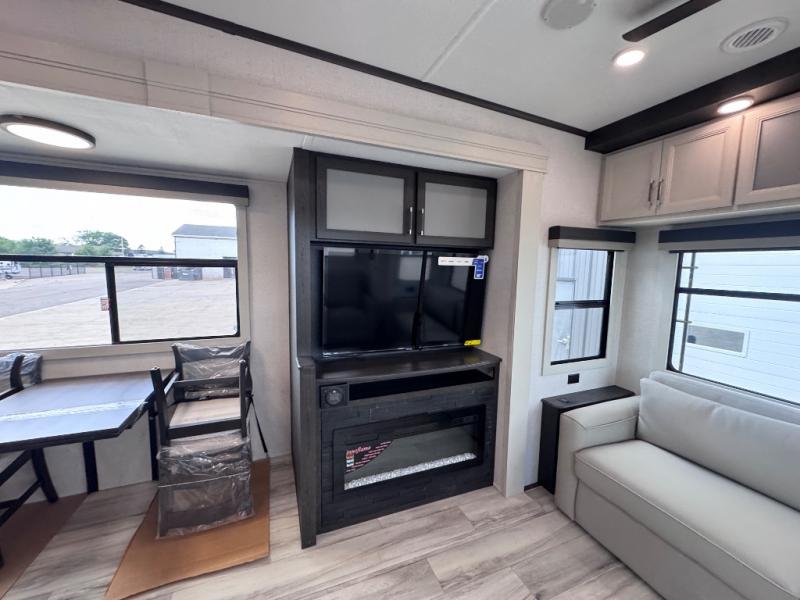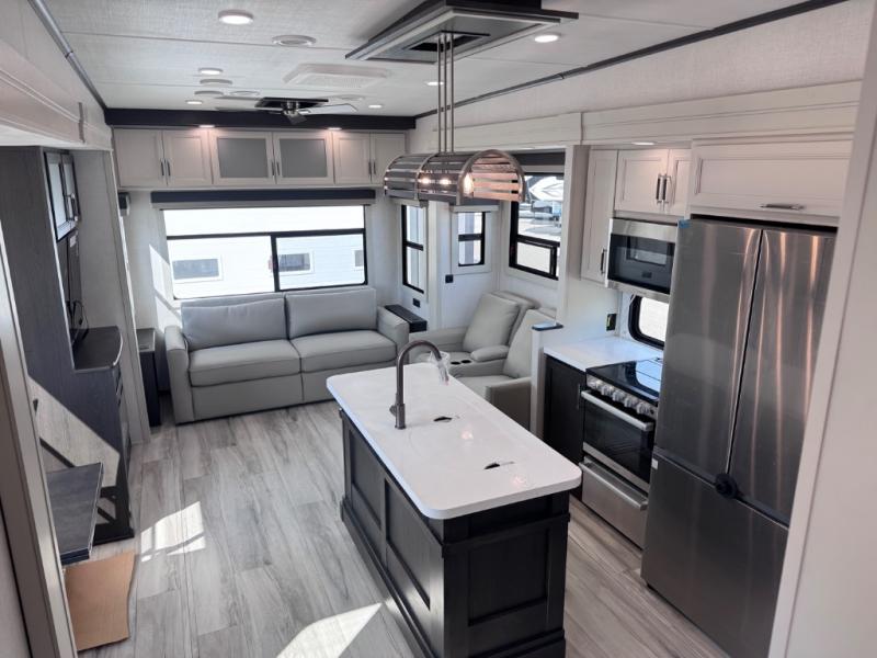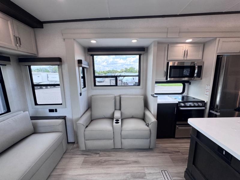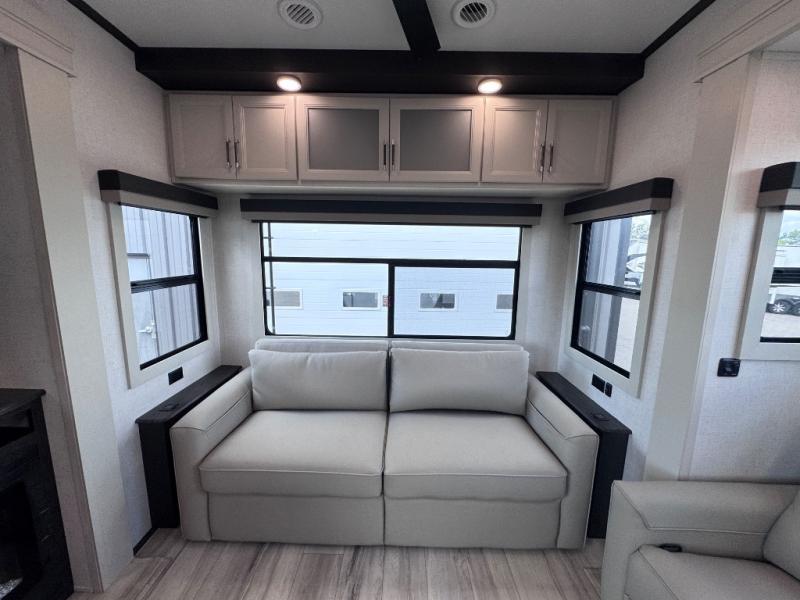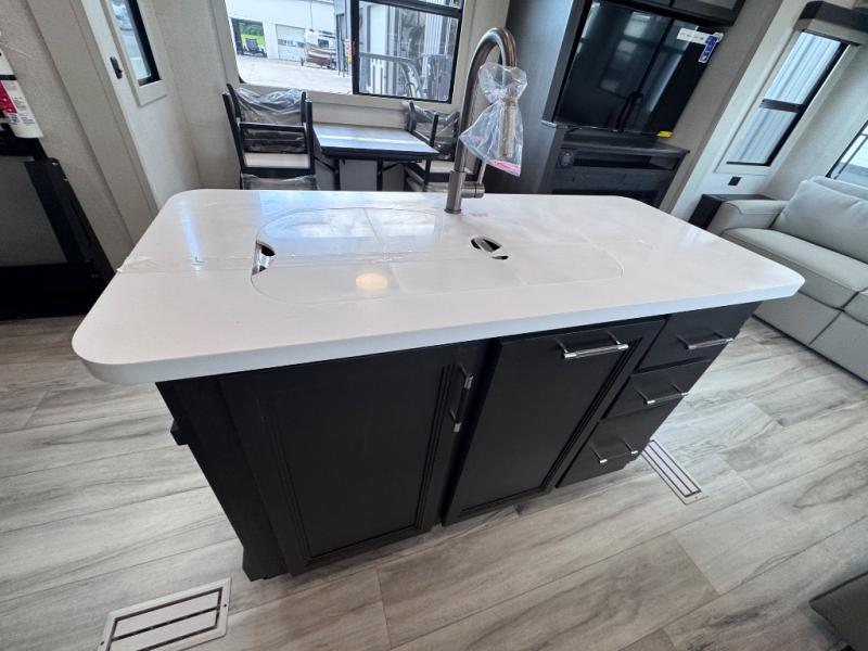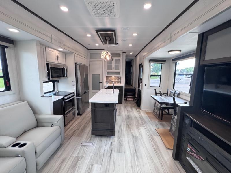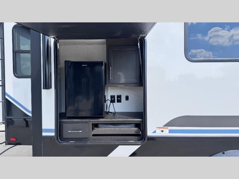 For the couple that enjoys entertaining, this fifth wheel is sure to catch your eye! Triple slides open up the interior to create an inviting place to call home while on the road. You will enjoy entertaining friends in the RV park, or even friends that come and stay a night or two since you have a hide-a-bed sofa sleeper for two! Theater seating opposite the entertainment center with 50" LED TV and fireplace makes it a cozy evening inside. The kitchen island with prep space and double sink makes it easy to be part of the conversation when prepping dinner with your guests, and you will love the refrigerator to keep your perishables fresh, along with a curio cabinet for storage and a pantry for your dry goods and snacks. You can even cook outside under the 11' Carefree awning protected from the elements at the Grill-N-Chill outside kitchen. Back inside and up the steps, you will find a front private bedroom and bath with dual entry. A king bed slide with storage beneath offers ample room for sleeping and a place to store extra blankets and things when not in use.