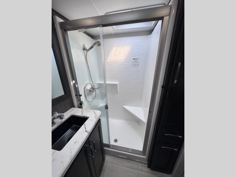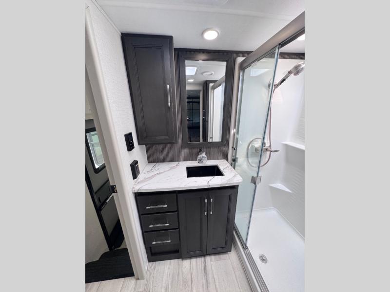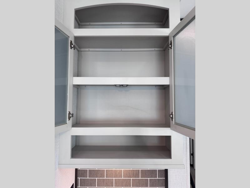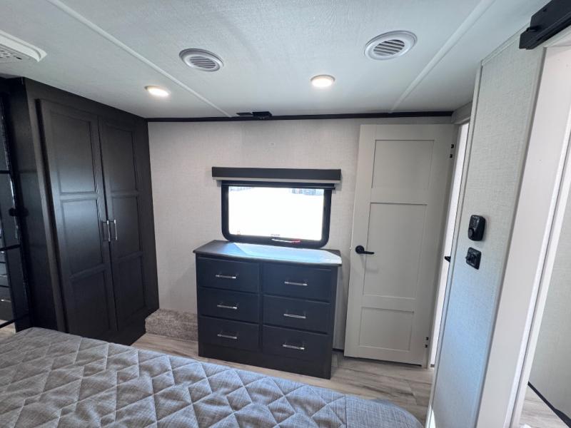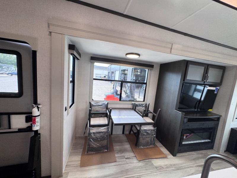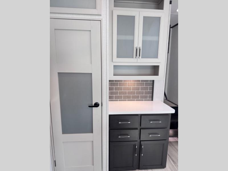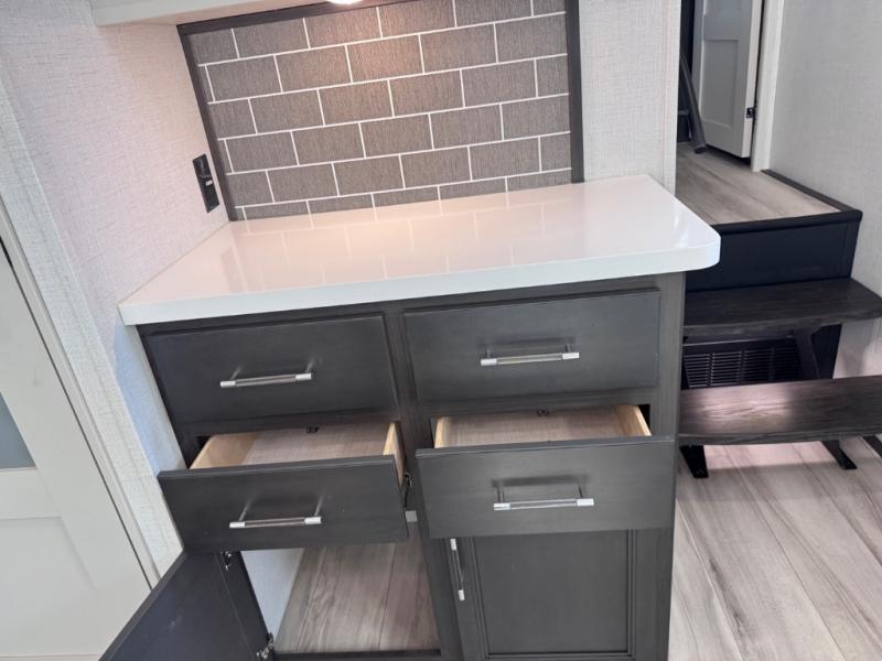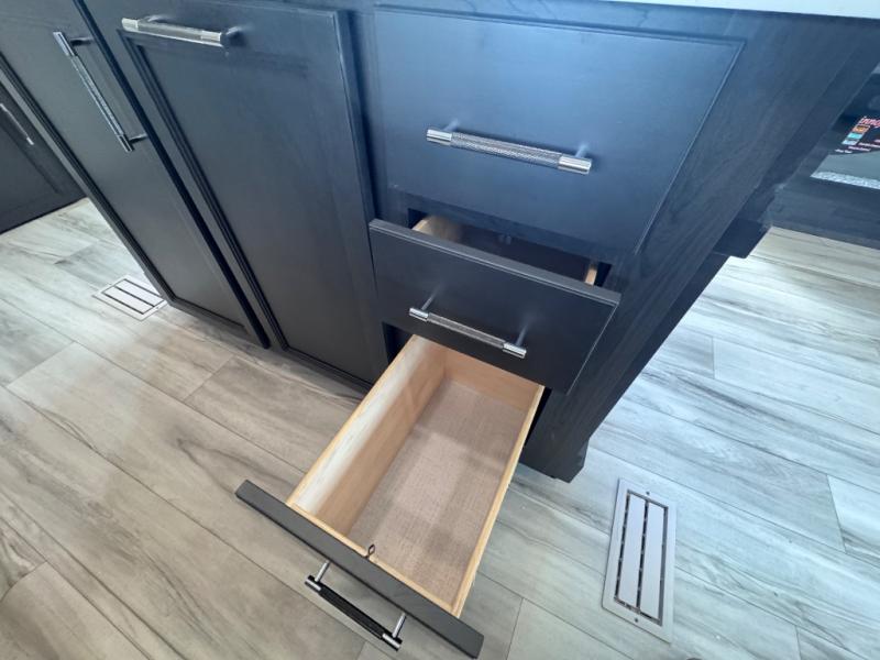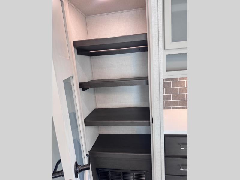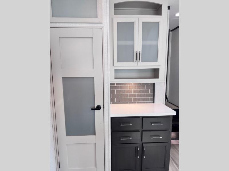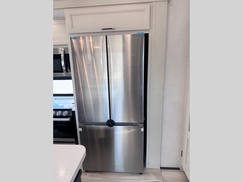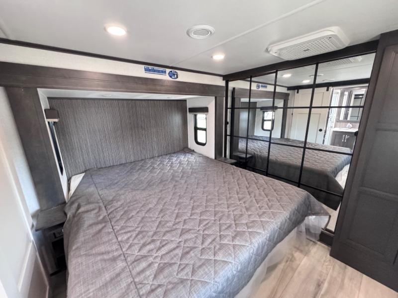 For the couple that enjoys entertaining, this fifth wheel is sure to catch your eye! Triple slides open up the interior to create an inviting place to call home while on the road. You will enjoy entertaining friends in the RV park, or even friends that come and stay a night or two since you have a hide-a-bed sofa sleeper for two! Theater seating opposite the entertainment center with 50" LED TV and fireplace makes it a cozy evening inside. The kitchen island with prep space and double sink makes it easy to be part of the conversation when prepping dinner with your guests, and you will love the refrigerator to keep your perishables fresh, along with a curio cabinet for storage and a pantry for your dry goods and snacks. You can even cook outside under the 11' Carefree awning protected from the elements at the Grill-N-Chill outside kitchen. Back inside and up the steps, you will find a front private bedroom and bath with dual entry. A king bed slide with storage beneath offers ample room for sleeping and a place to store extra blankets and things when not in use.