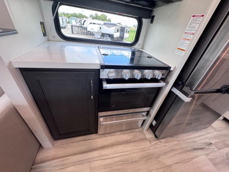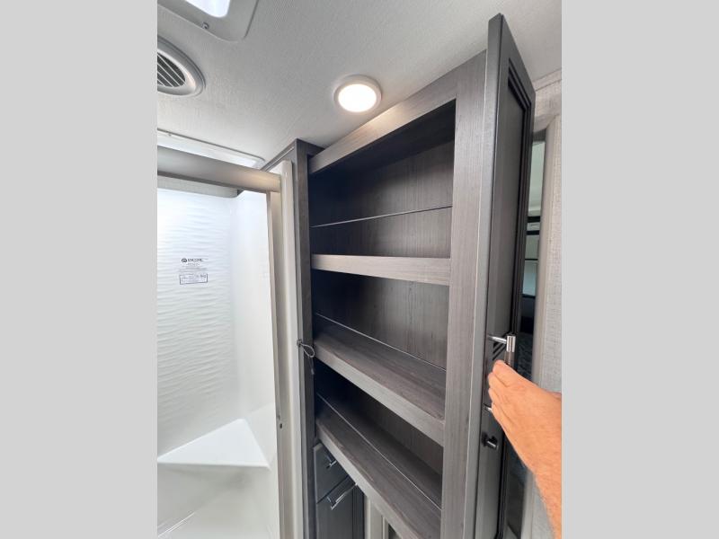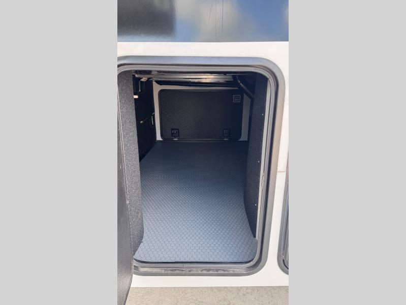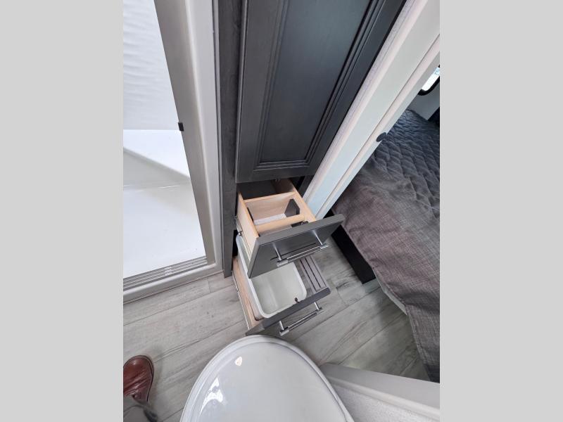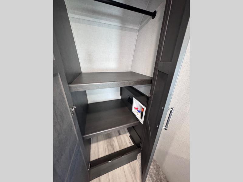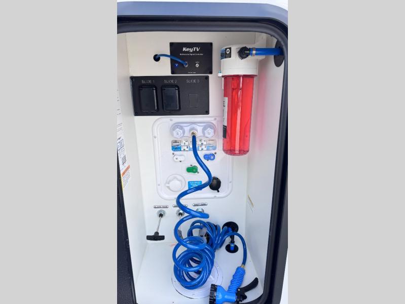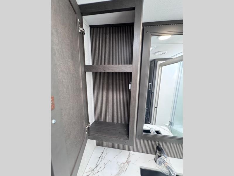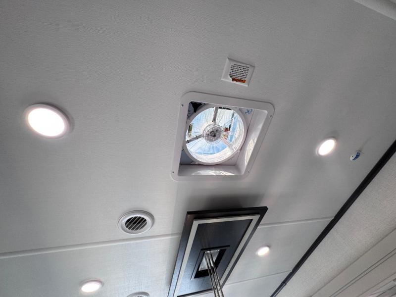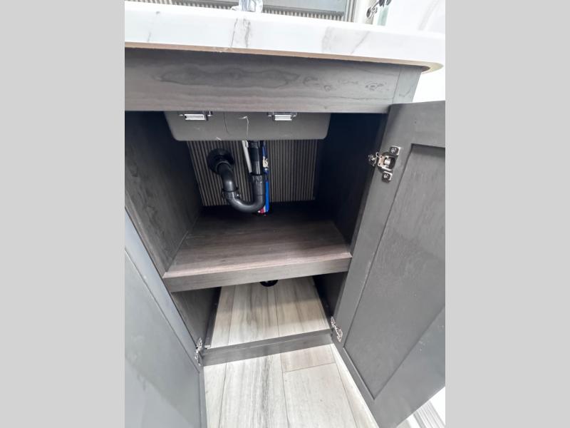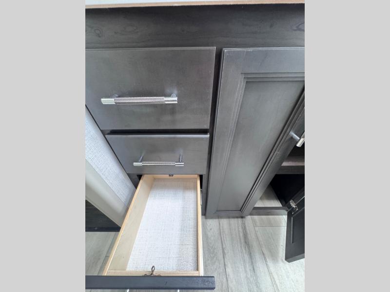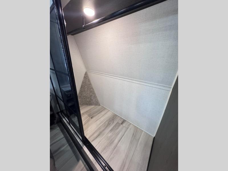 For the couple that enjoys entertaining, this fifth wheel is sure to catch your eye! Triple slides open up the interior to create an inviting place to call home while on the road. You will enjoy entertaining friends in the RV park, or even friends that come and stay a night or two since you have a hide-a-bed sofa sleeper for two! Theater seating opposite the entertainment center with 50" LED TV and fireplace makes it a cozy evening inside. The kitchen island with prep space and double sink makes it easy to be part of the conversation when prepping dinner with your guests, and you will love the refrigerator to keep your perishables fresh, along with a curio cabinet for storage and a pantry for your dry goods and snacks. You can even cook outside under the 11' Carefree awning protected from the elements at the Grill-N-Chill outside kitchen. Back inside and up the steps, you will find a front private bedroom and bath with dual entry. A king bed slide with storage beneath offers ample room for sleeping and a place to store extra blankets and things when not in use.