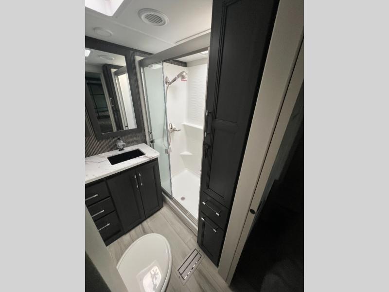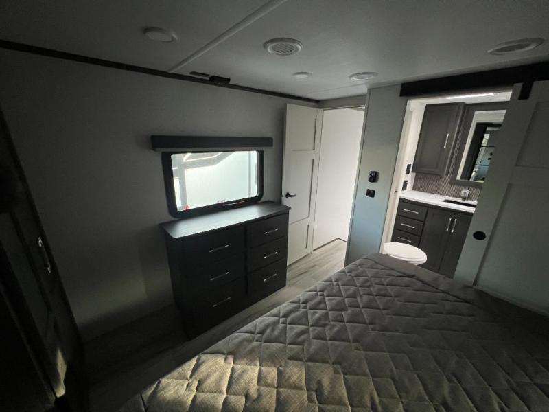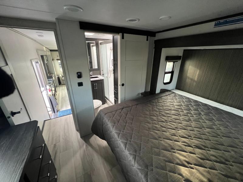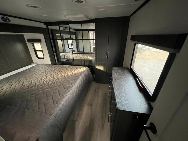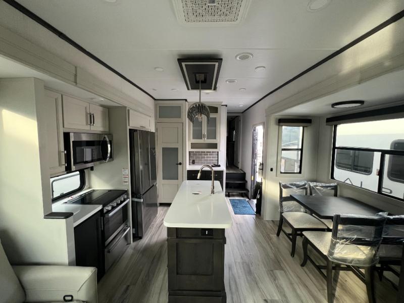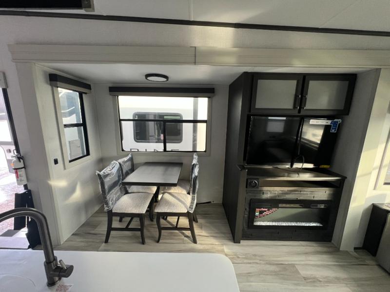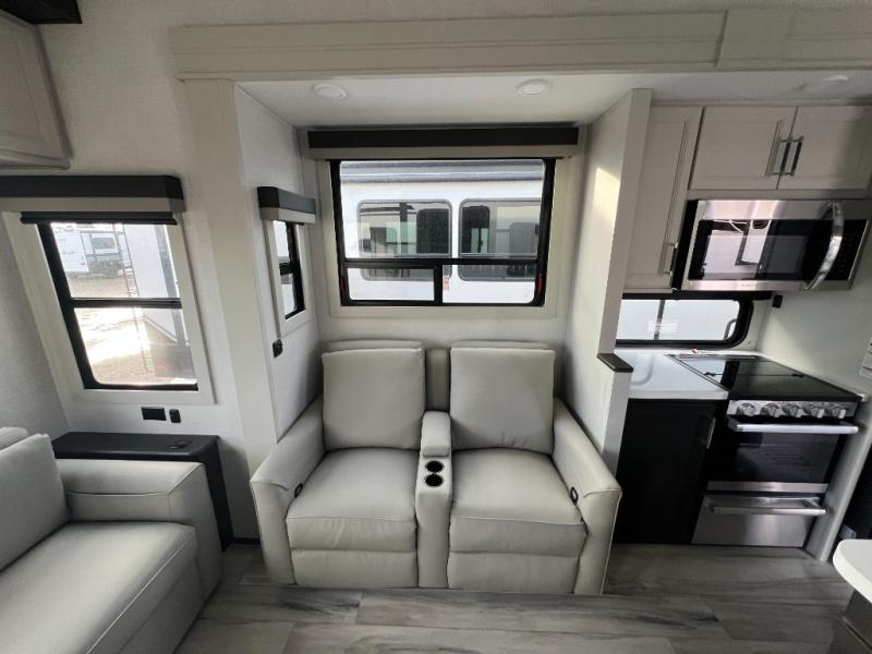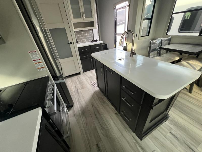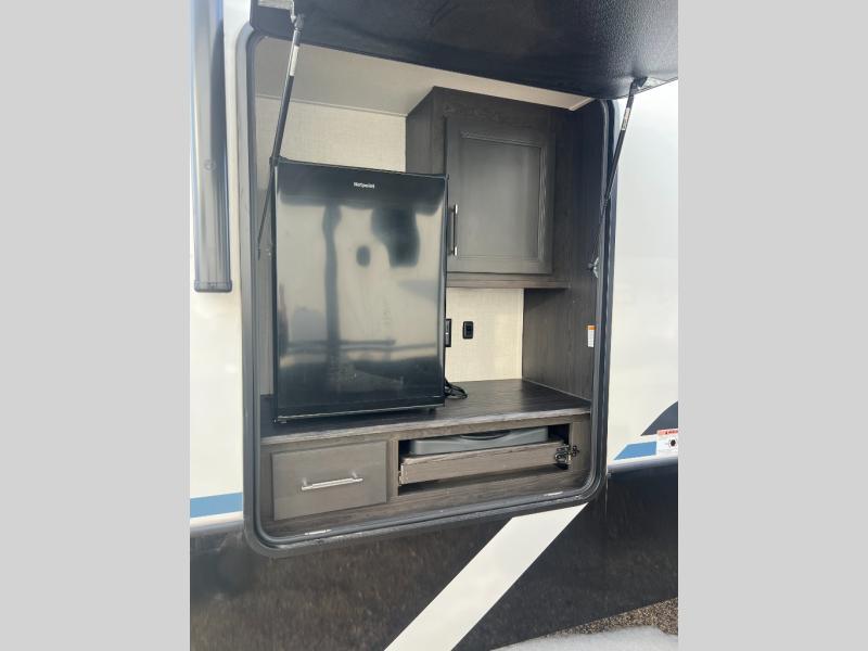For the couple that enjoys entertaining, this fifth wheel is sure to catch your eye! Triple slides open up the interior to create an inviting place to call home while on the road. You will enjoy entertaining friends in the RV park, or even friends that come and stay a night or two since you have a hide-a-bed sofa sleeper for two! Theater seating opposite the entertainment center with 50" LED TV and fireplace makes it a cozy evening inside. The kitchen island with prep space and double sink makes it easy to be part of the conversation when prepping dinner with your guests, and you will love the refrigerator to keep your perishables fresh, along with a curio cabinet for storage and a pantry for your dry goods and snacks. You can even cook outside under the 11' Carefree awning protected from the elements at the Grill-N-Chill outside kitchen. Back inside and up the steps, you will find a front private bedroom and bath with dual entry. A king bed slide with storage beneath offers ample room for sleeping and a place to store extra blankets and things when not in use.