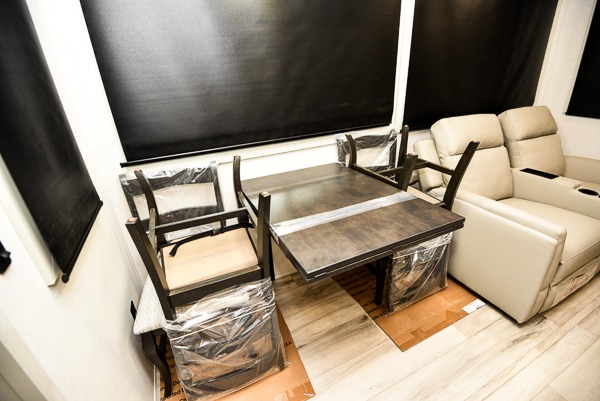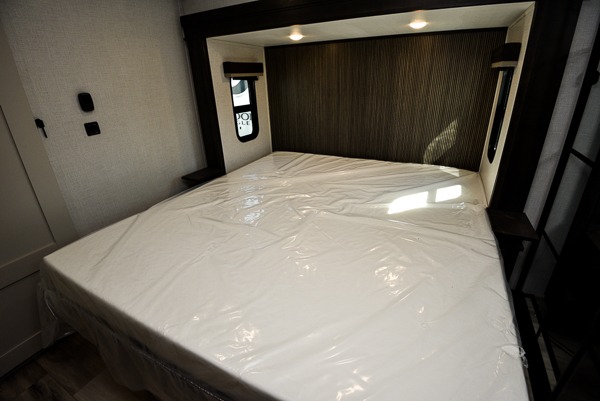 For the couple that loves to travel, you will truly enjoy this spacious fifth wheel featuring triple slides with dual opposing in the main combined kitchen and living area. Here you can entertain friends, even overnight, thanks to the hide-a-bed sofa sleeper. A free standing dinette and four chairs makes dining feel like home, and you will love the spacious kitchen for cooking with a large center island including prep space next to the double sink. A side hutch offers space for dishes, or place for other small appliances to be left out. The master bedroom is just beyond the spacious bath on your left up the steps and behind a space saving sliding barn style door. You will sleep comfortably on the king bed that slides out to provide even more floor space for getting dressed, and there is also a prepped area for adding a stackable washer and dryer if you choose. The bath provides a large shower and vanity with dual sinks so two can easily get ready at once!