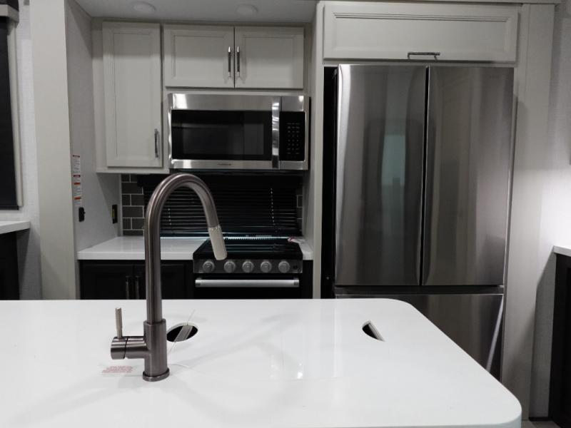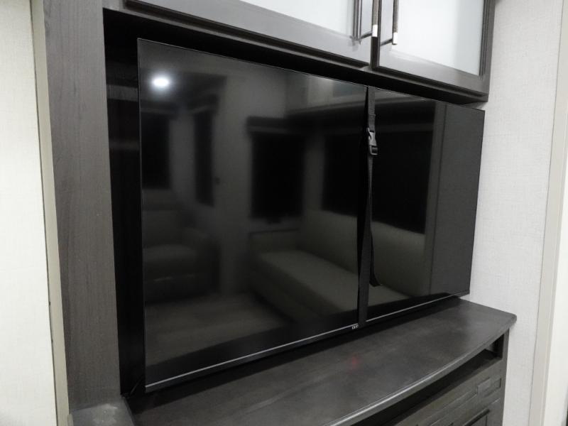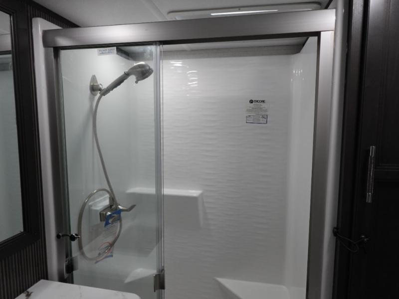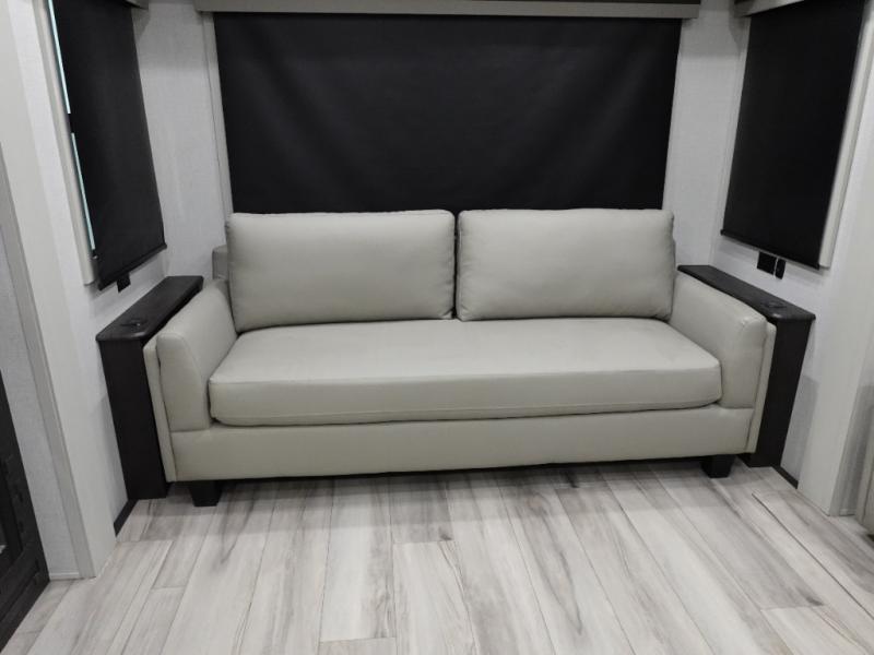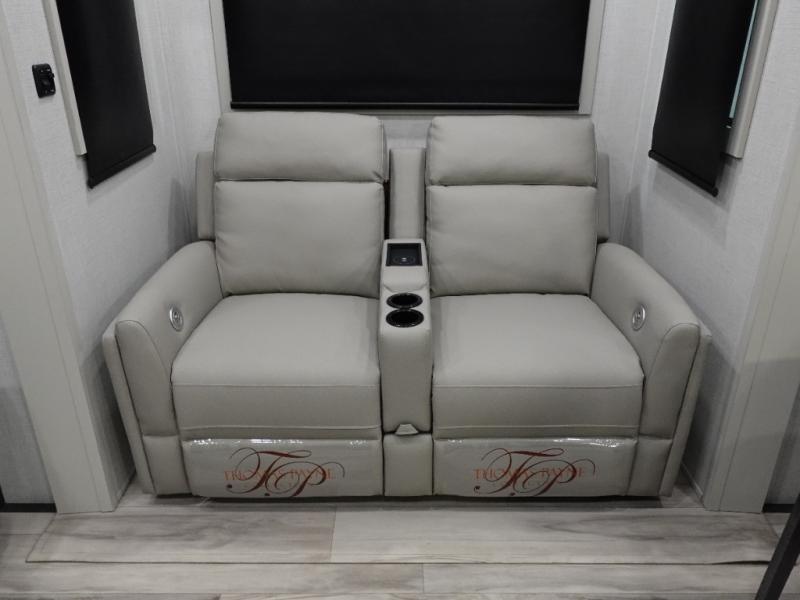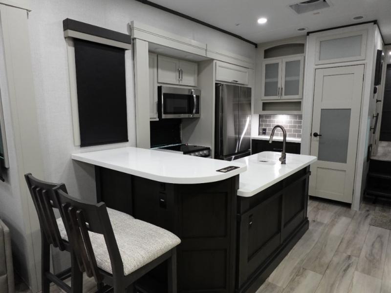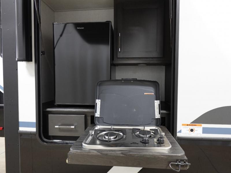 This grand kitchen offers the cook their own space to prepare and serve meals from the large L-shaped counter peninsula bar with stools, and the large pantry and curio will come in handy as well. Dining is also available at the free standing dinette with four chairs and some might even enjoy sitting on the hide-a-bed sofa sleeper. Also available for seating are the theater seats which are equipped with heat, massage, LED lights and USB charging. The master bedroom offers a king bed with storage underneath and additional wardrobe storage plus a space prepped for a washer/dryer option. Having a separate living area from the kitchen gives everyone room to spread out, and outside there are two power awnings offering additional outdoor living areas protected from the elements. The cook will enjoy the outside Grill-n-Chill outside kitchen as well.