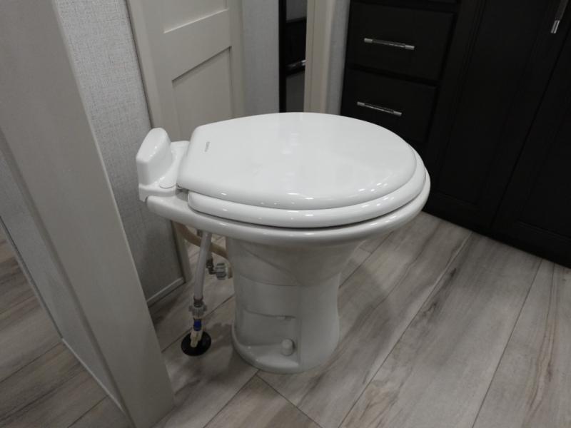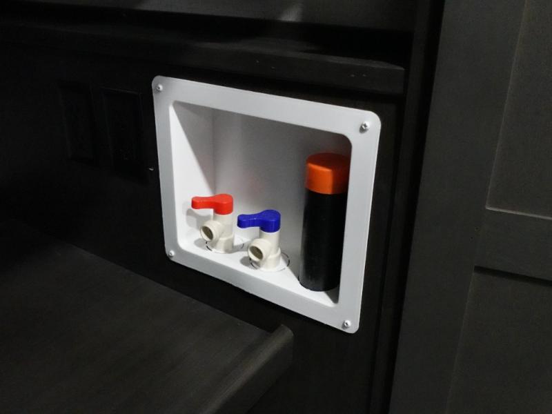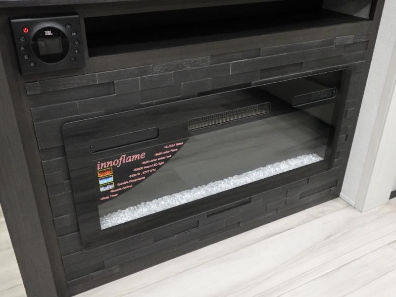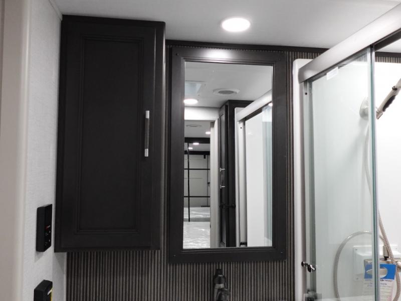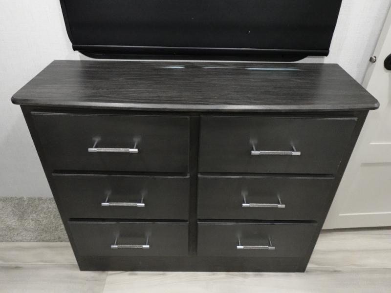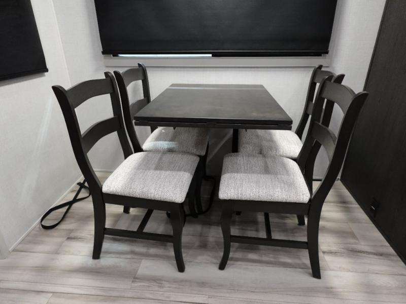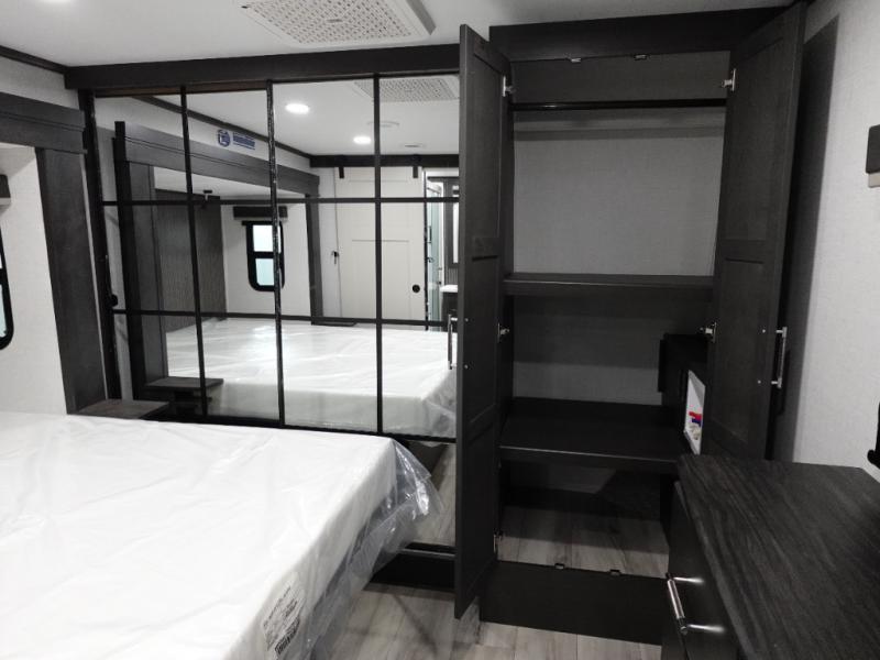 This grand kitchen offers the cook their own space to prepare and serve meals from the large L-shaped counter peninsula bar with stools, and the large pantry and curio will come in handy as well. Dining is also available at the free standing dinette with four chairs and some might even enjoy sitting on the hide-a-bed sofa sleeper. Also available for seating are the theater seats which are equipped with heat, massage, LED lights and USB charging. The master bedroom offers a king bed with storage underneath and additional wardrobe storage plus a space prepped for a washer/dryer option. Having a separate living area from the kitchen gives everyone room to spread out, and outside there are two power awnings offering additional outdoor living areas protected from the elements. The cook will enjoy the outside Grill-n-Chill outside kitchen as well.
