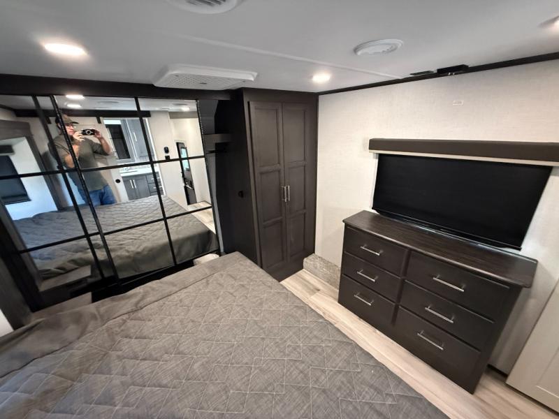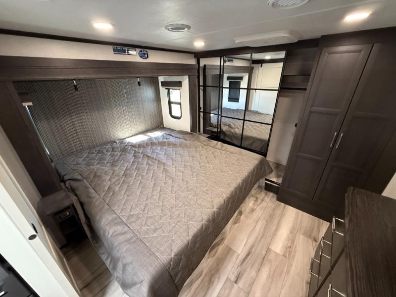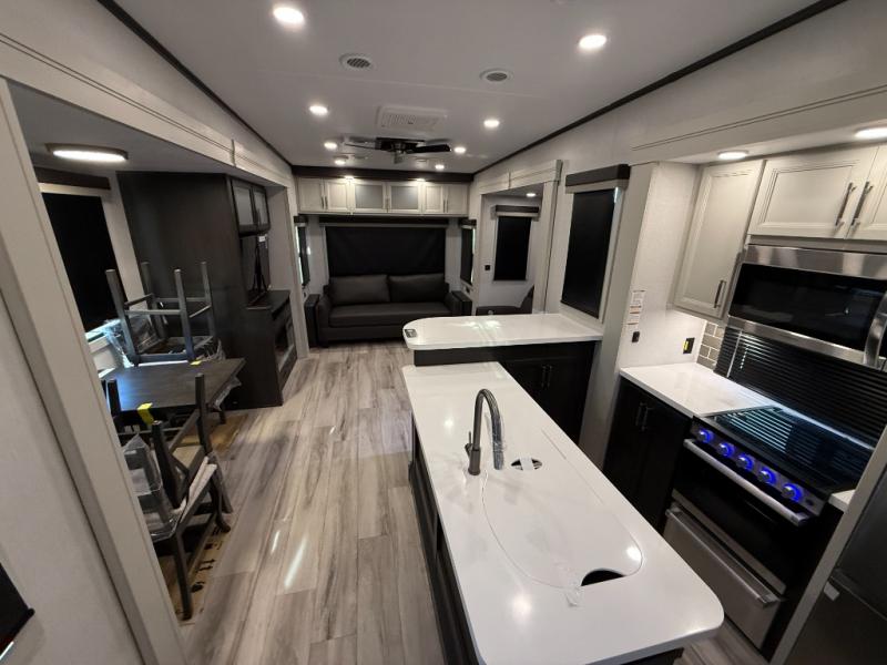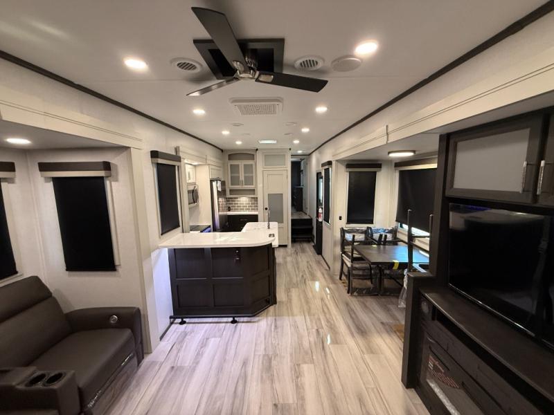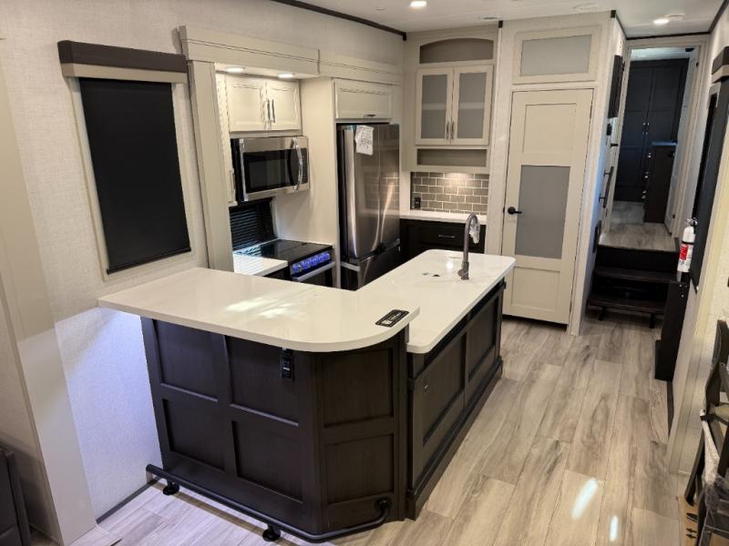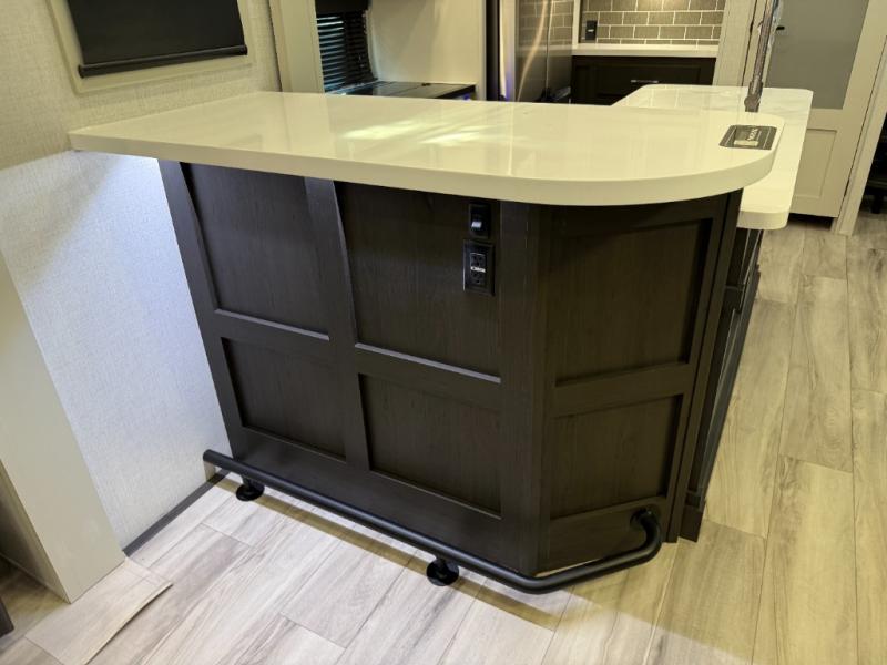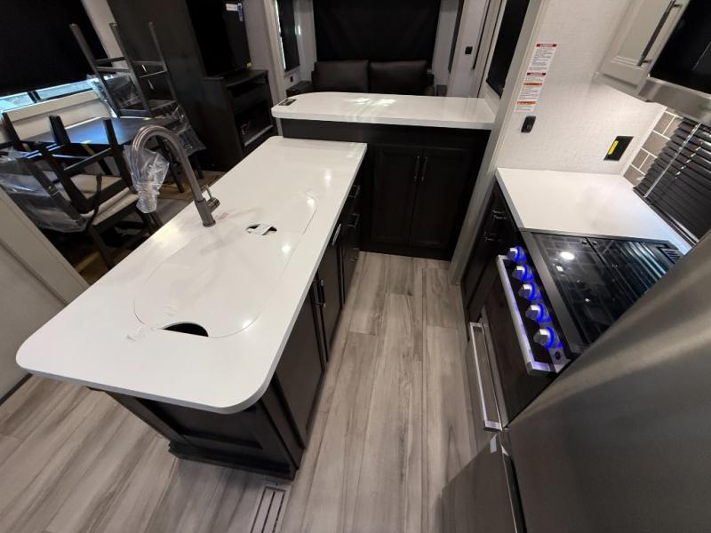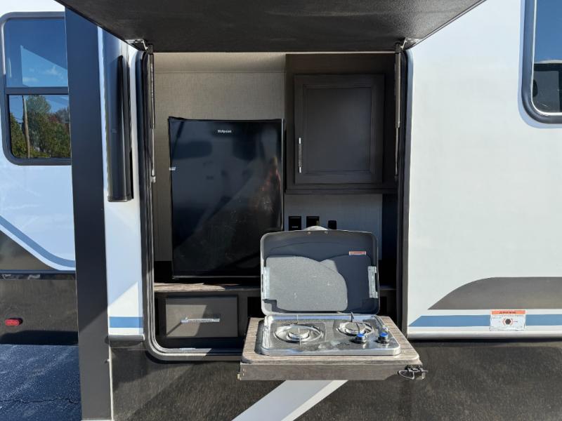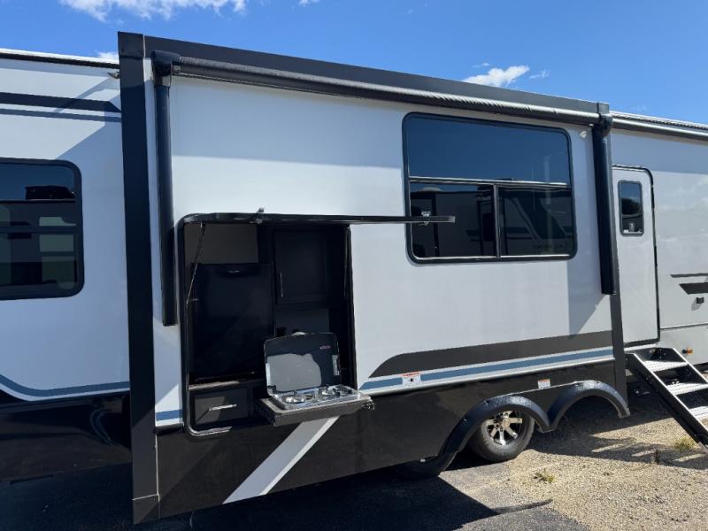 Our best selling couples fifth wheel! Outdoor kitchen, huge L-shaped bar, king bed, hydraulic auto leveling, and much more!
