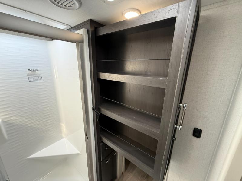 This grand kitchen offers the cook their own space to prepare and serve meals from the large L-shaped counter peninsula bar with stools, and the large pantry and curio will come in handy as well. Dining is also available at the free standing dinette with four chairs and some might even enjoy sitting on the hide-a-bed sofa sleeper. Also available for seating are the theater seats which are equipped with heat, massage, LED lights and USB charging. The master bedroom offers a king bed with storage underneath and additional wardrobe storage plus a space prepped for a washer/dryer option. Having a separate living area from the kitchen gives everyone room to spread out, and outside there are two power awnings offering additional outdoor living areas protected from the elements. The cook will enjoy the outside Grill-n-Chill outside kitchen as well.