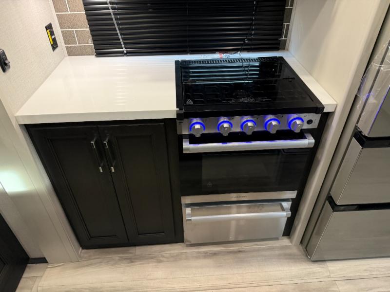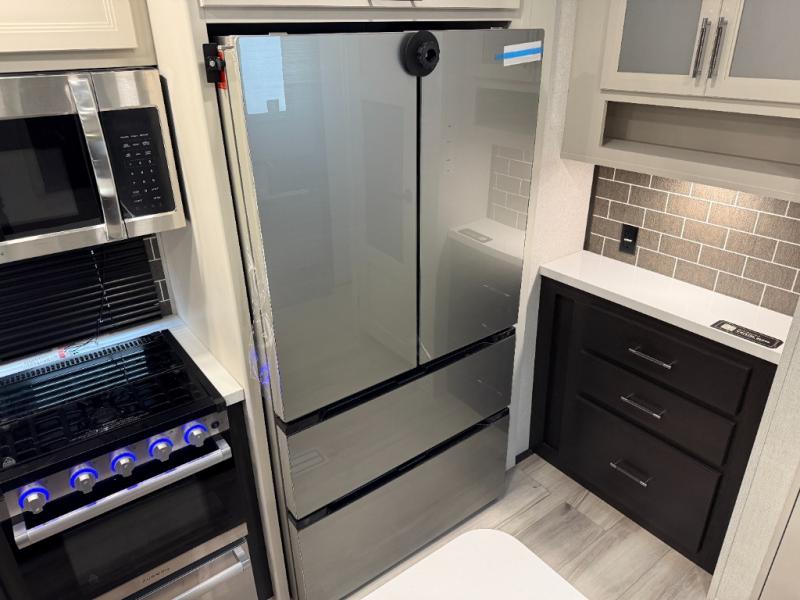 This grand kitchen offers the cook their own space to prepare and serve meals from the large L-shaped counter peninsula bar with stools, and the large pantry and curio will come in handy as well. Dining is also available at the free standing dinette with four chairs and some might even enjoy sitting on the hide-a-bed sofa sleeper. Also available for seating are the theater seats which are equipped with heat, massage, LED lights and USB charging. The master bedroom offers a king bed with storage underneath and additional wardrobe storage plus a space prepped for a washer/dryer option. Having a separate living area from the kitchen gives everyone room to spread out, and outside there are two power awnings offering additional outdoor living areas protected from the elements. The cook will enjoy the outside Grill-n-Chill outside kitchen as well.