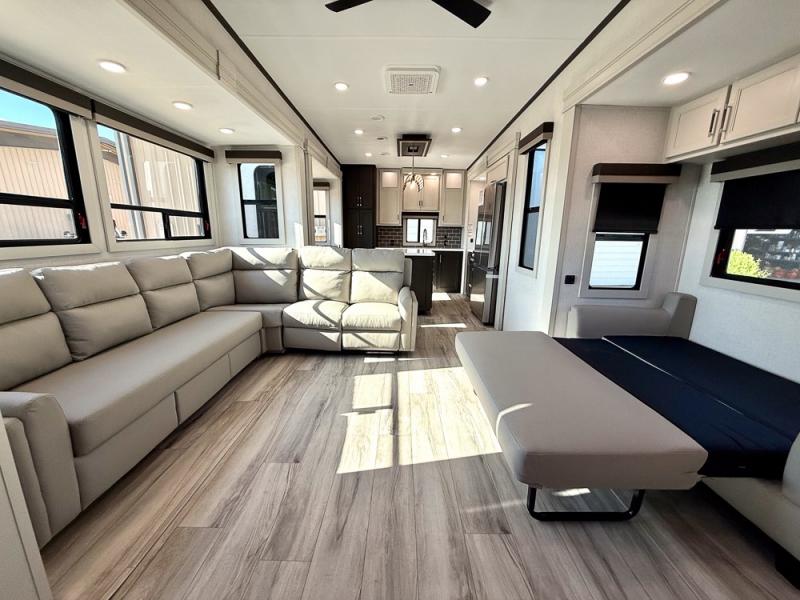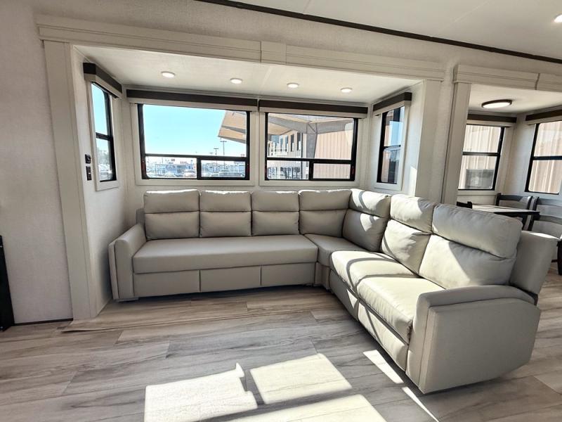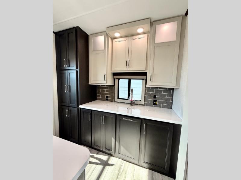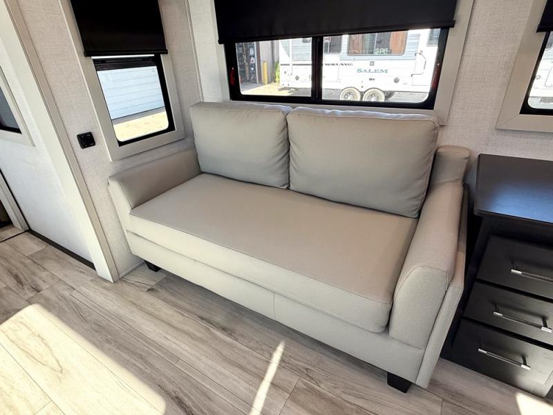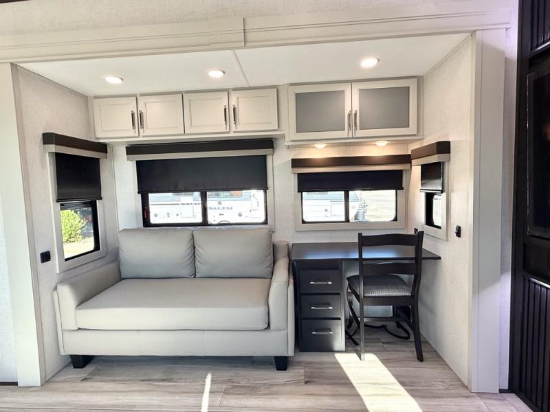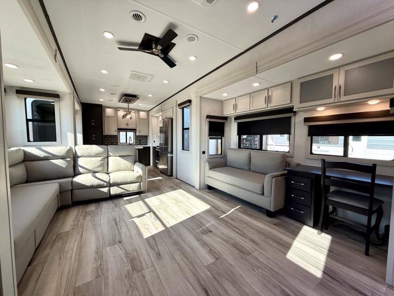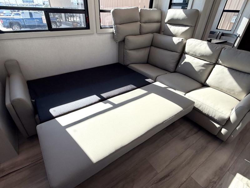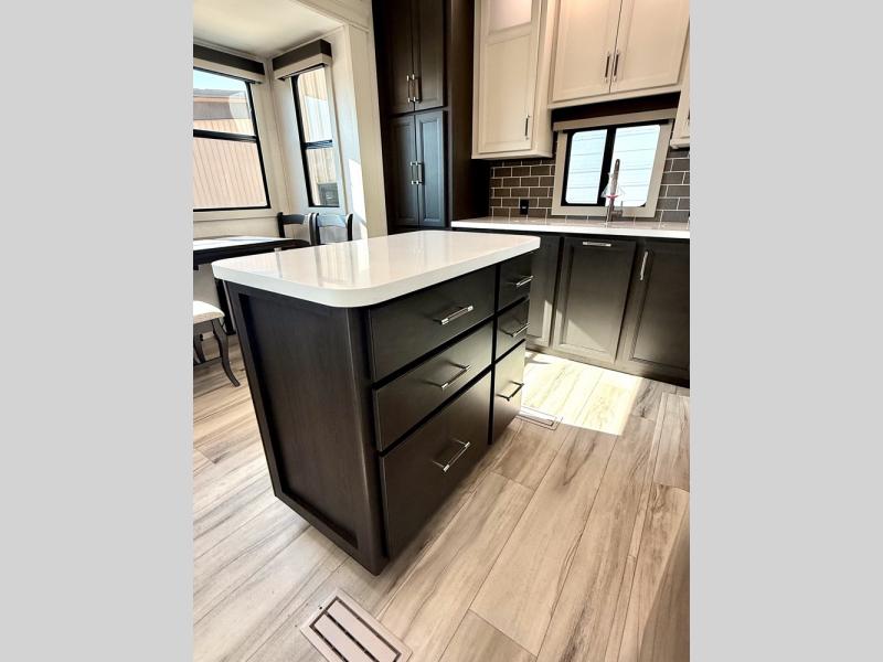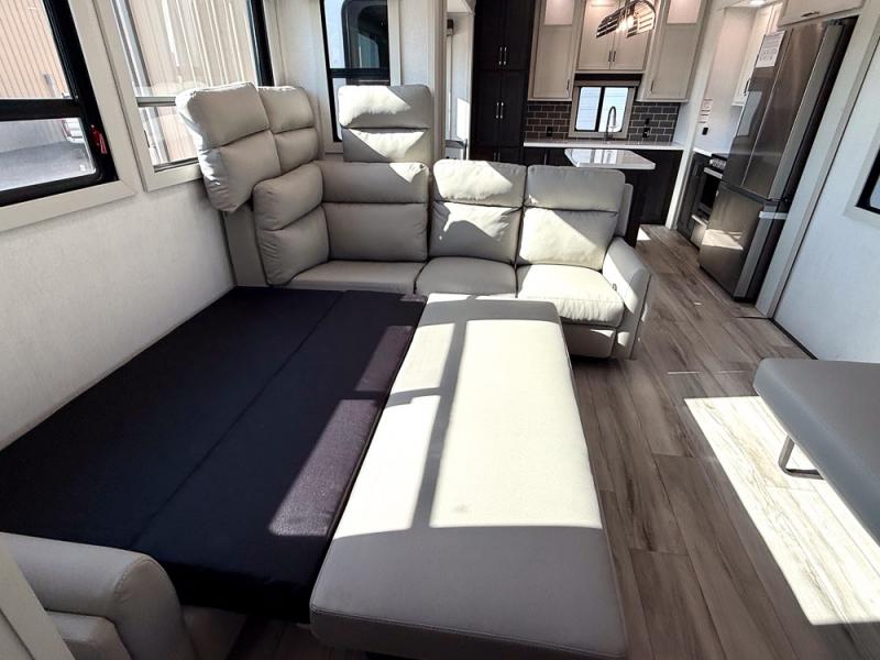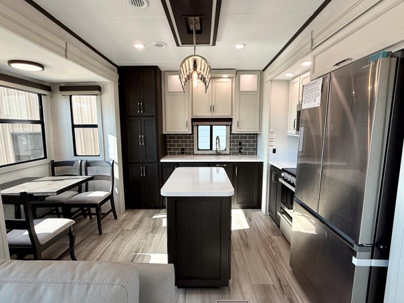 This rear kitchen fifth wheel makes extended stays or weekend trips to the lake enjoyable! The chef of your group will find plenty of counter space with the included kitchen island, plus there is a pantry and 18 cu. ft. residential refrigerator for food storage. A free-standing dinette provides a place to dine together, and the largest L-shaped sofa with recliners will be the perfect spot to relax with a movie. If you have guests, they could sleep here or on the hide-a-bed sofa sleeper. The dual entry bath includes a shower with a seat for added comfort, and the front master bedroom will feel just like home with its king bed slide out and master closet. There is also a dresser and stackable washer and dryer prep if you want to add those appliances!