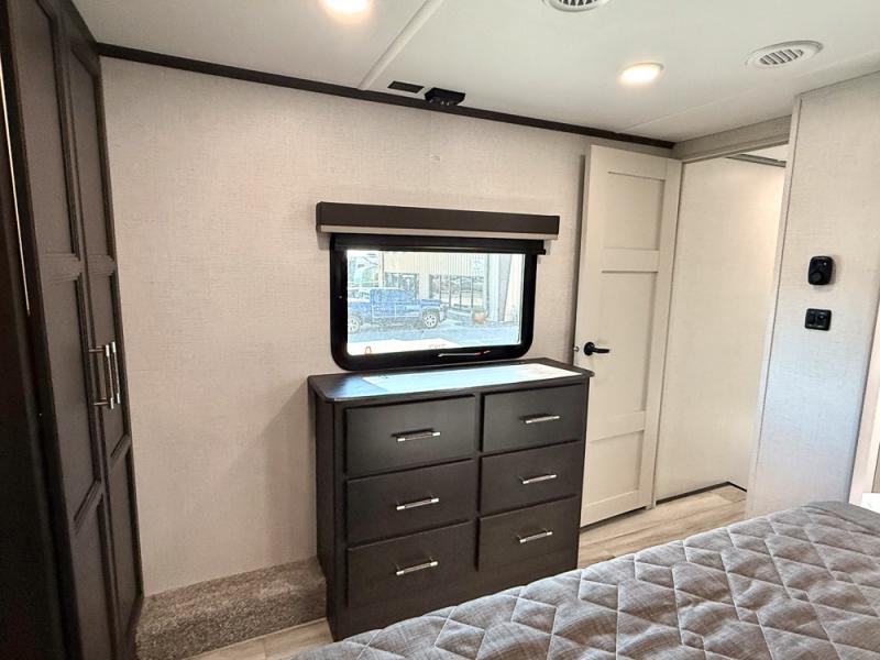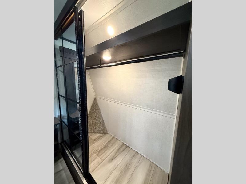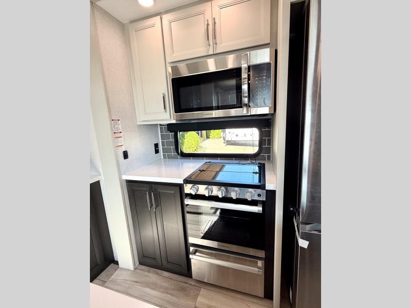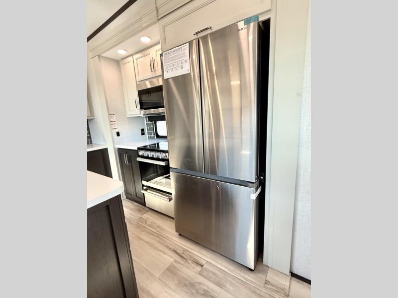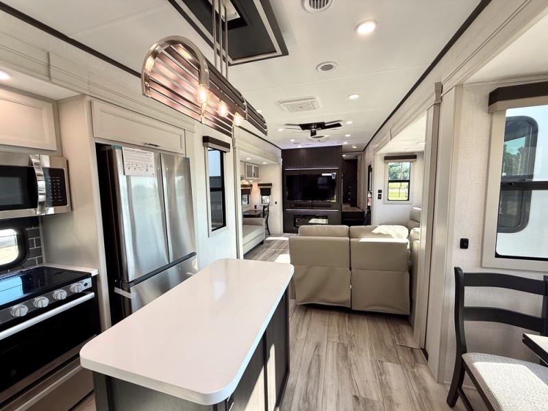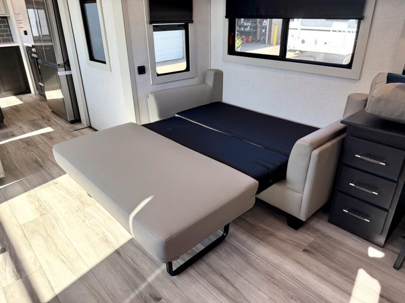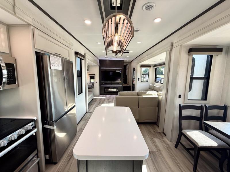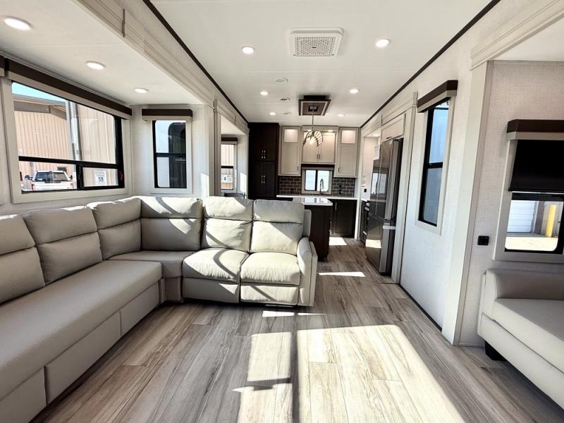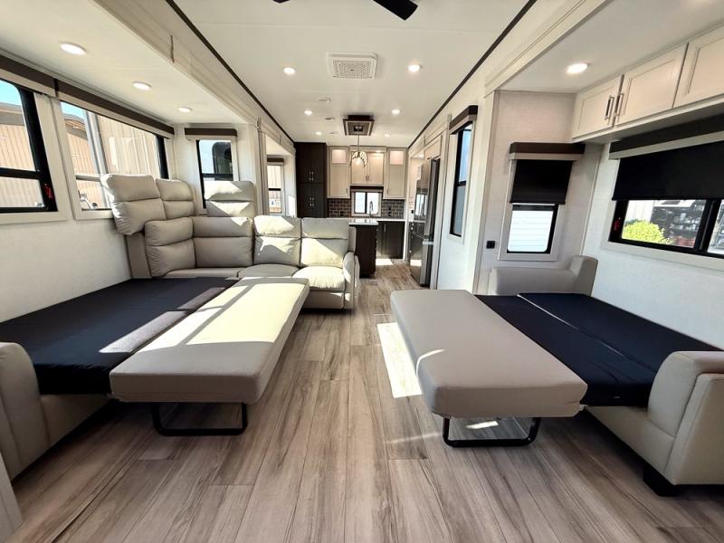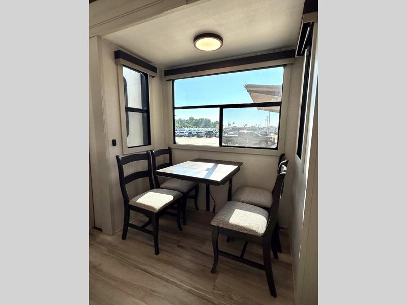 This rear kitchen fifth wheel makes extended stays or weekend trips to the lake enjoyable! The chef of your group will find plenty of counter space with the included kitchen island, plus there is a pantry and 18 cu. ft. residential refrigerator for food storage. A free-standing dinette provides a place to dine together, and the largest L-shaped sofa with recliners will be the perfect spot to relax with a movie. If you have guests, they could sleep here or on the hide-a-bed sofa sleeper. The dual entry bath includes a shower with a seat for added comfort, and the front master bedroom will feel just like home with its king bed slide out and master closet. There is also a dresser and stackable washer and dryer prep if you want to add those appliances!
