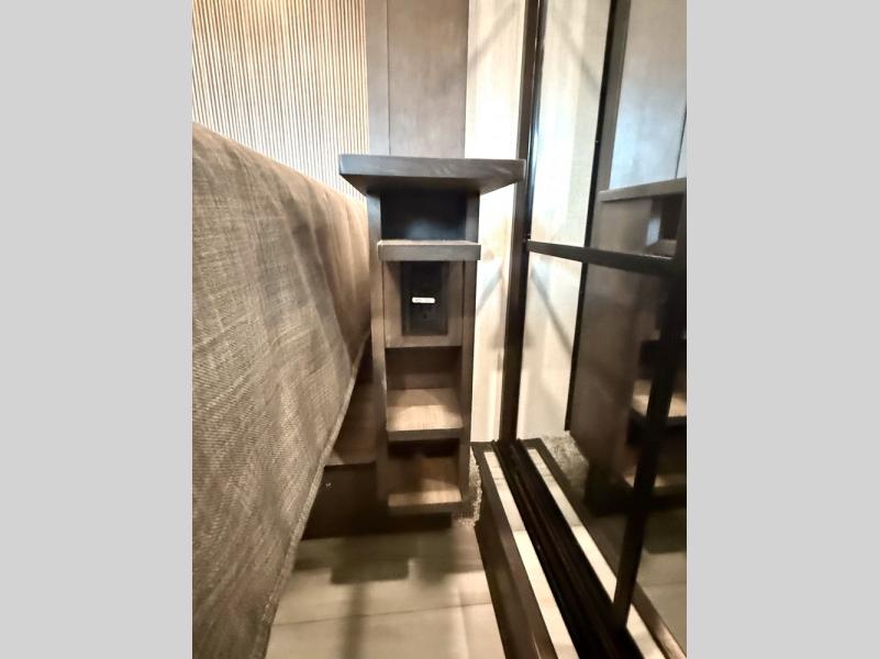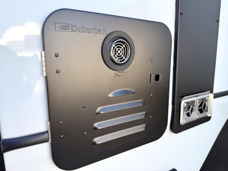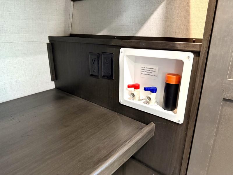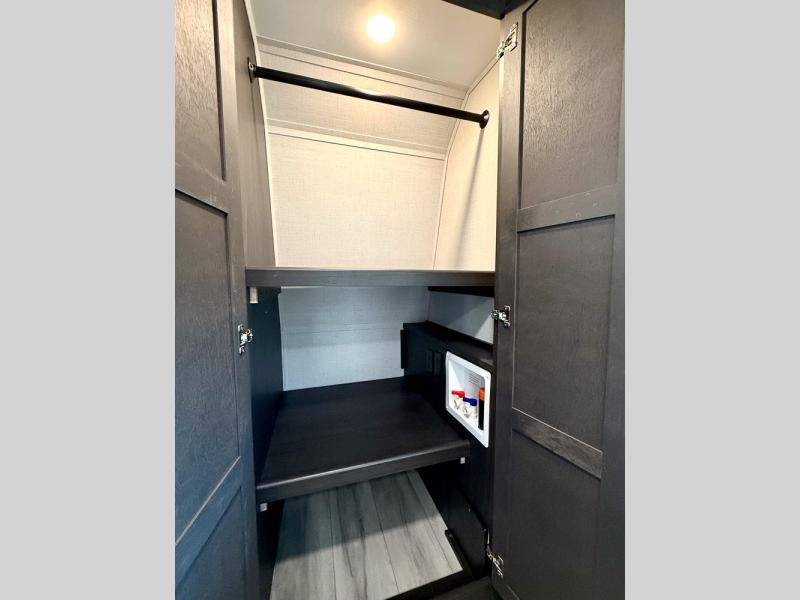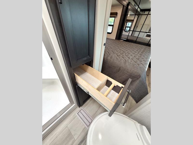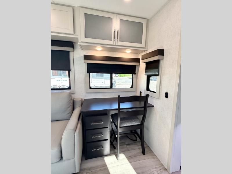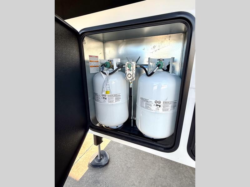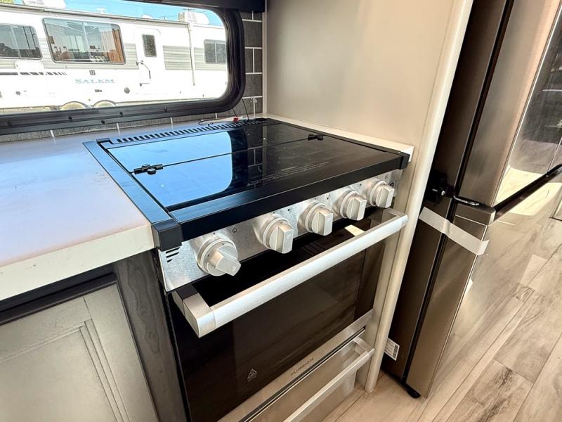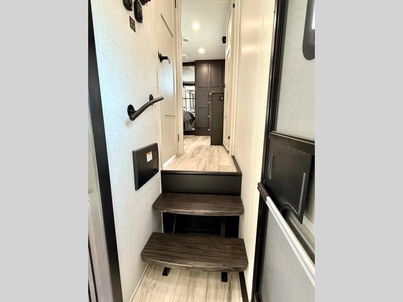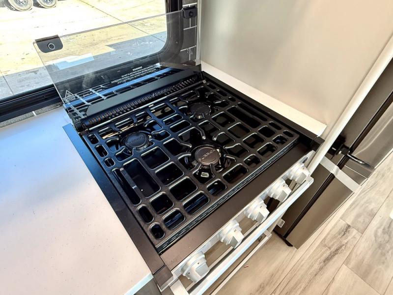 This rear kitchen fifth wheel makes extended stays or weekend trips to the lake enjoyable! The chef of your group will find plenty of counter space with the included kitchen island, plus there is a pantry and 18 cu. ft. residential refrigerator for food storage. A free-standing dinette provides a place to dine together, and the largest L-shaped sofa with recliners will be the perfect spot to relax with a movie. If you have guests, they could sleep here or on the hide-a-bed sofa sleeper. The dual entry bath includes a shower with a seat for added comfort, and the front master bedroom will feel just like home with its king bed slide out and master closet. There is also a dresser and stackable washer and dryer prep if you want to add those appliances!