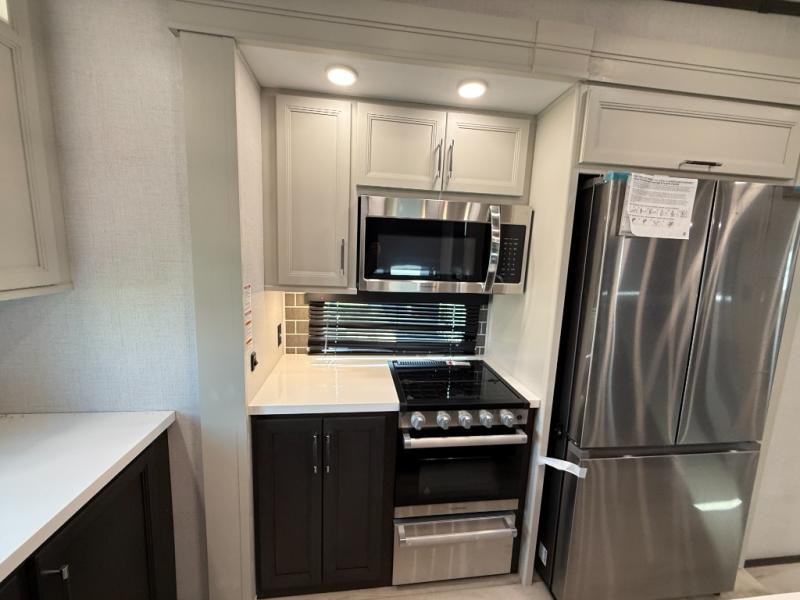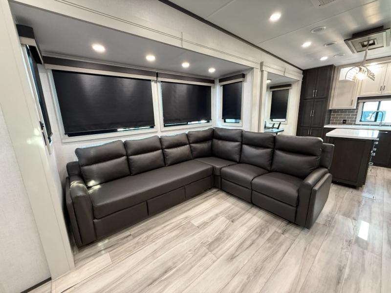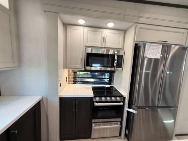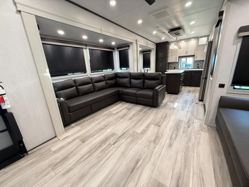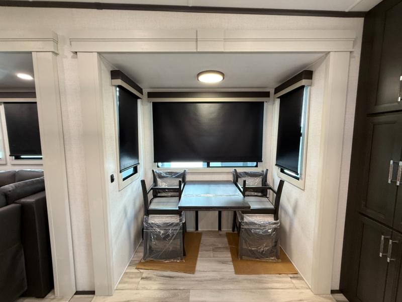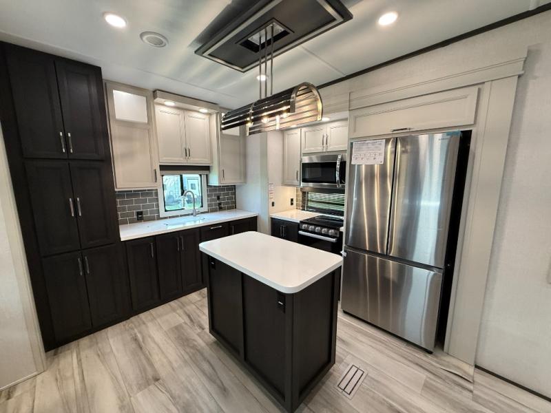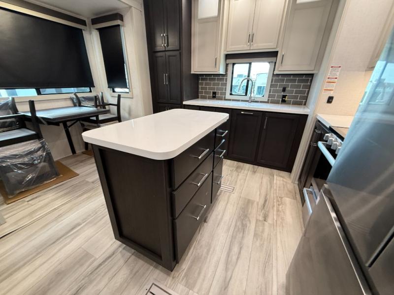 This rear kitchen fifth wheel makes extended stays or weekend trips to the lake enjoyable! The chef of your group will find plenty of counter space with the included kitchen island, plus there is a pantry and 18 cu. ft. residential refrigerator for food storage. A free-standing dinette provides a place to dine together, and the largest L-shaped sofa with recliners will be the perfect spot to relax with a movie. If you have guests, they could sleep here or on the hide-a-bed sofa sleeper. The dual entry bath includes a shower with a seat for added comfort, and the front master bedroom will feel just like home with its king bed slide out and master closet. There is also a dresser and stackable washer and dryer prep if you want to add those appliances!
