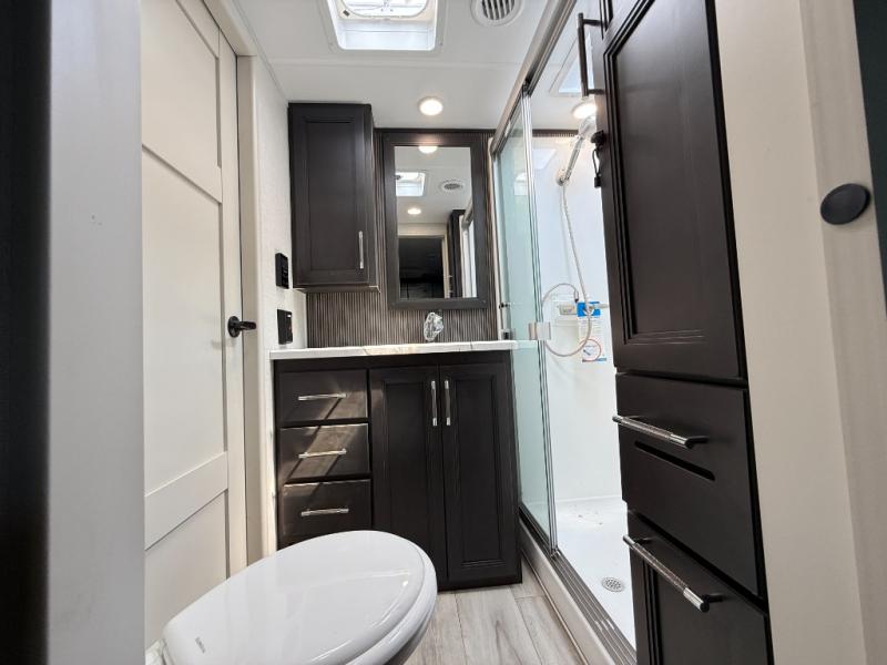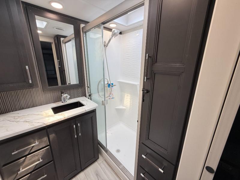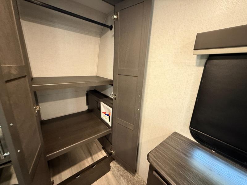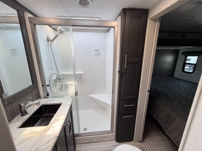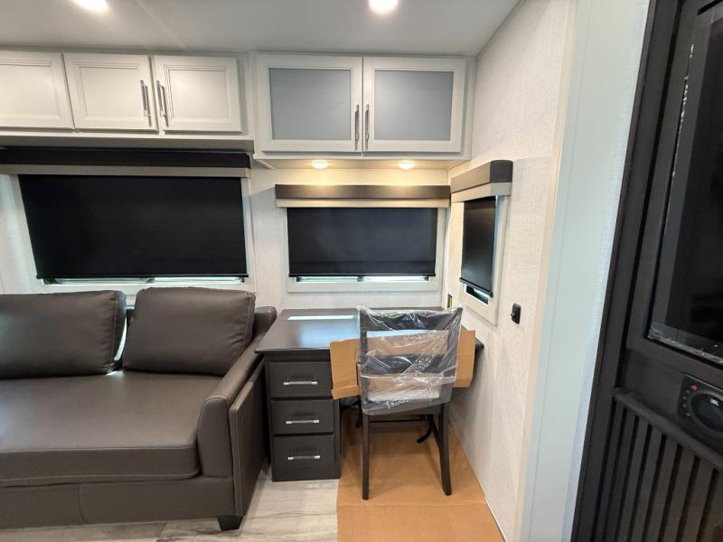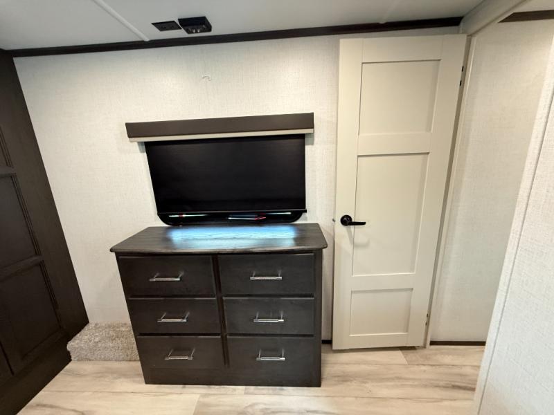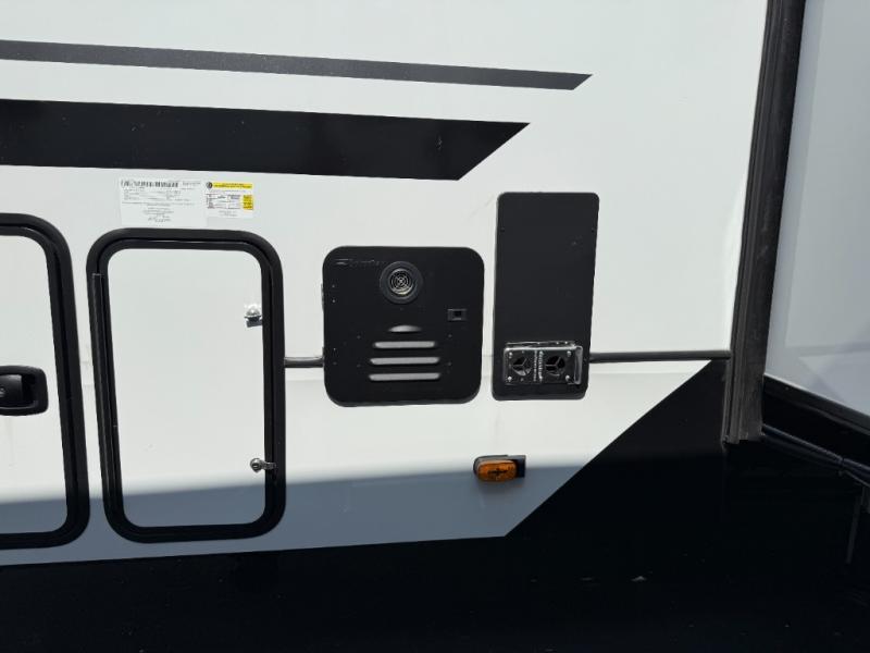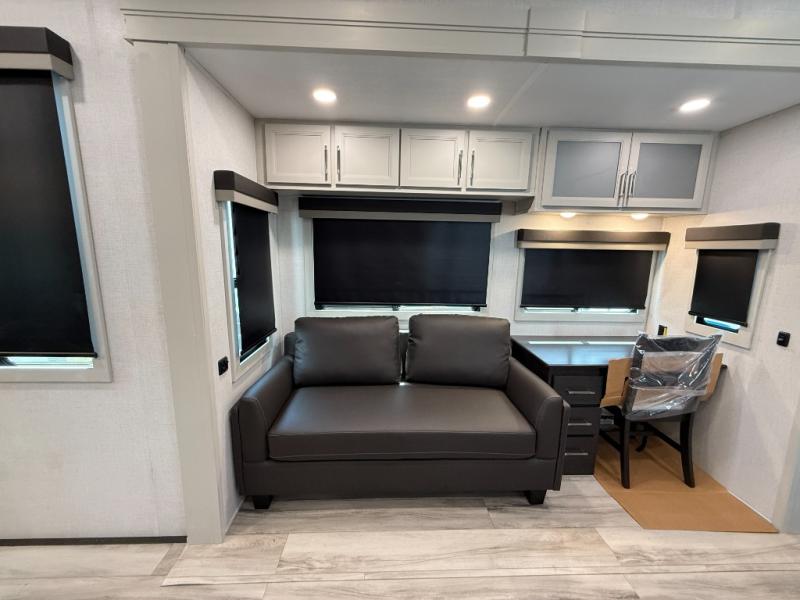 This rear kitchen fifth wheel makes extended stays or weekend trips to the lake enjoyable! The chef of your group will find plenty of counter space with the included kitchen island, plus there is a pantry and 18 cu. ft. residential refrigerator for food storage. A free-standing dinette provides a place to dine together, and the largest L-shaped sofa with recliners will be the perfect spot to relax with a movie. If you have guests, they could sleep here or on the hide-a-bed sofa sleeper. The dual entry bath includes a shower with a seat for added comfort, and the front master bedroom will feel just like home with its king bed slide out and master closet. There is also a dresser and stackable washer and dryer prep if you want to add those appliances!