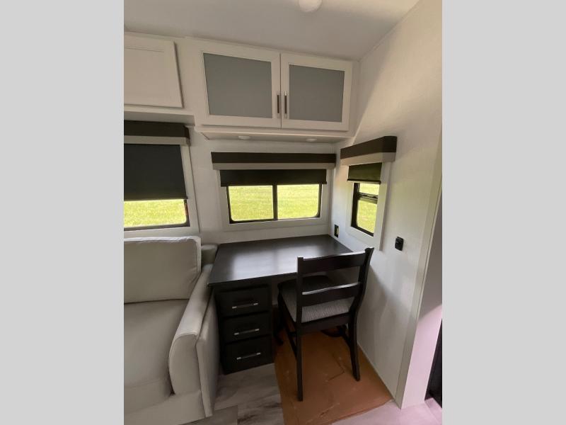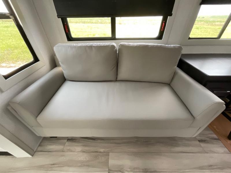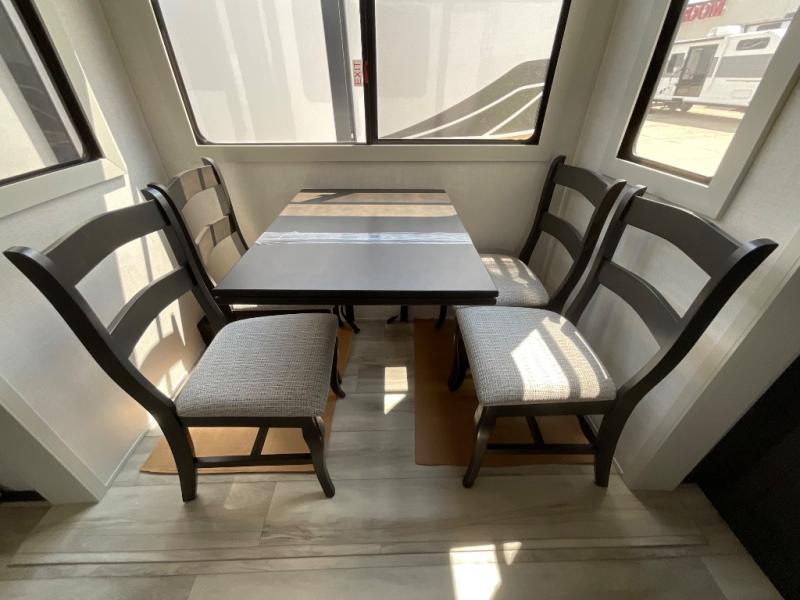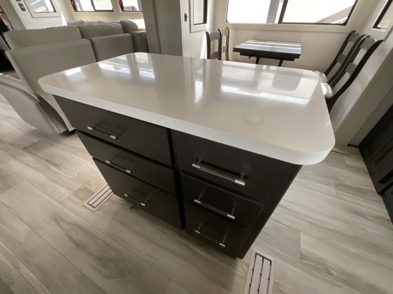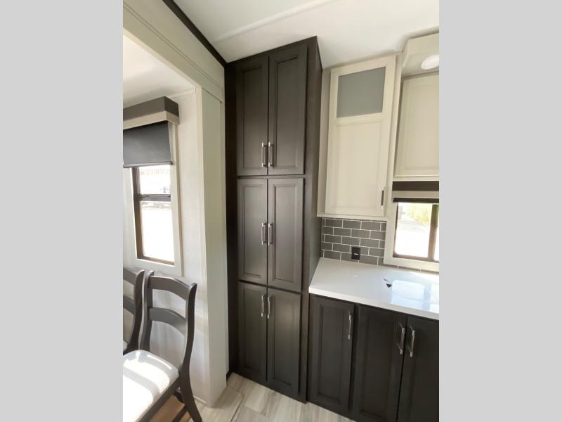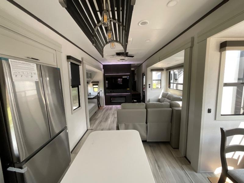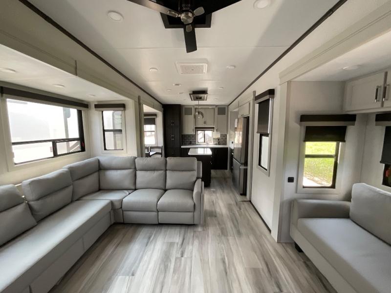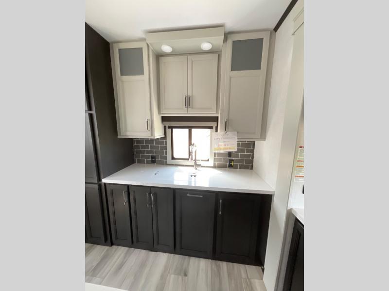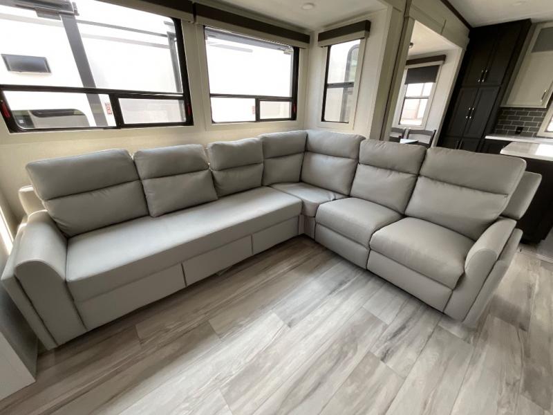 This rear kitchen fifth wheel makes extended stays or weekend trips to the lake enjoyable! The chef of your group will find plenty of counter space with the included kitchen island, plus there is a pantry and 18 cu. ft. residential refrigerator for food storage. A free-standing dinette provides a place to dine together, and the largest L-shaped sofa with recliners will be the perfect spot to relax with a movie. If you have guests, they could sleep here or on the hide-a-bed sofa sleeper. The dual entry bath includes a shower with a seat for added comfort, and the front master bedroom will feel just like home with its king bed slide out and master closet. There is also a dresser and stackable washer and dryer prep if you want to add those appliances!