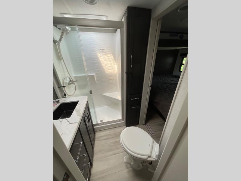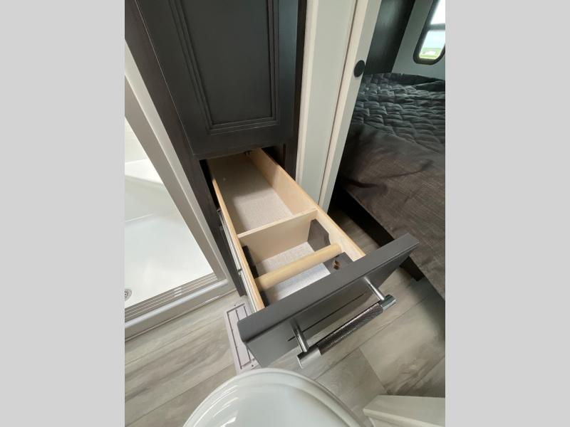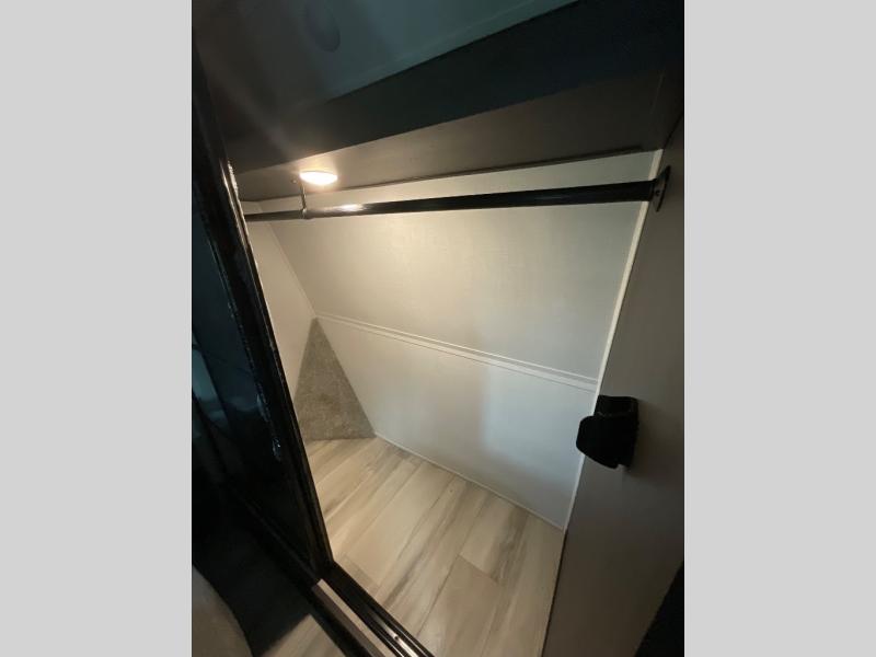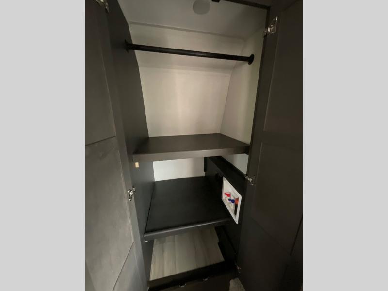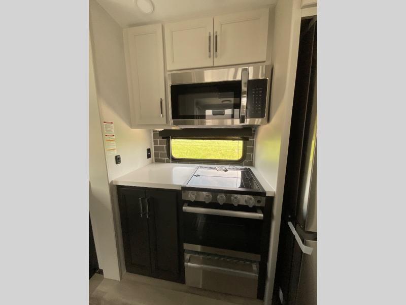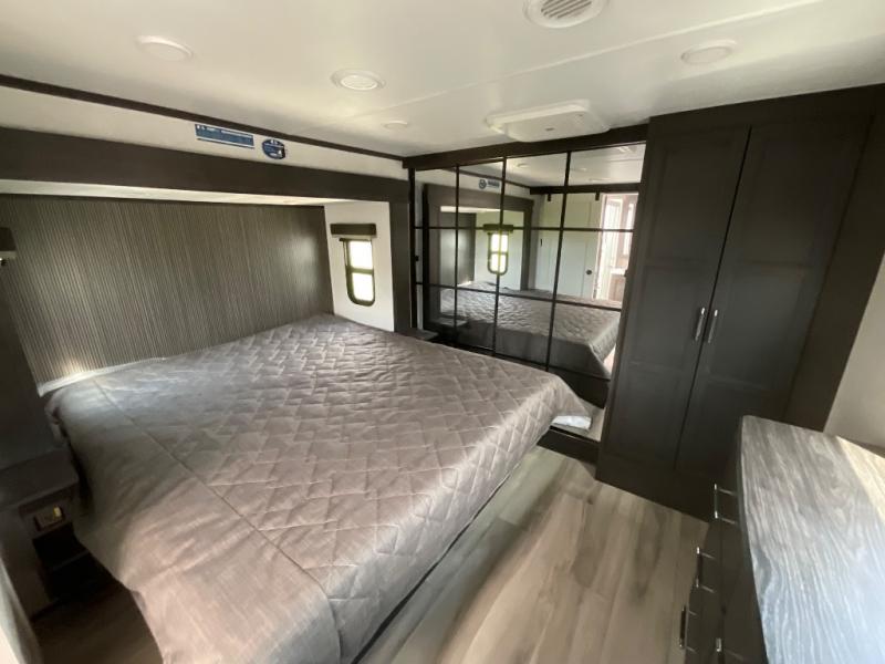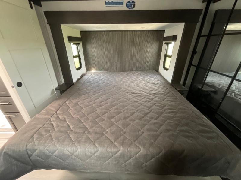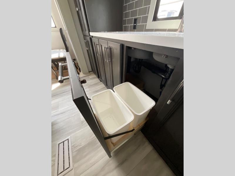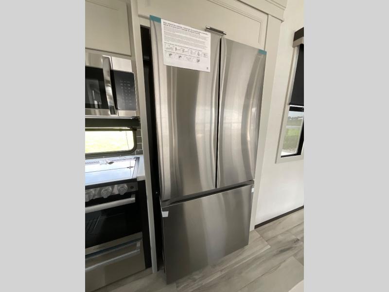 This rear kitchen fifth wheel makes extended stays or weekend trips to the lake enjoyable! The chef of your group will find plenty of counter space with the included kitchen island, plus there is a pantry and 18 cu. ft. residential refrigerator for food storage. A free-standing dinette provides a place to dine together, and the largest L-shaped sofa with recliners will be the perfect spot to relax with a movie. If you have guests, they could sleep here or on the hide-a-bed sofa sleeper. The dual entry bath includes a shower with a seat for added comfort, and the front master bedroom will feel just like home with its king bed slide out and master closet. There is also a dresser and stackable washer and dryer prep if you want to add those appliances!