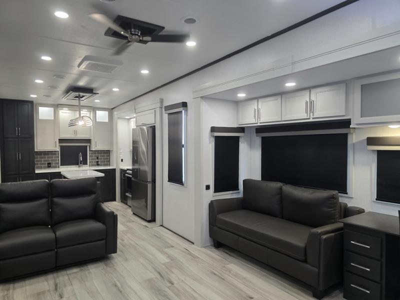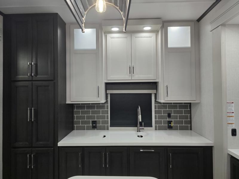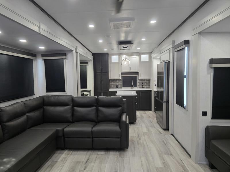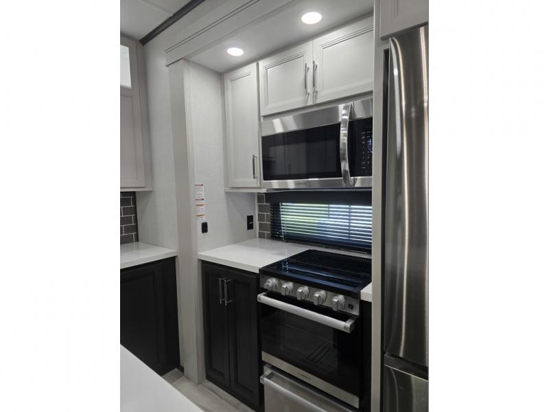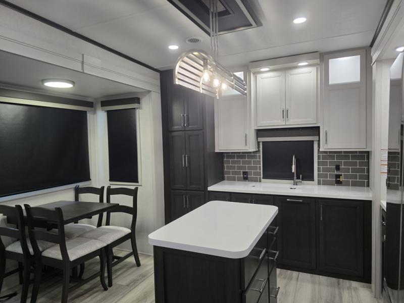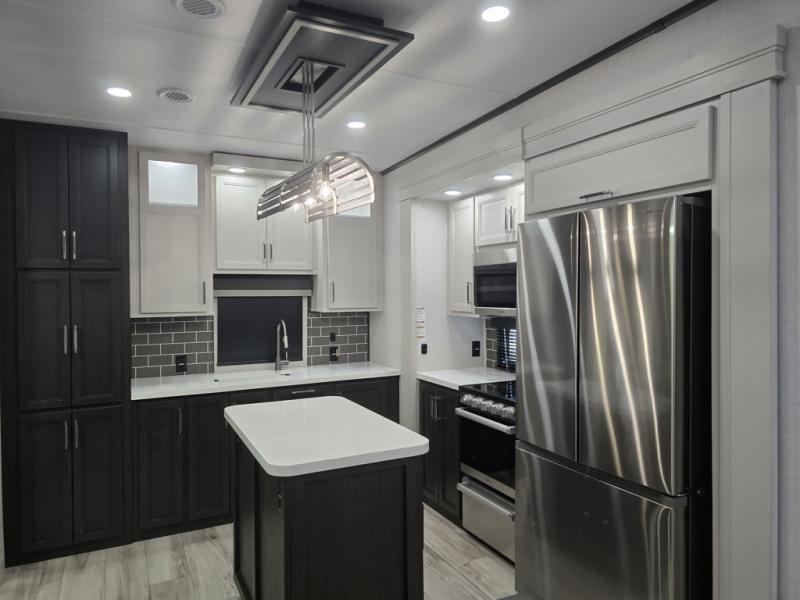 This rear kitchen fifth wheel makes extended stays or weekend trips to the lake enjoyable! The chef of your group will find plenty of counter space with the included kitchen island, plus there is a pantry and 18 cu. ft. residential refrigerator for food storage. A free-standing dinette provides a place to dine together, and the largest L-shaped sofa with recliners will be the perfect spot to relax with a movie. If you have guests, they could sleep here or on the hide-a-bed sofa sleeper. The dual entry bath includes a shower with a seat for added comfort, and the front master bedroom will feel just like home with its king bed slide out and master closet. There is also a dresser and stackable washer and dryer prep if you want to add those appliances!
