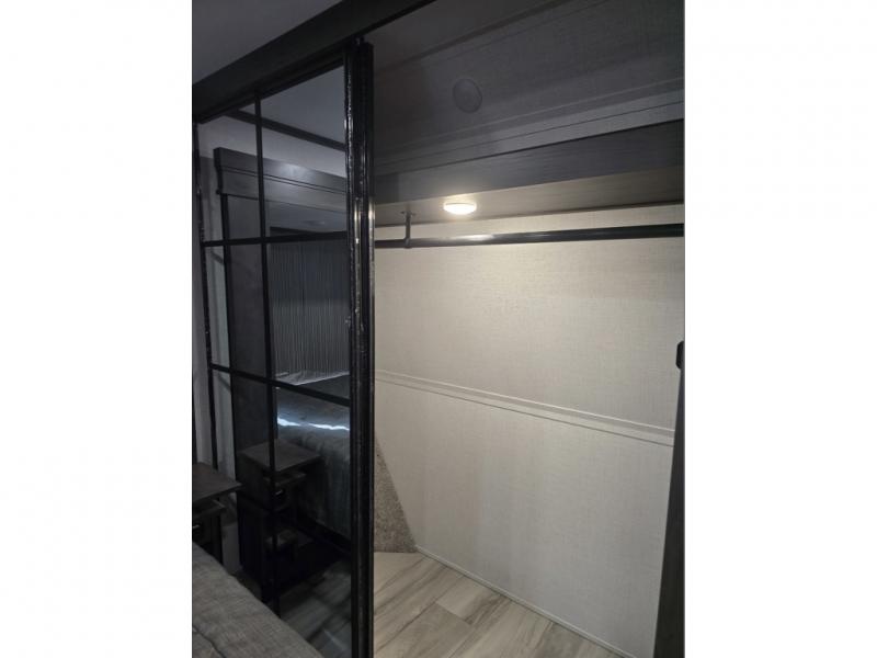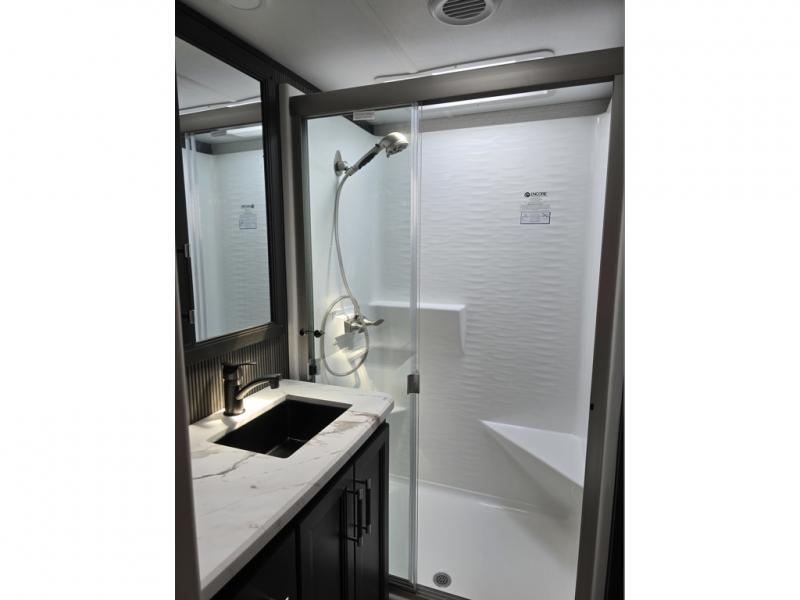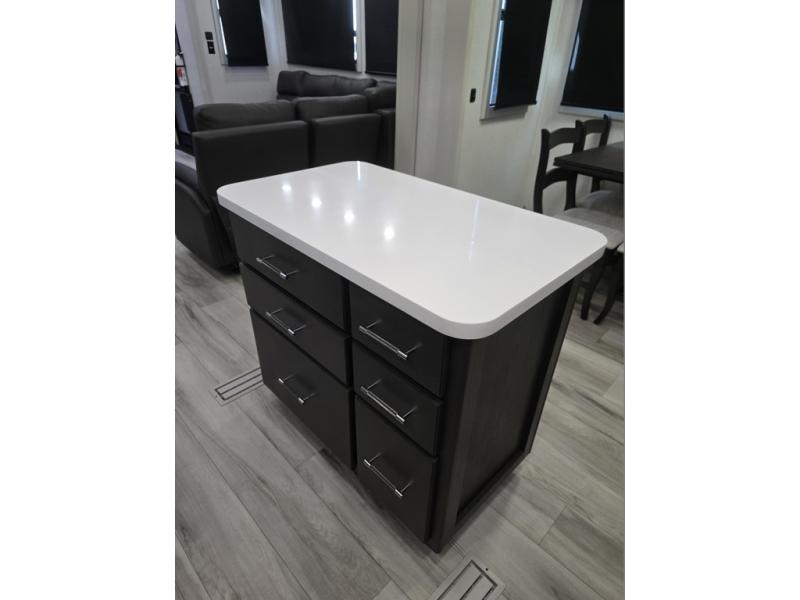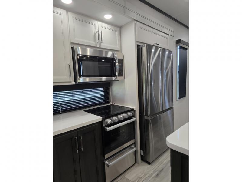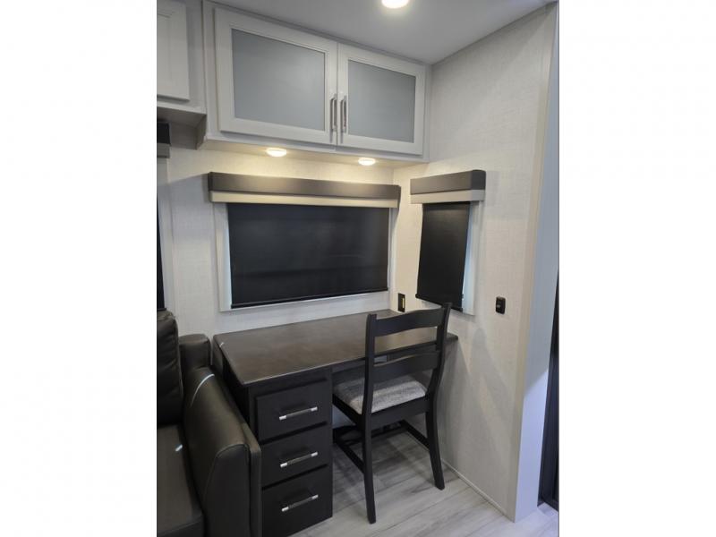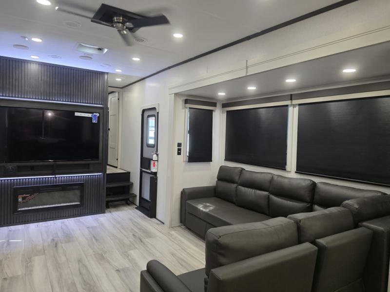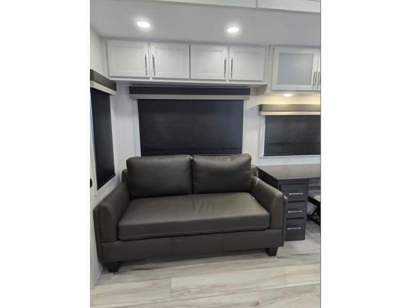 This rear kitchen fifth wheel makes extended stays or weekend trips to the lake enjoyable! The chef of your group will find plenty of counter space with the included kitchen island, plus there is a pantry and 18 cu. ft. residential refrigerator for food storage. A free-standing dinette provides a place to dine together, and the largest L-shaped sofa with recliners will be the perfect spot to relax with a movie. If you have guests, they could sleep here or on the hide-a-bed sofa sleeper. The dual entry bath includes a shower with a seat for added comfort, and the front master bedroom will feel just like home with its king bed slide out and master closet. There is also a dresser and stackable washer and dryer prep if you want to add those appliances!