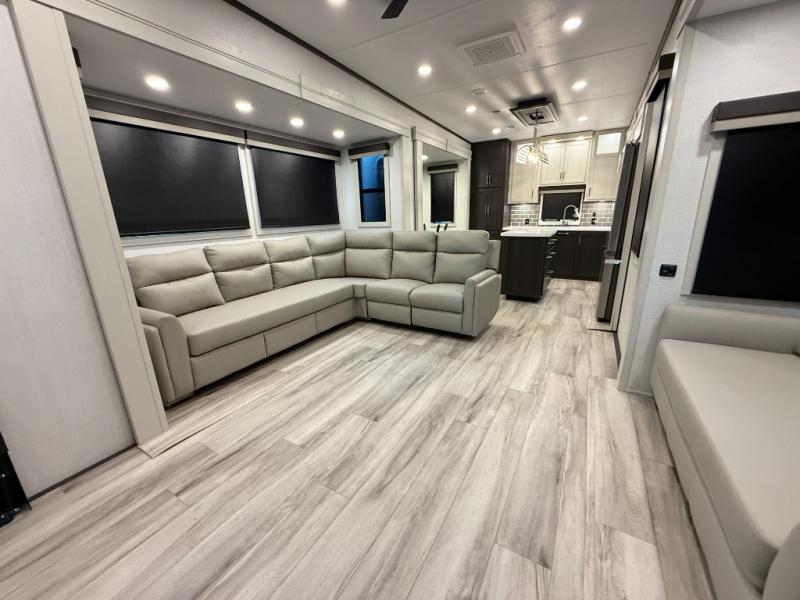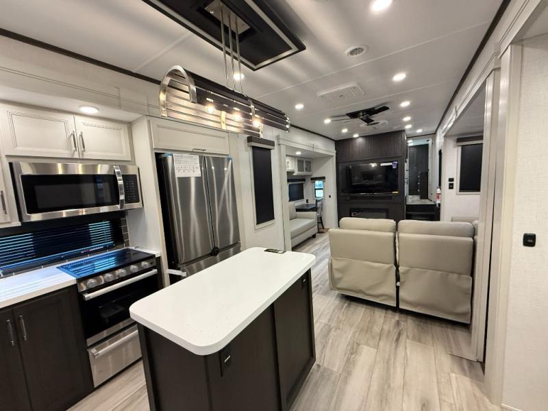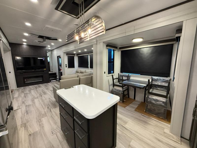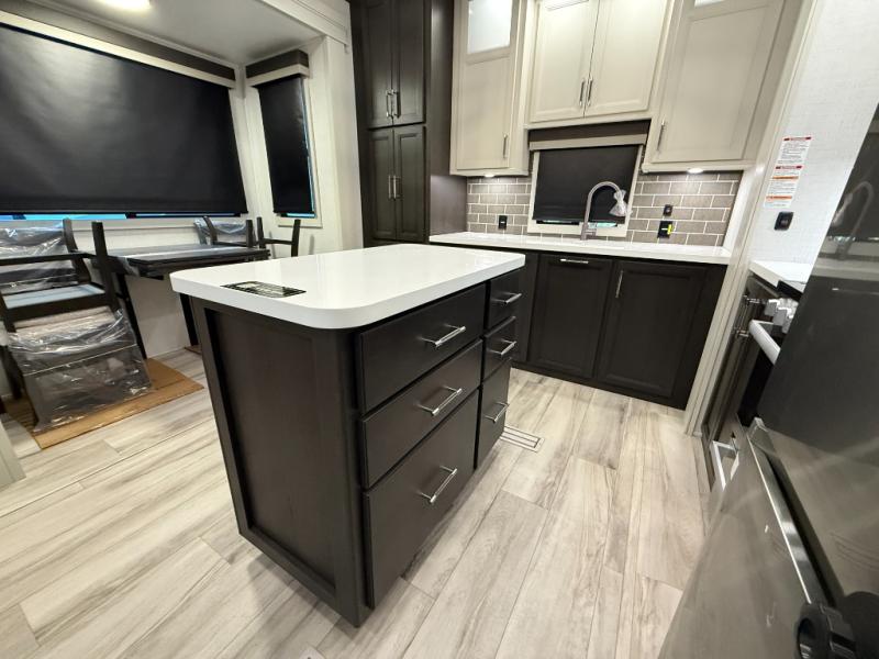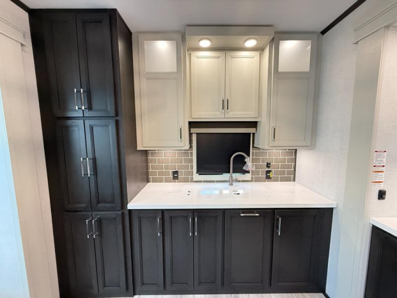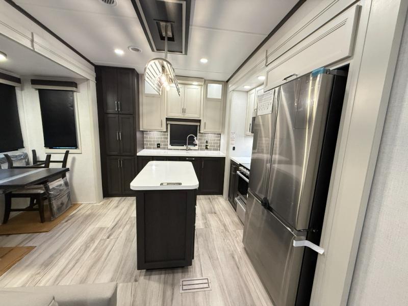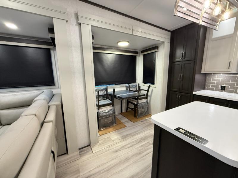 This rear kitchen fifth wheel makes extended stays or weekend trips to the lake enjoyable! The chef of your group will find plenty of counter space with the included kitchen island, plus there is a pantry and 18 cu. ft. residential refrigerator for food storage. A free-standing dinette provides a place to dine together, and the largest L-shaped sofa with recliners will be the perfect spot to relax with a movie. If you have guests, they could sleep here or on the hide-a-bed sofa sleeper. The dual entry bath includes a shower with a seat for added comfort, and the front master bedroom will feel just like home with its king bed slide out and master closet. There is also a dresser and stackable washer and dryer prep if you want to add those appliances!