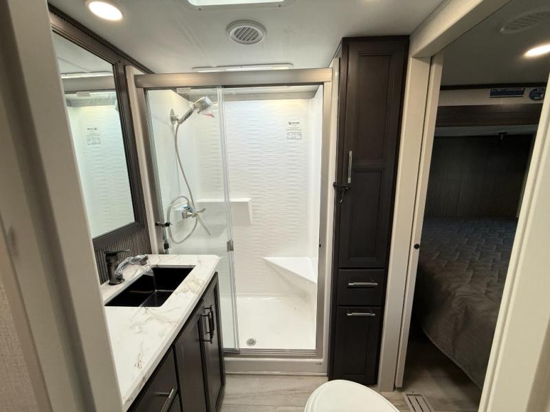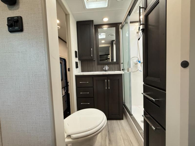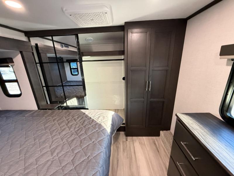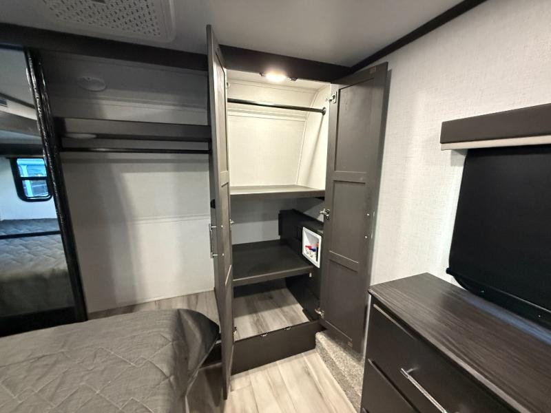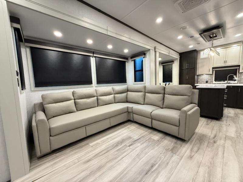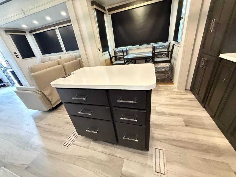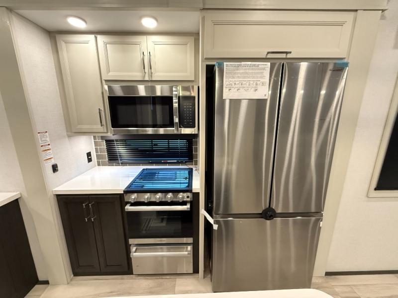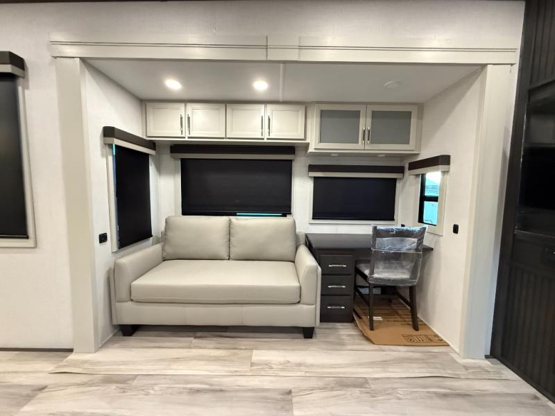 This rear kitchen fifth wheel makes extended stays or weekend trips to the lake enjoyable! The chef of your group will find plenty of counter space with the included kitchen island, plus there is a pantry and 18 cu. ft. residential refrigerator for food storage. A free-standing dinette provides a place to dine together, and the largest L-shaped sofa with recliners will be the perfect spot to relax with a movie. If you have guests, they could sleep here or on the hide-a-bed sofa sleeper. The dual entry bath includes a shower with a seat for added comfort, and the front master bedroom will feel just like home with its king bed slide out and master closet. There is also a dresser and stackable washer and dryer prep if you want to add those appliances!