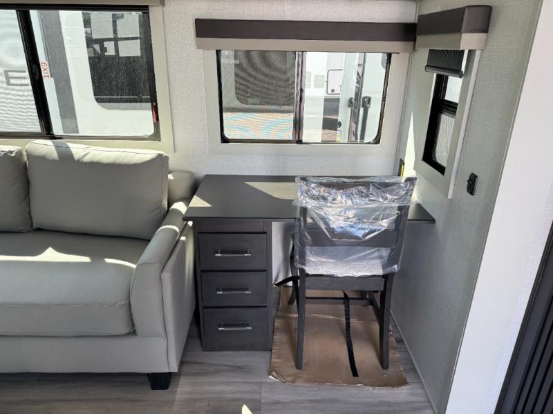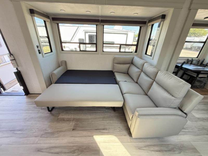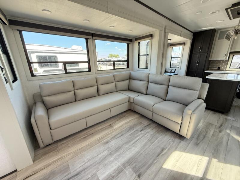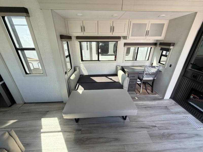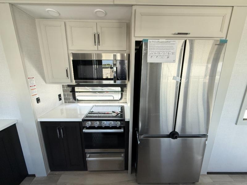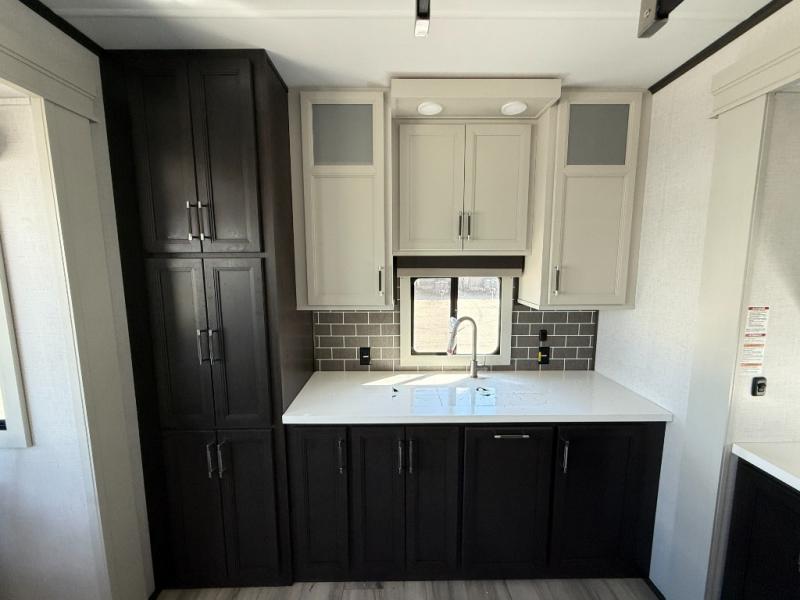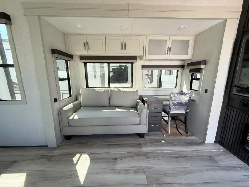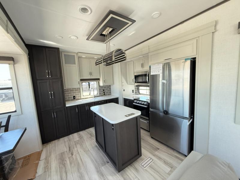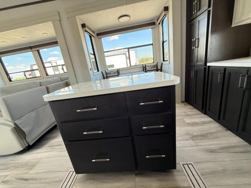 This rear kitchen fifth wheel makes extended stays or weekend trips to the lake enjoyable! The chef of your group will find plenty of counter space with the included kitchen island, plus there is a pantry and 18 cu. ft. residential refrigerator for food storage. A free-standing dinette provides a place to dine together, and the largest L-shaped sofa with recliners will be the perfect spot to relax with a movie. If you have guests, they could sleep here or on the hide-a-bed sofa sleeper. The dual entry bath includes a shower with a seat for added comfort, and the front master bedroom will feel just like home with its king bed slide out and master closet. There is also a dresser and stackable washer and dryer prep if you want to add those appliances!