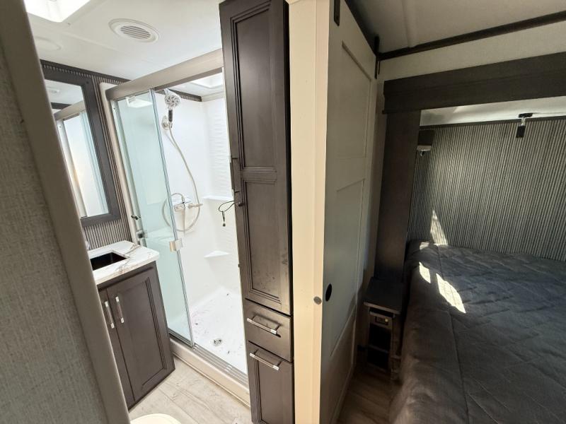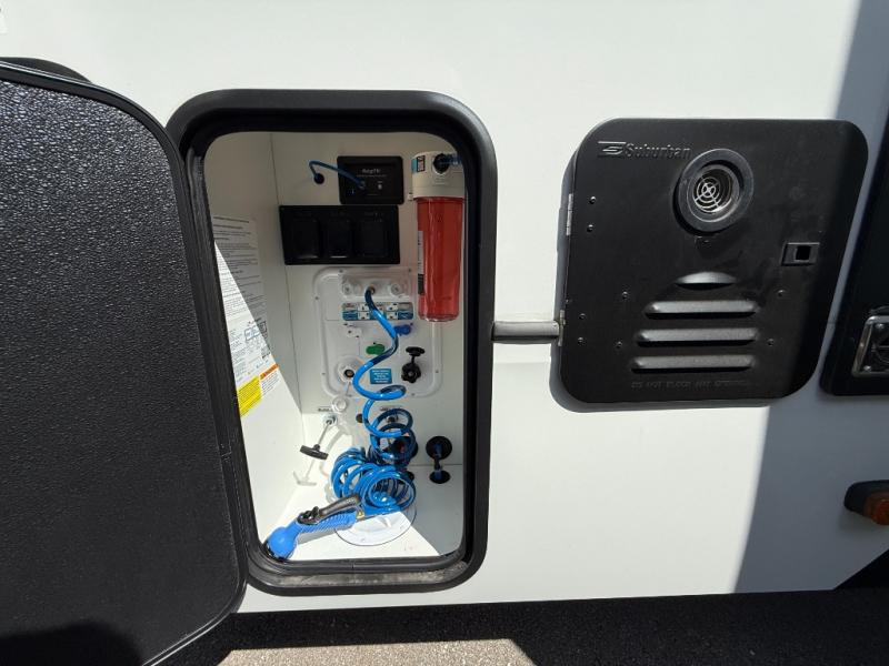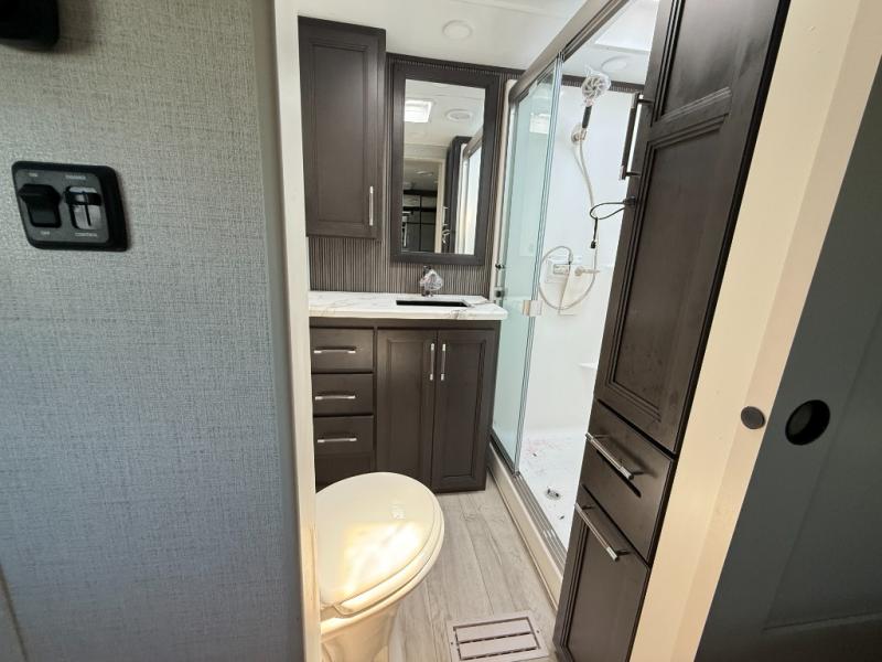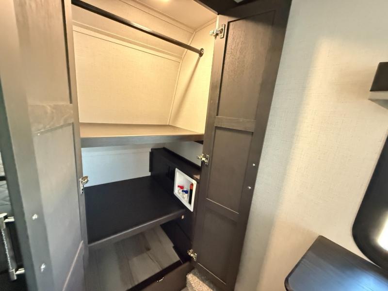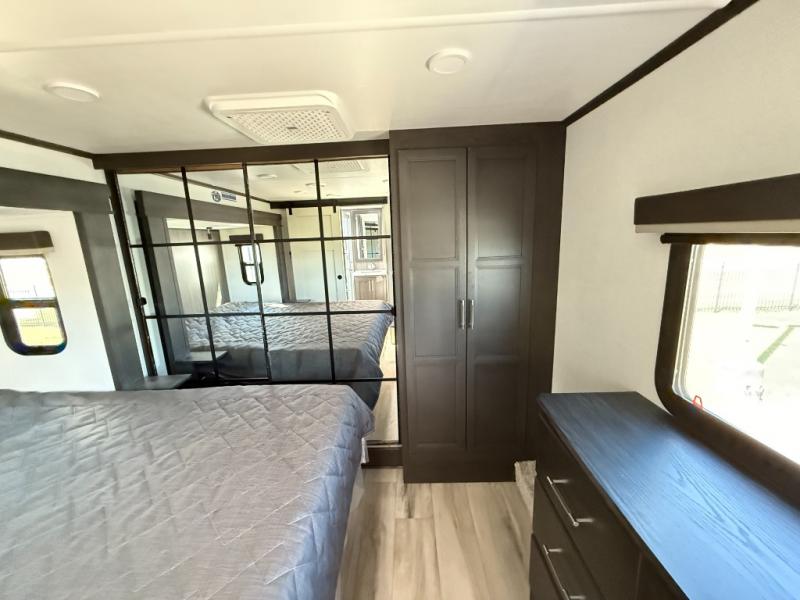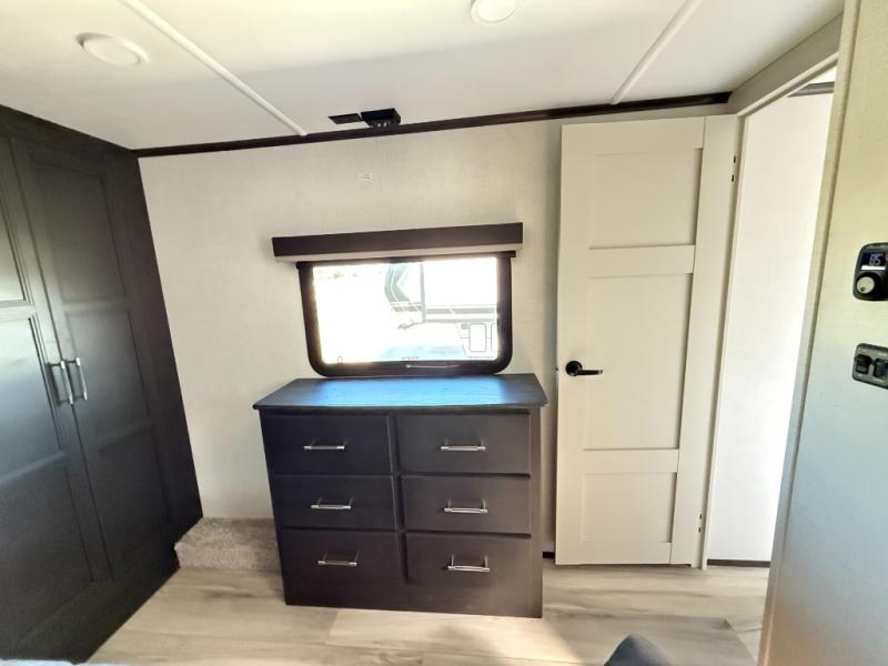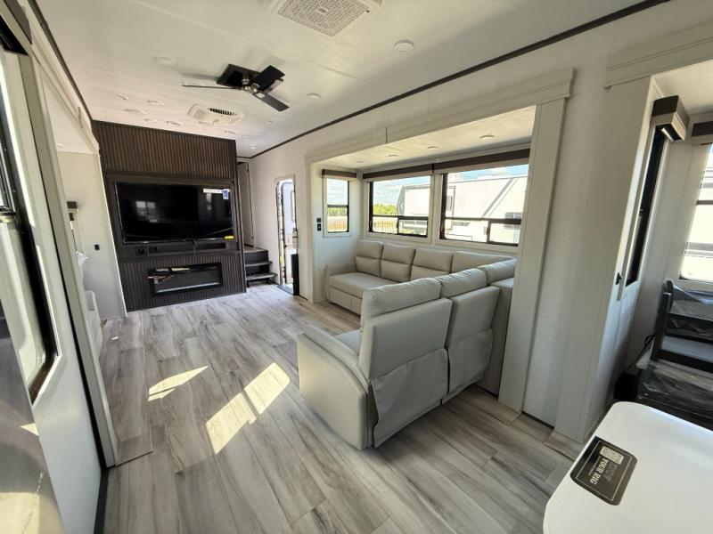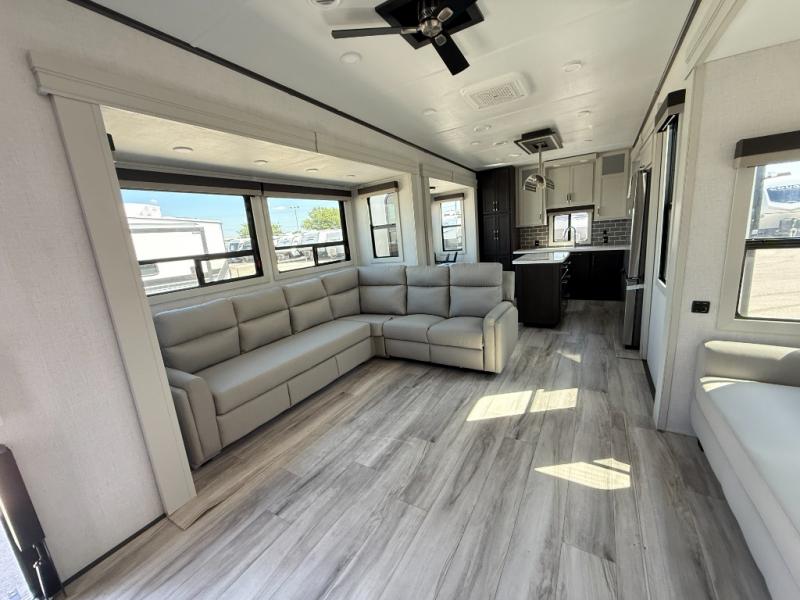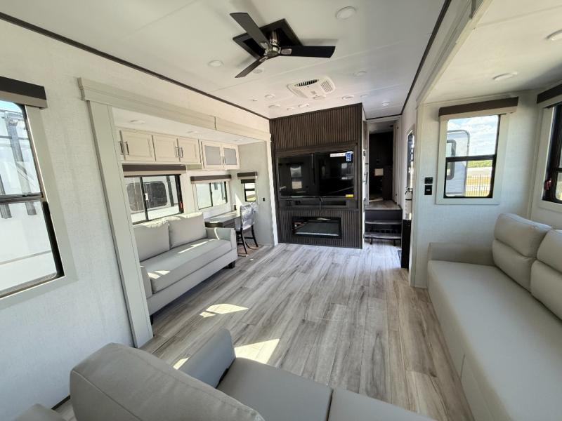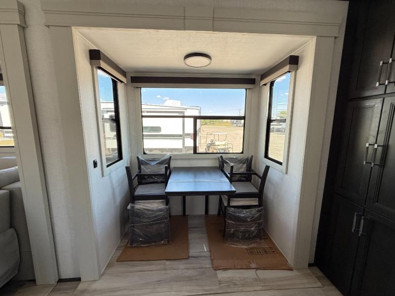 This rear kitchen fifth wheel makes extended stays or weekend trips to the lake enjoyable! The chef of your group will find plenty of counter space with the included kitchen island, plus there is a pantry and 18 cu. ft. residential refrigerator for food storage. A free-standing dinette provides a place to dine together, and the largest L-shaped sofa with recliners will be the perfect spot to relax with a movie. If you have guests, they could sleep here or on the hide-a-bed sofa sleeper. The dual entry bath includes a shower with a seat for added comfort, and the front master bedroom will feel just like home with its king bed slide out and master closet. There is also a dresser and stackable washer and dryer prep if you want to add those appliances!