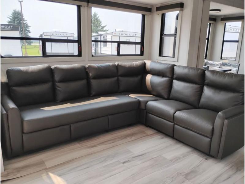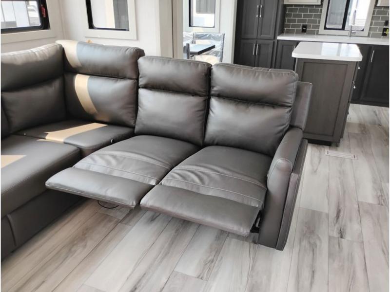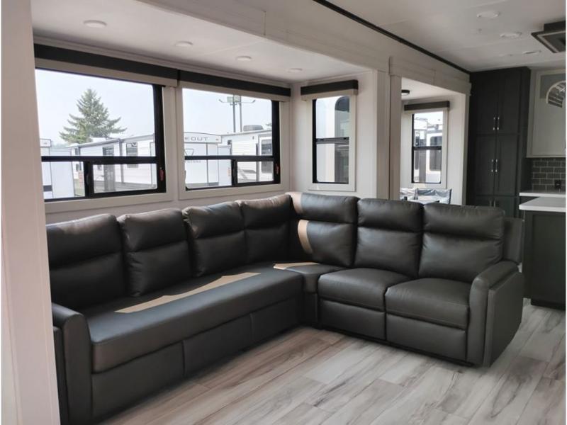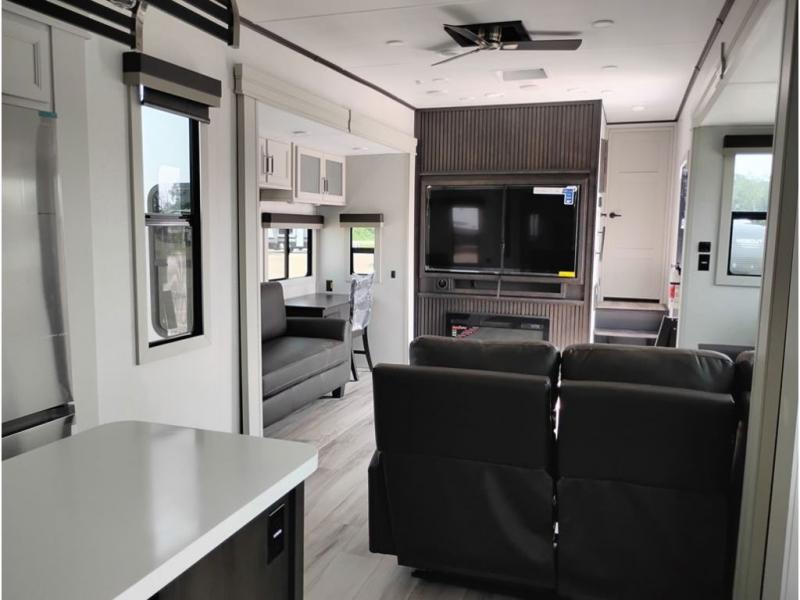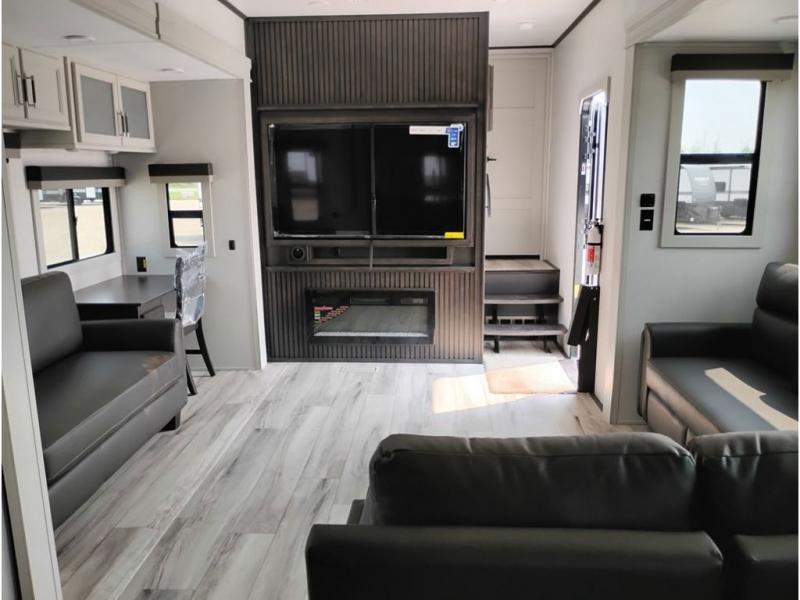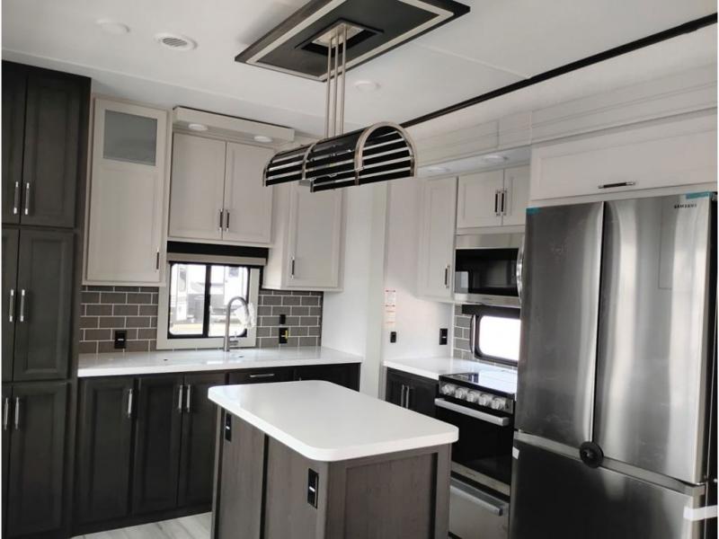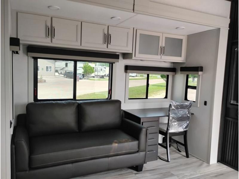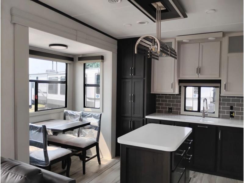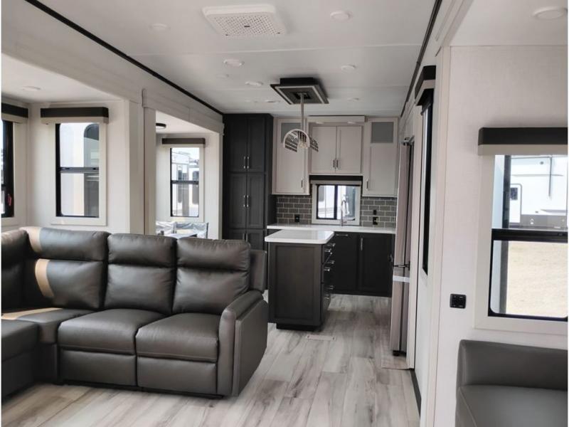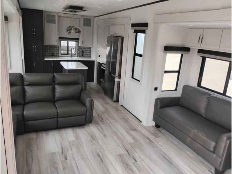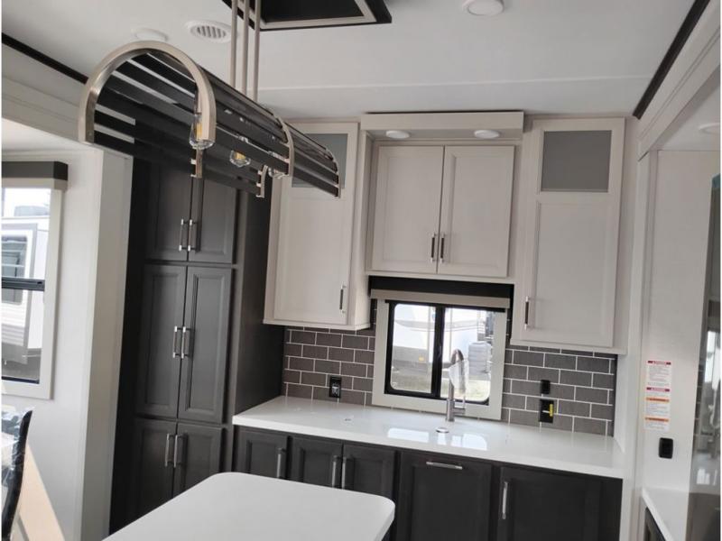 This rear kitchen fifth wheel makes extended stays or weekend trips to the lake enjoyable! The chef of your group will find plenty of counter space with the included kitchen island, plus there is a pantry and 18 cu. ft. residential refrigerator for food storage. A free-standing dinette provides a place to dine together, and the largest L-shaped sofa with recliners will be the perfect spot to relax with a movie. If you have guests, they could sleep here or on the hide-a-bed sofa sleeper. The dual entry bath includes a shower with a seat for added comfort, and the front master bedroom will feel just like home with its king bed slide out and master closet. There is also a dresser and stackable washer and dryer prep if you want to add those appliances!