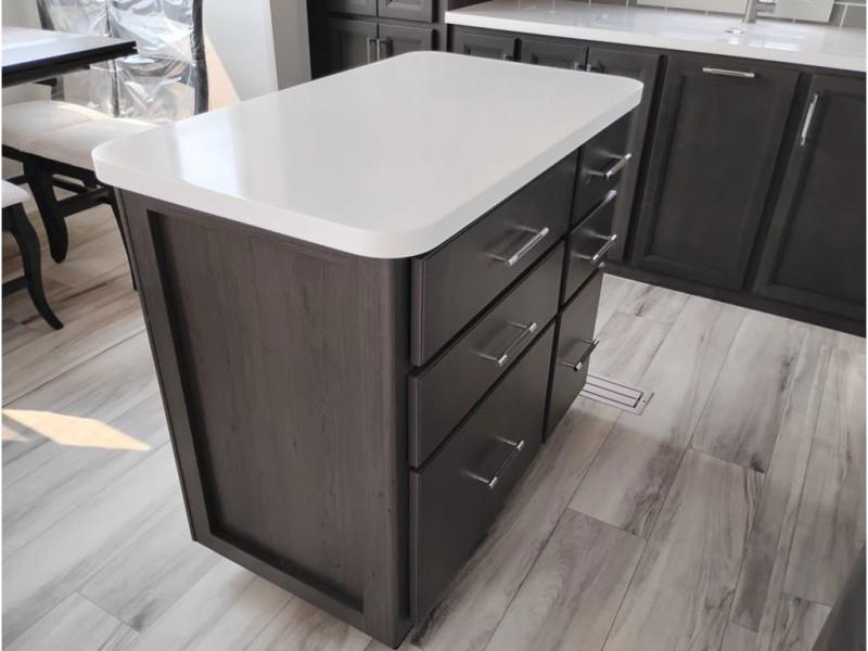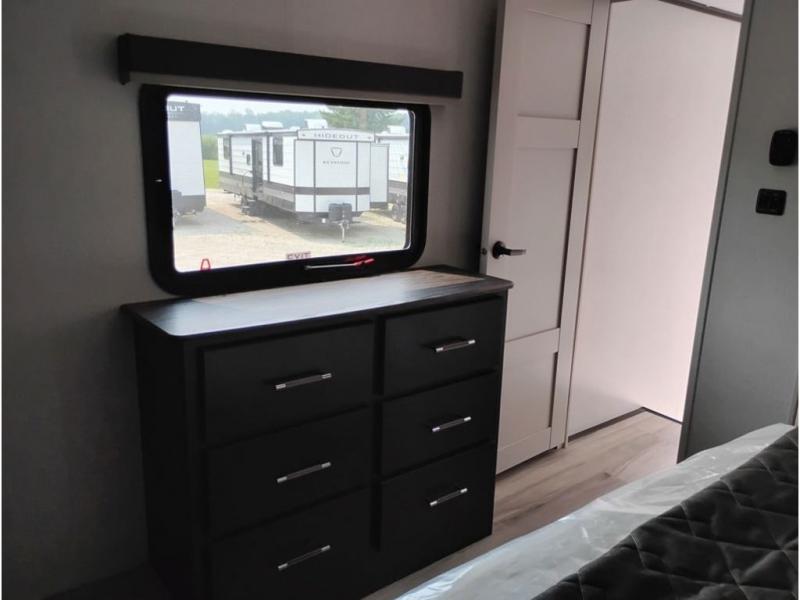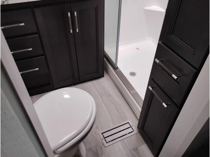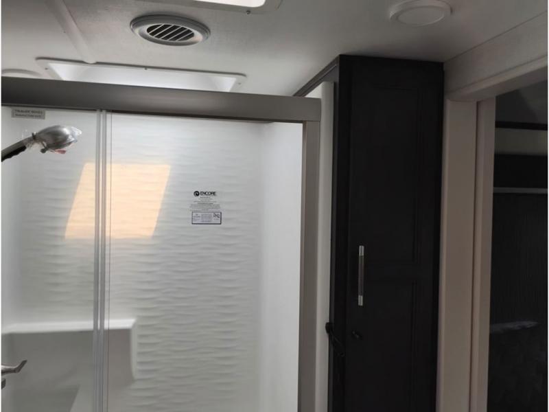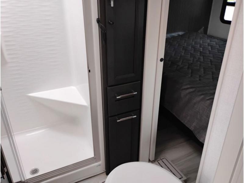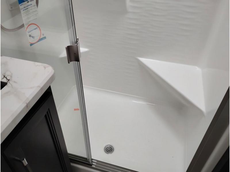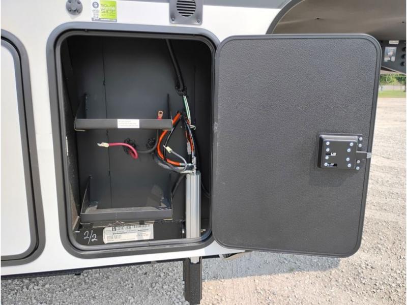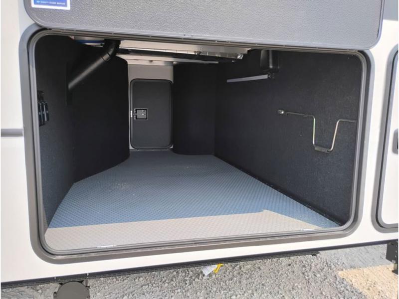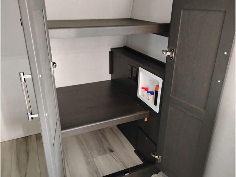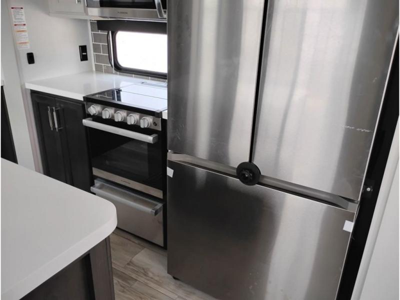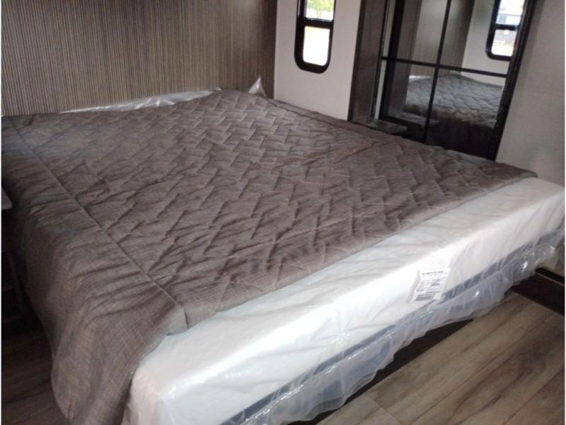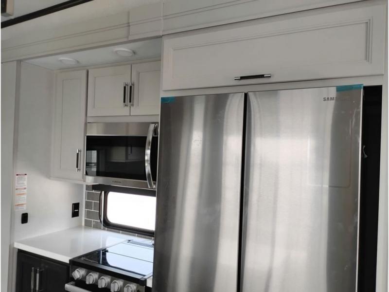 This rear kitchen fifth wheel makes extended stays or weekend trips to the lake enjoyable! The chef of your group will find plenty of counter space with the included kitchen island, plus there is a pantry and 18 cu. ft. residential refrigerator for food storage. A free-standing dinette provides a place to dine together, and the largest L-shaped sofa with recliners will be the perfect spot to relax with a movie. If you have guests, they could sleep here or on the hide-a-bed sofa sleeper. The dual entry bath includes a shower with a seat for added comfort, and the front master bedroom will feel just like home with its king bed slide out and master closet. There is also a dresser and stackable washer and dryer prep if you want to add those appliances!