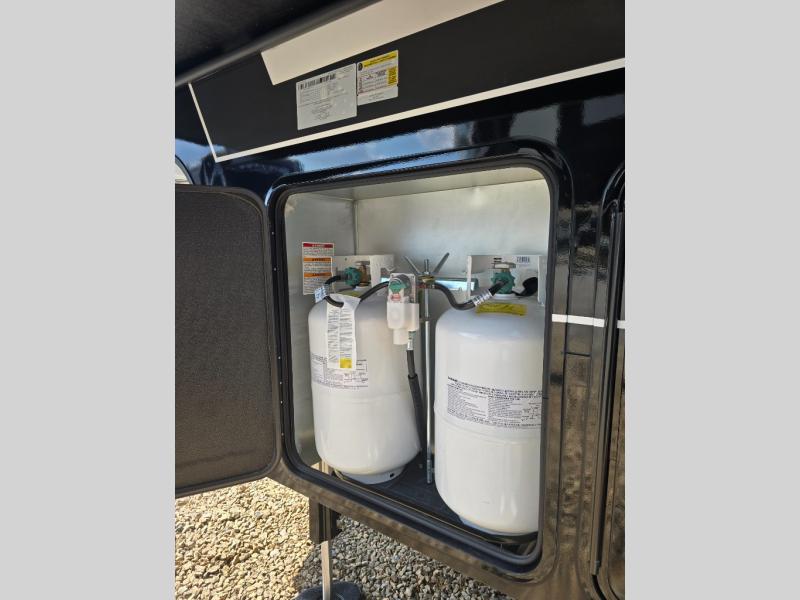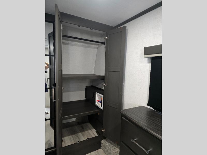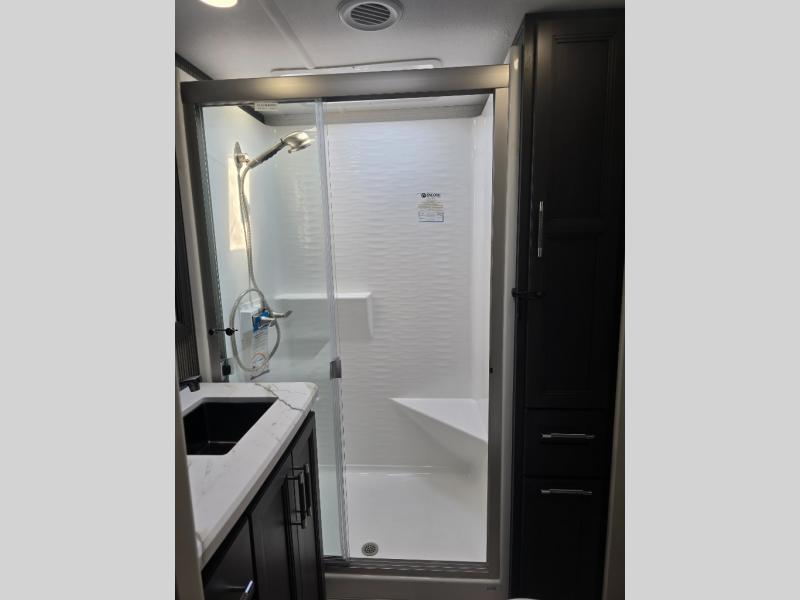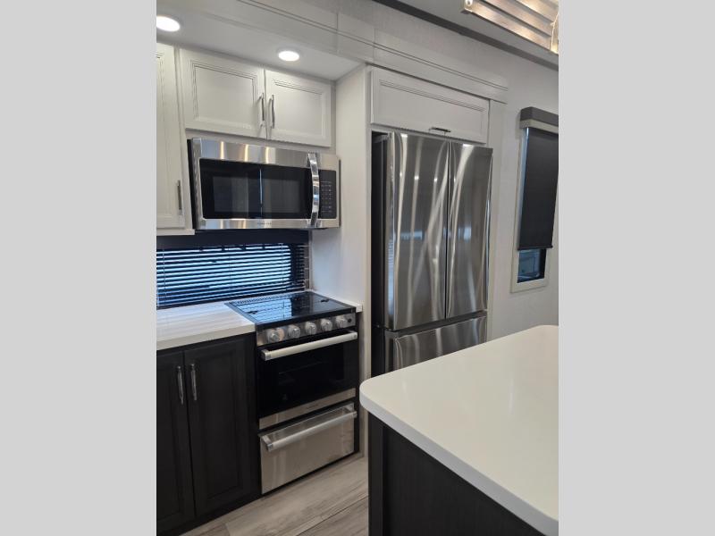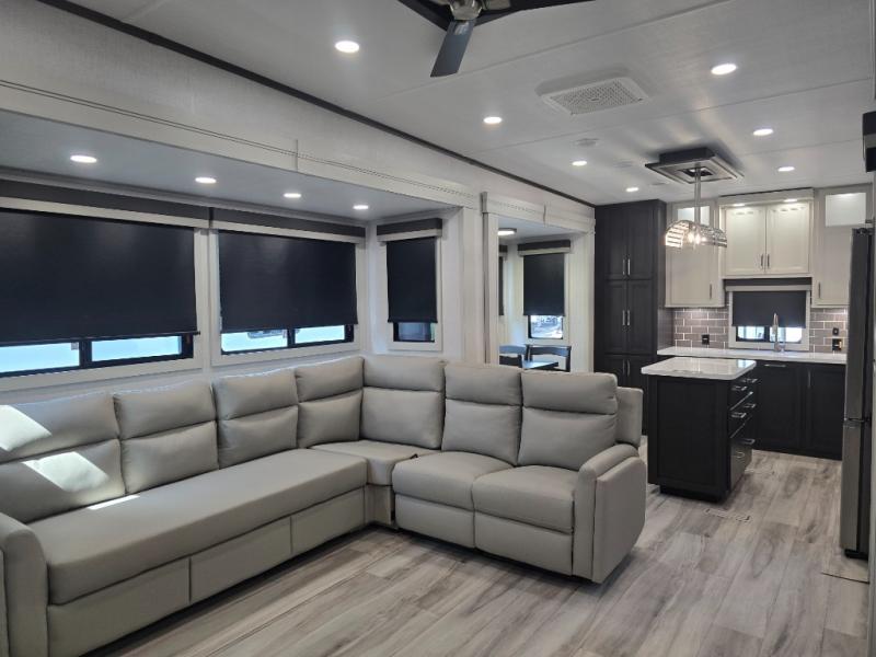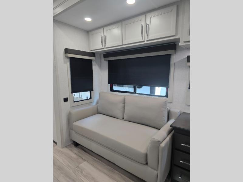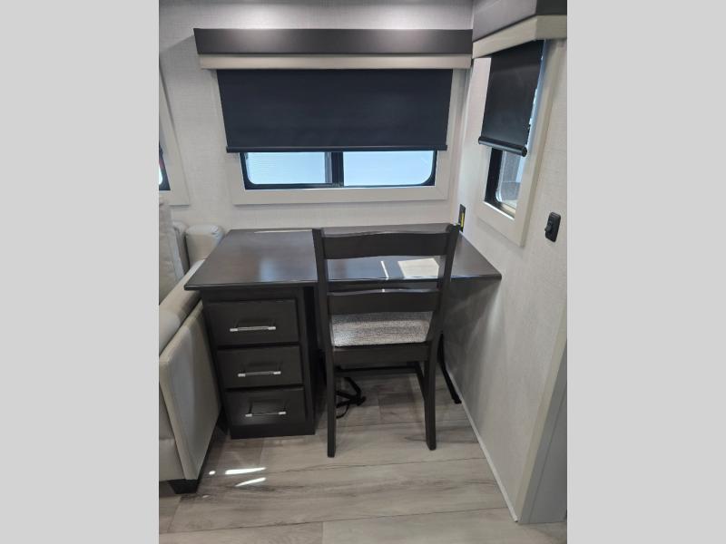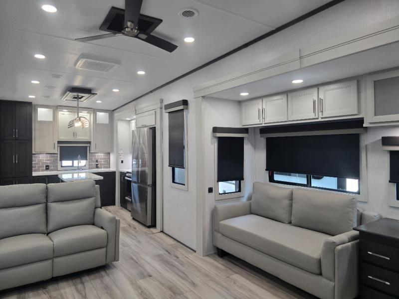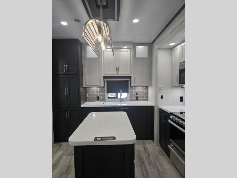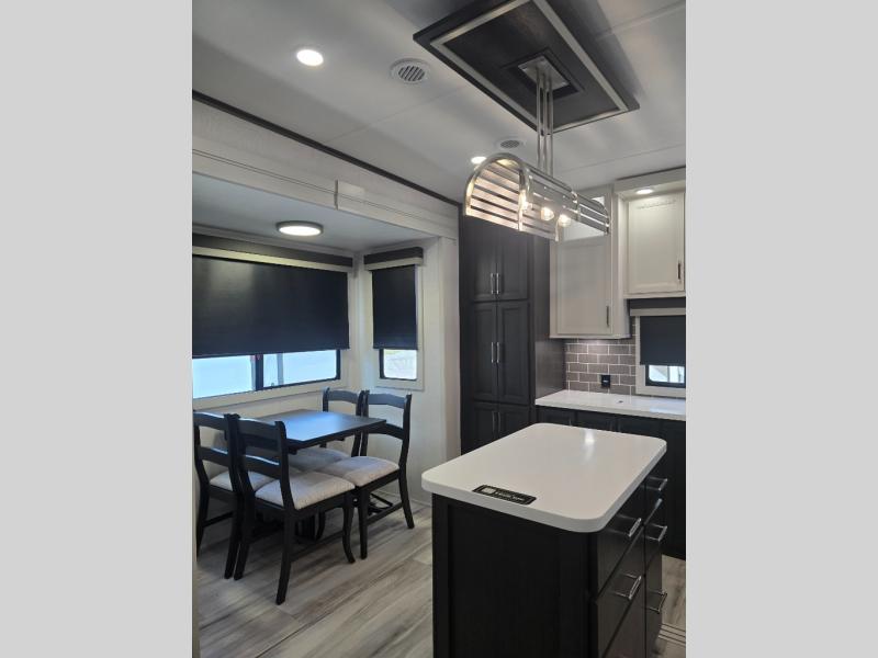 This rear kitchen fifth wheel makes extended stays or weekend trips to the lake enjoyable! The chef of your group will find plenty of counter space with the included kitchen island, plus there is a pantry and 18 cu. ft. residential refrigerator for food storage. A free-standing dinette provides a place to dine together, and the largest L-shaped sofa with recliners will be the perfect spot to relax with a movie. If you have guests, they could sleep here or on the hide-a-bed sofa sleeper. The dual entry bath includes a shower with a seat for added comfort, and the front master bedroom will feel just like home with its king bed slide out and master closet. There is also a dresser and stackable washer and dryer prep if you want to add those appliances!