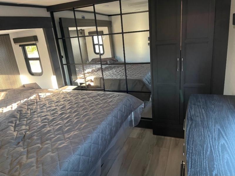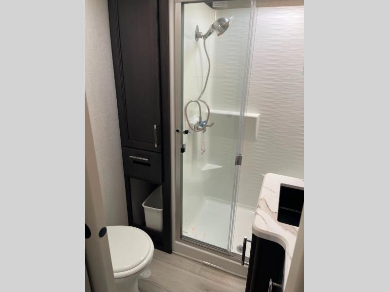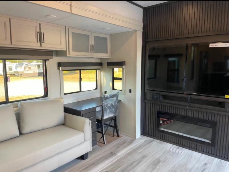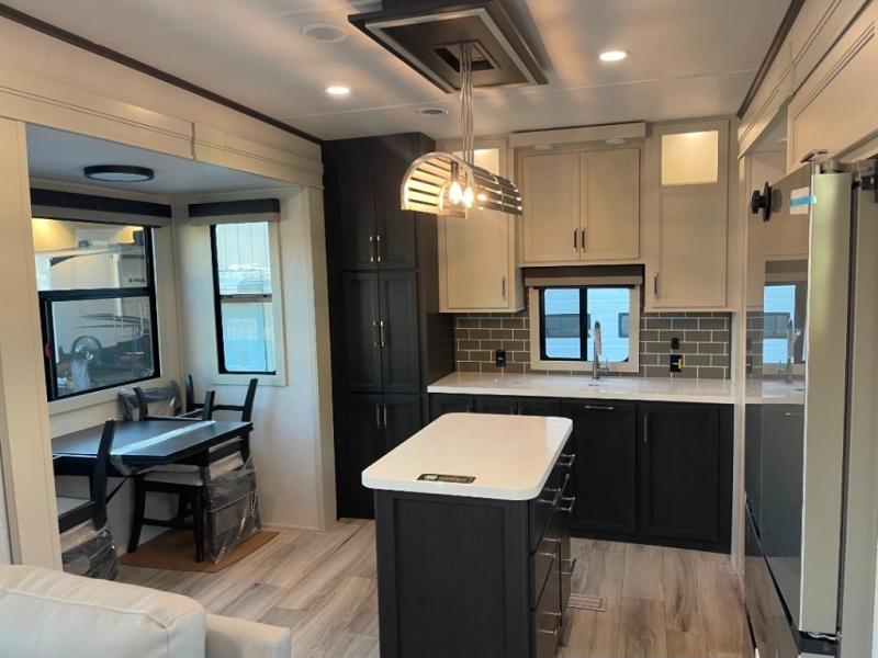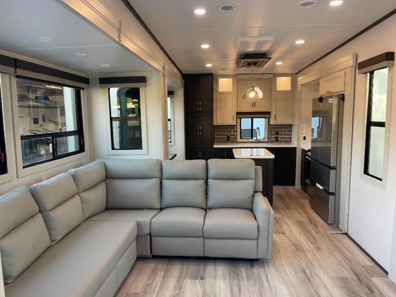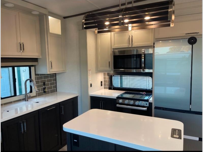This rear kitchen fifth wheel makes extended stays or weekend trips to the lake enjoyable! The chef of your group will find plenty of counter space with the included kitchen island, plus there is a pantry and 18 cu. ft. residential refrigerator for food storage. A free-standing dinette provides a place to dine together, and the largest L-shaped sofa with recliners will be the perfect spot to relax with a movie. If you have guests, they could sleep here or on the hide-a-bed sofa sleeper. The dual entry bath includes a shower with a seat for added comfort, and the front master bedroom will feel just like home with its king bed slide out and master closet. There is also a dresser and stackable washer and dryer prep if you want to add those appliances!