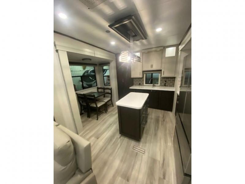 This rear kitchen fifth wheel makes extended stays or weekend trips to the lake enjoyable! The chef of your group will find plenty of counter space with the included kitchen island, plus there is a pantry and 18 cu. ft. residential refrigerator for food storage. A free-standing dinette provides a place to dine together, and the largest L-shaped sofa with recliners will be the perfect spot to relax with a movie. If you have guests, they could sleep here or on the hide-a-bed sofa sleeper. The dual entry bath includes a shower with a seat for added comfort, and the front master bedroom will feel just like home with its king bed slide out and master closet. There is also a dresser and stackable washer and dryer prep if you want to add those appliances!