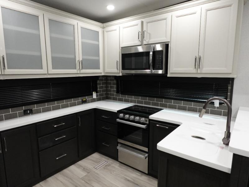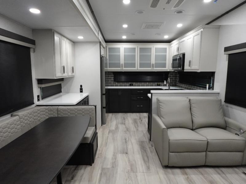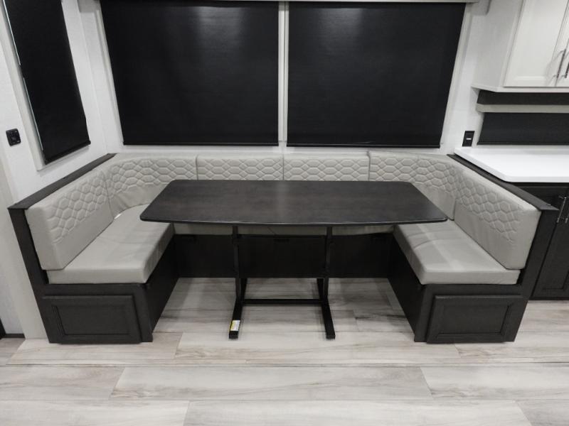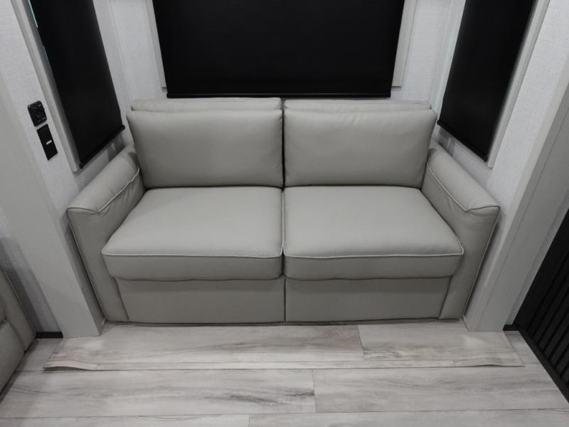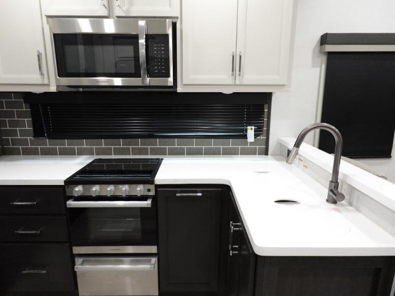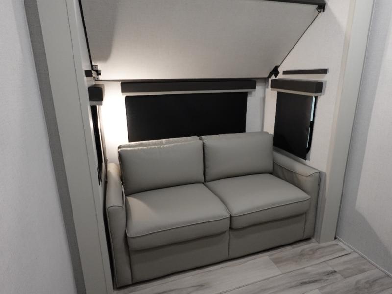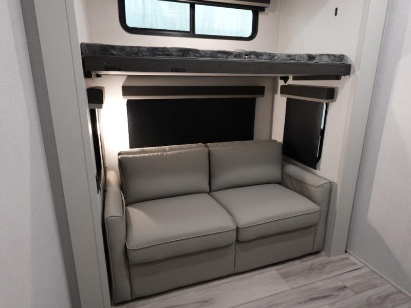 The whole gang will love camping in this fifth wheel since there is space for everyone! A front master bedroom includes a king bed slide out, master closet. Your guests or little ones will love the middle bunkhouse with a flip bunk above a hide-a-bed sofa, along with a pull-out table and storage space. Everyone can meet in the living area which features dual opposing slides for more space, theater seating, a sleeper sofa, and a U-shaped dinette, providing even more sleeping space. And check out the rear kitchen with its wrap-around counter space, Furrion appliances, and large pantry to keep snacks stocked!
