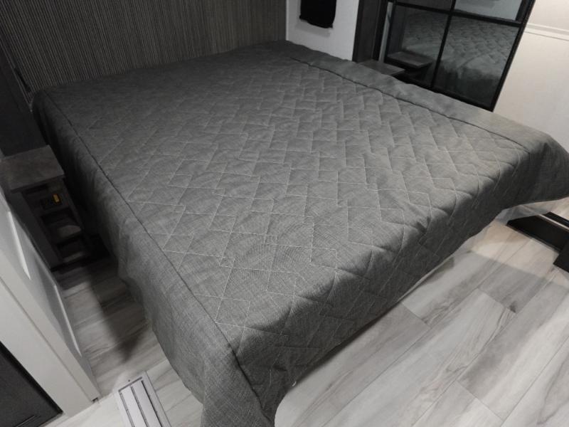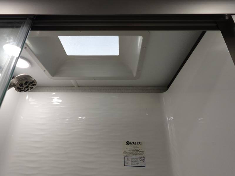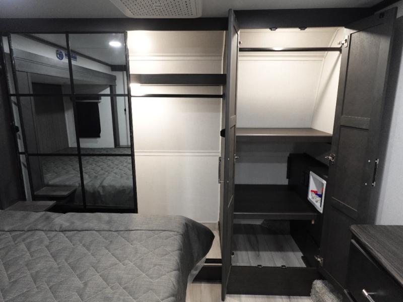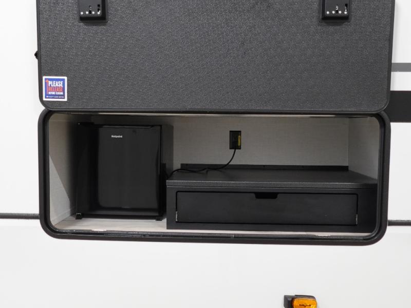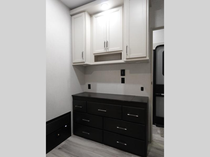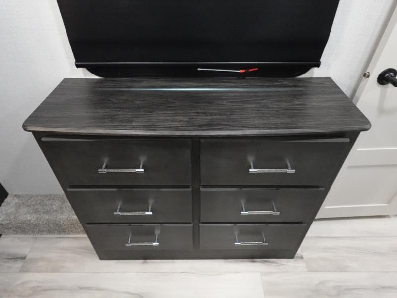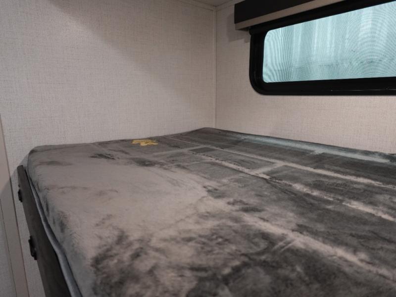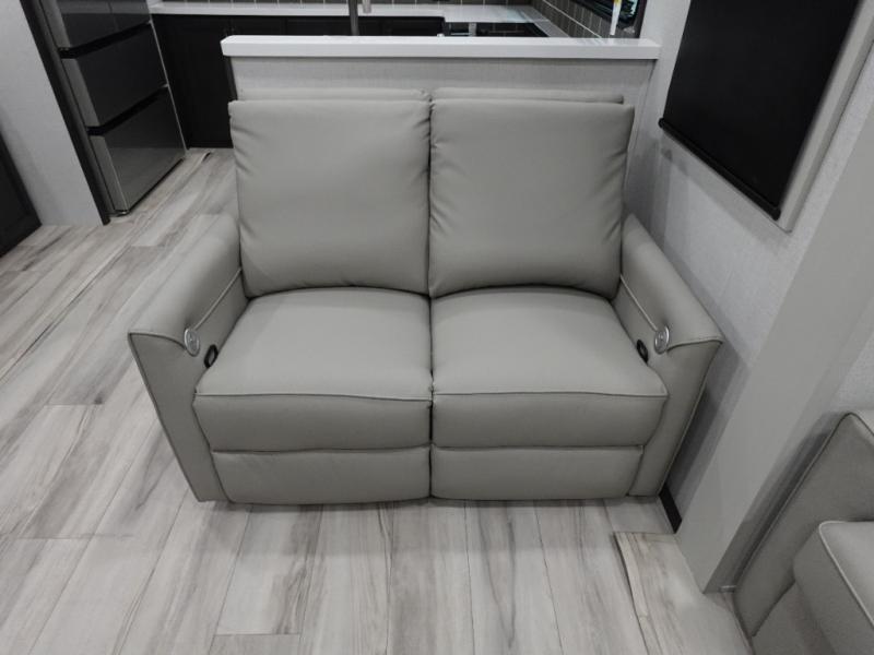 The whole gang will love camping in this fifth wheel since there is space for everyone! A front master bedroom includes a king bed slide out, master closet. Your guests or little ones will love the middle bunkhouse with a flip bunk above a hide-a-bed sofa, along with a pull-out table and storage space. Everyone can meet in the living area which features dual opposing slides for more space, theater seating, a sleeper sofa, and a U-shaped dinette, providing even more sleeping space. And check out the rear kitchen with its wrap-around counter space, Furrion appliances, and large pantry to keep snacks stocked!