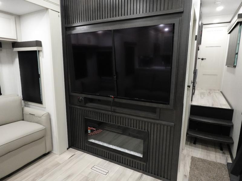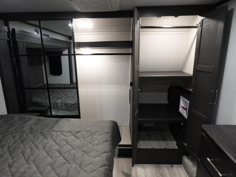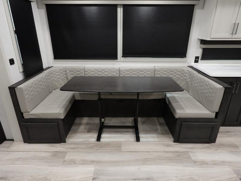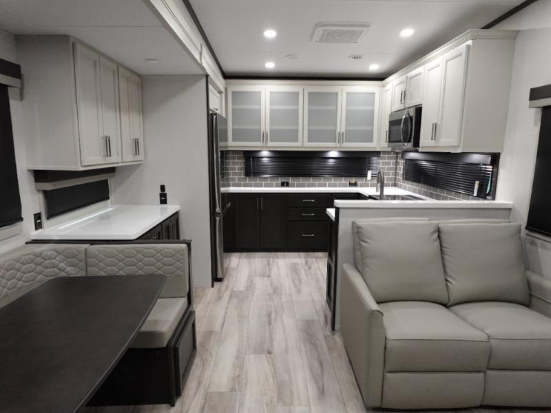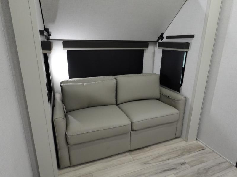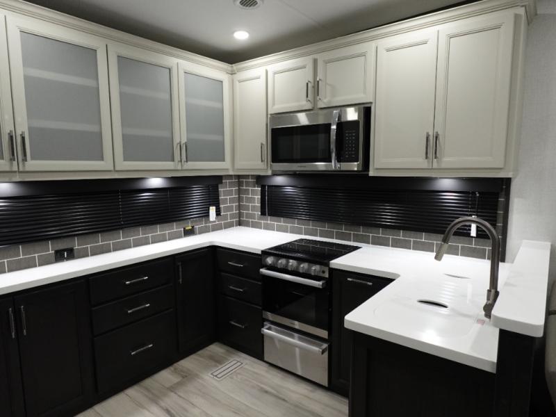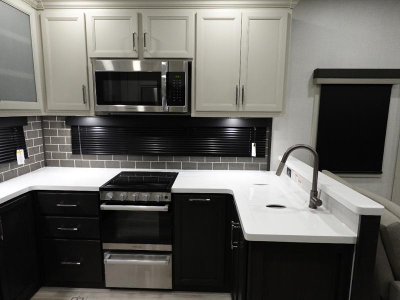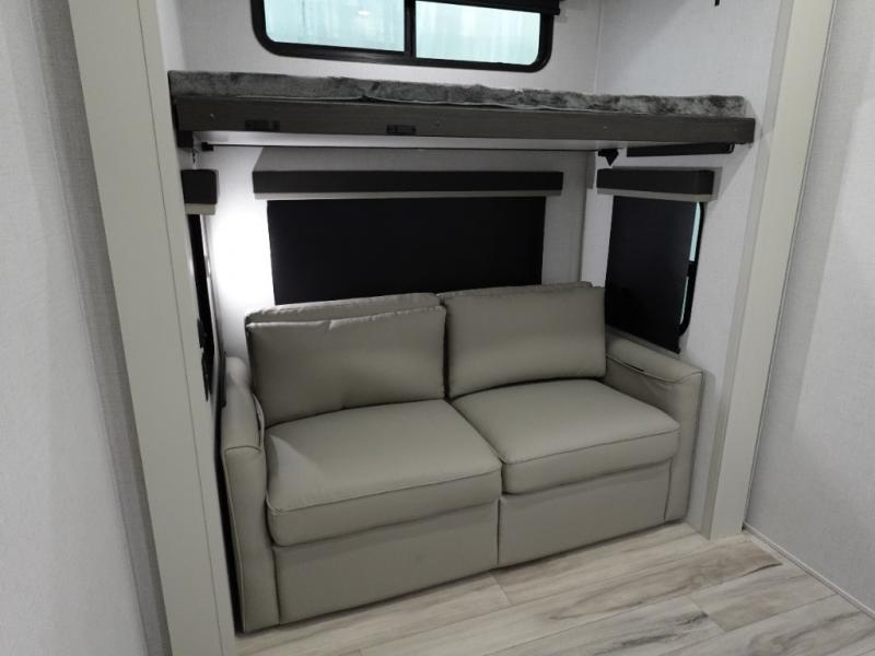 The whole gang will love camping in this fifth wheel since there is space for everyone! A front master bedroom includes a king bed slide out, master closet, and stackable washer and dryer prep if you choose to go full-time. Your guests or little ones will love the middle bunkhouse with a flip bunk above a hide-a-bed sofa, along with a pull-out table and storage space. Everyone can meet in the living area which features dual opposing slides for more space, theater seating, a sleeper sofa, and a U-shaped dinette, providing even more sleeping space. And check out the rear kitchen with its wrap-around counter space, Furrion appliances, and large pantry to keep snacks stocked!