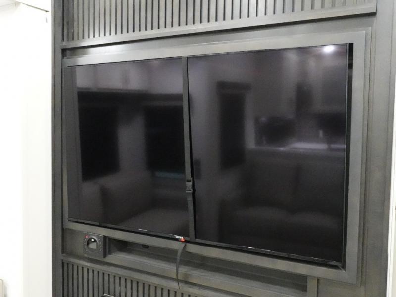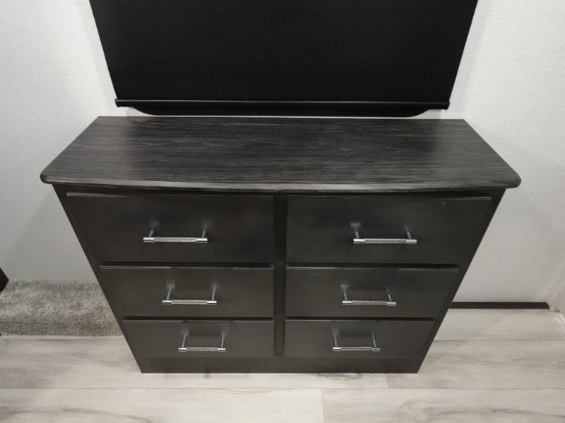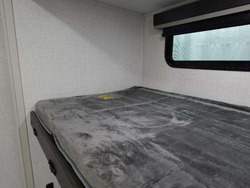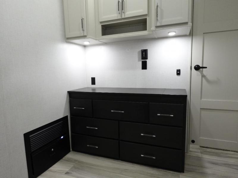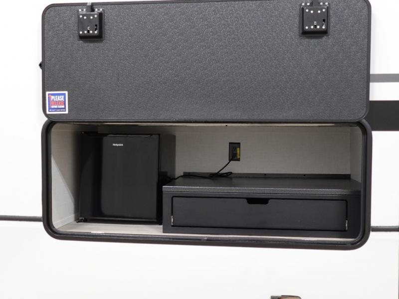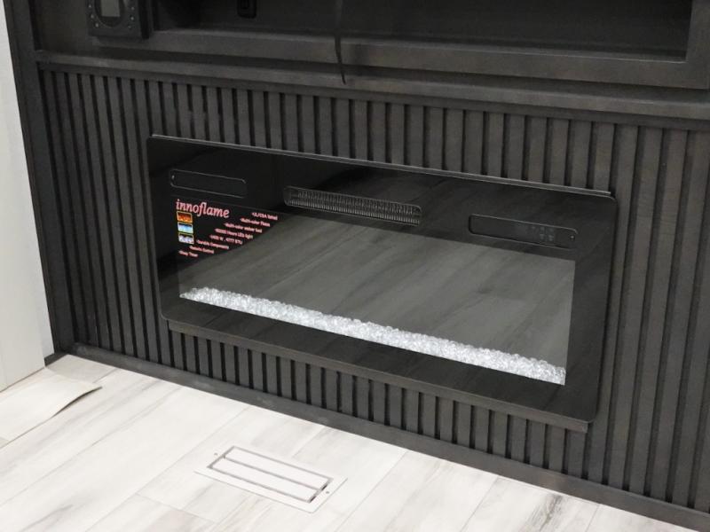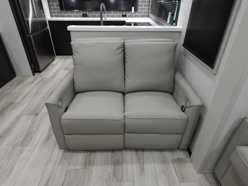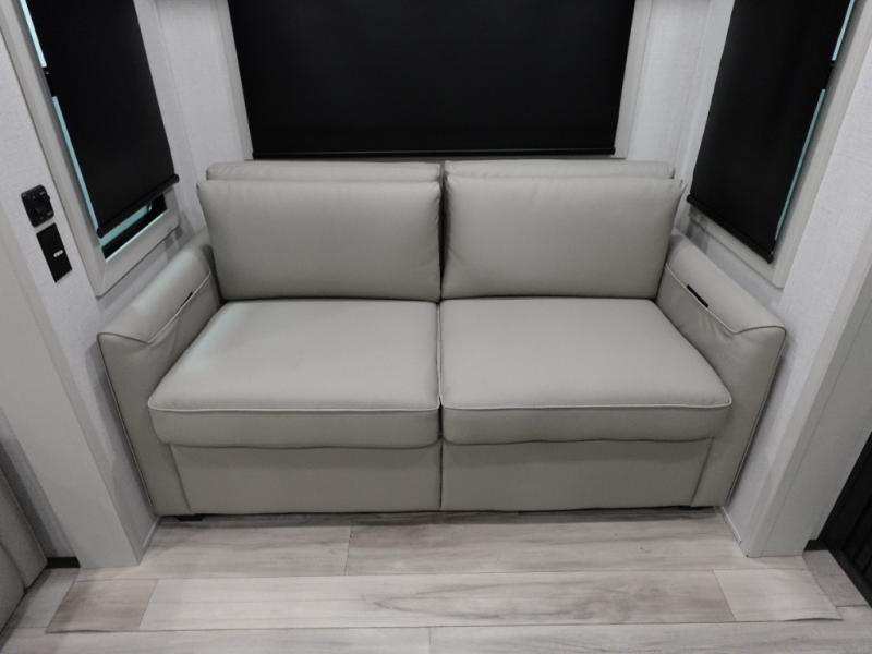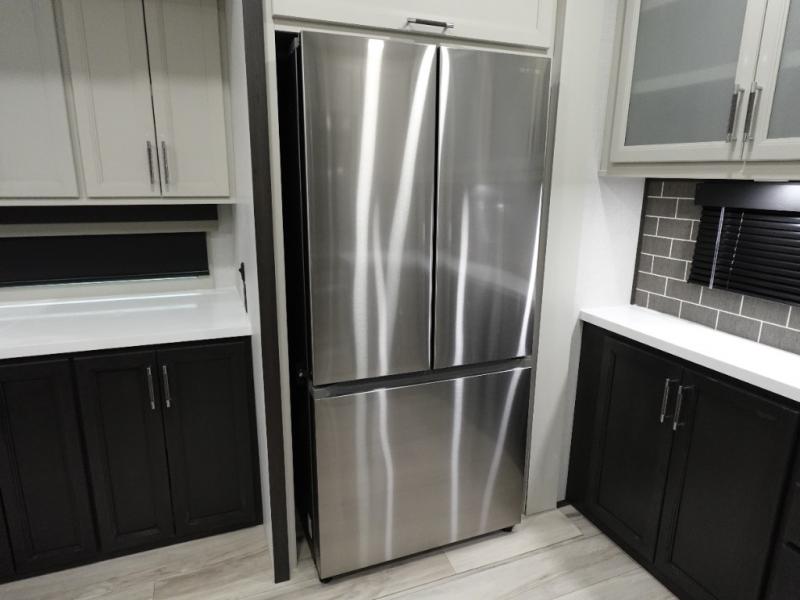 The whole gang will love camping in this fifth wheel since there is space for everyone! A front master bedroom includes a king bed slide out, master closet, and stackable washer and dryer prep if you choose to go full-time. Your guests or little ones will love the middle bunkhouse with a flip bunk above a hide-a-bed sofa, along with a pull-out table and storage space. Everyone can meet in the living area which features dual opposing slides for more space, theater seating, a sleeper sofa, and a U-shaped dinette, providing even more sleeping space. And check out the rear kitchen with its wrap-around counter space, Furrion appliances, and large pantry to keep snacks stocked!