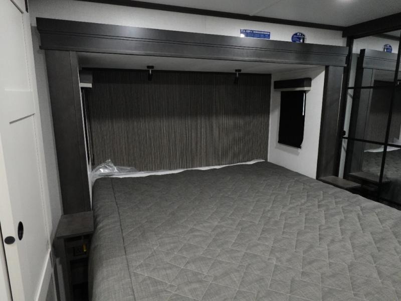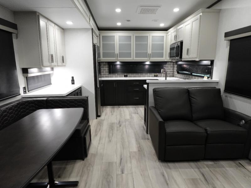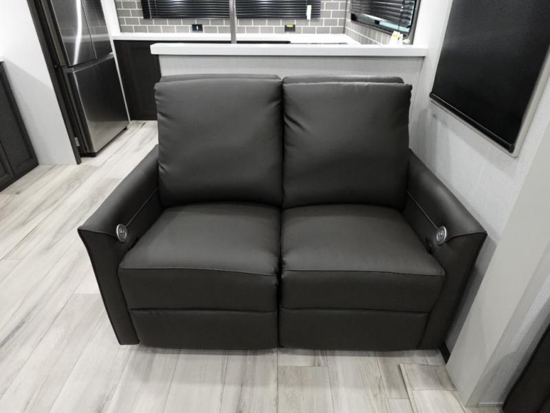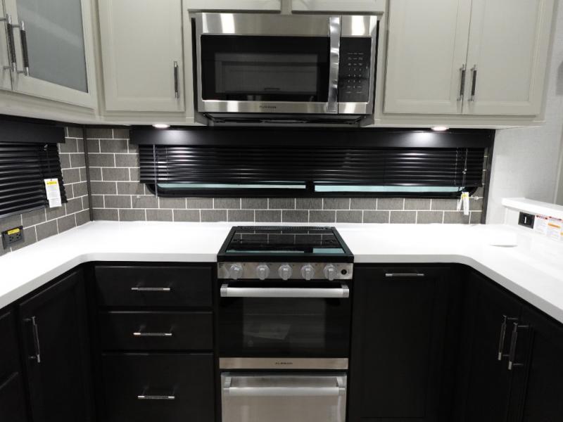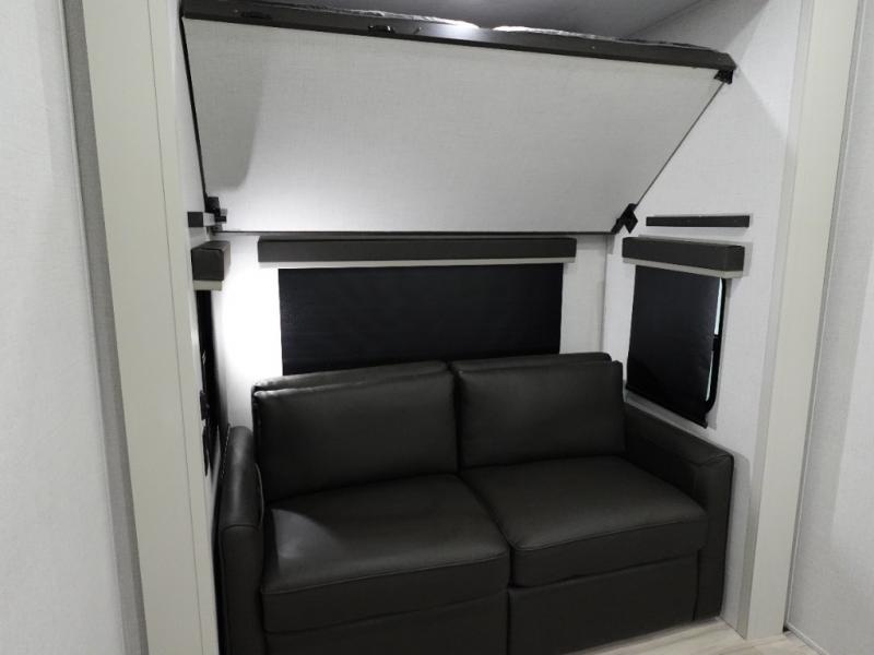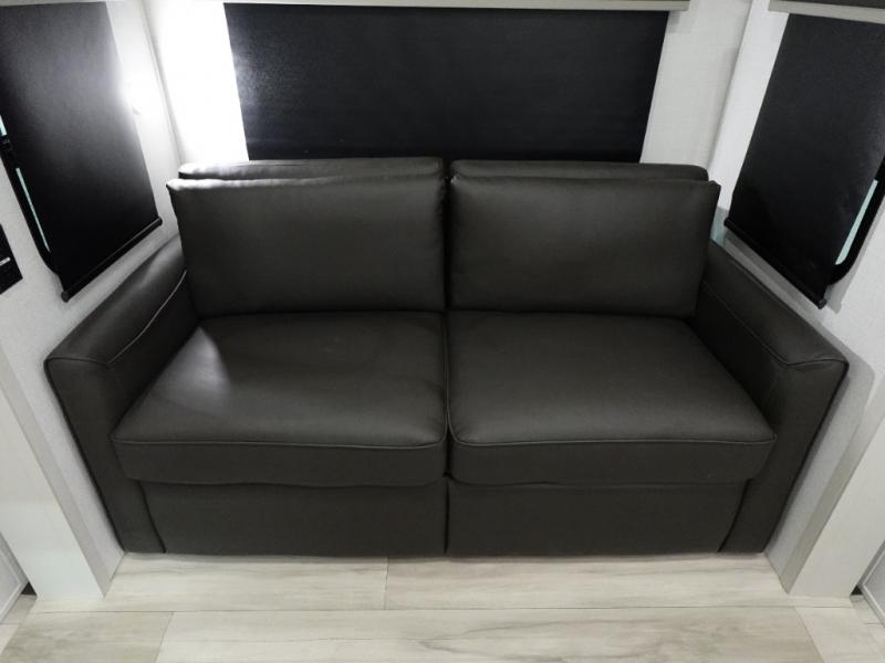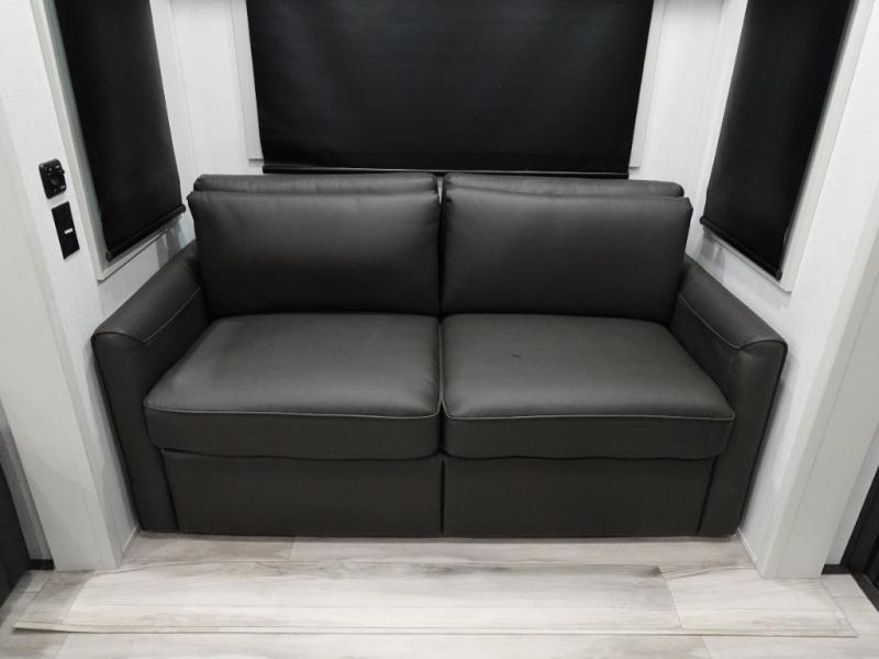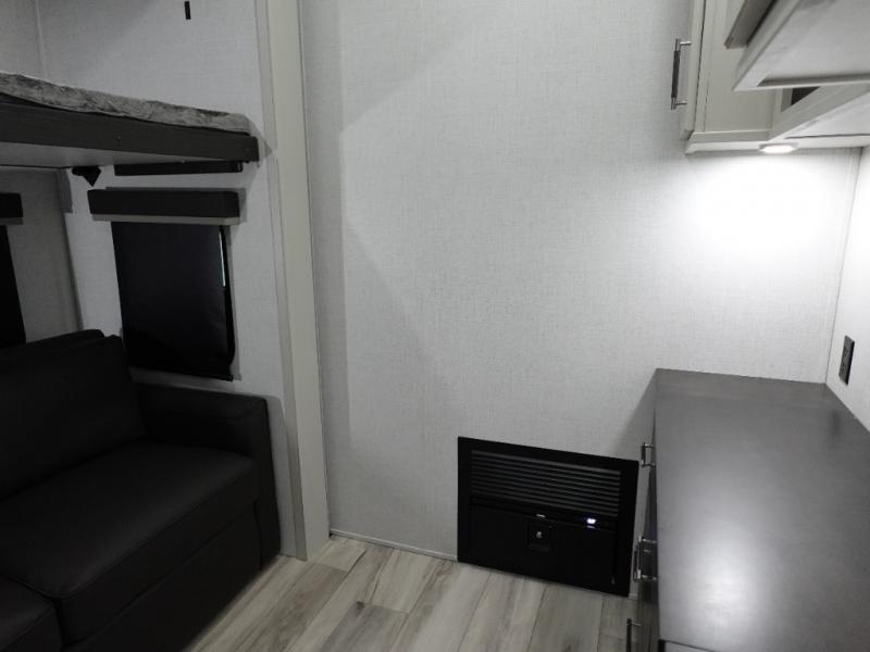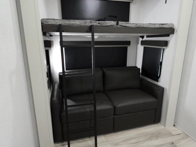 The whole gang will love camping in this fifth wheel since there is space for everyone! A front master bedroom includes a king bed slide out, master closet, and stackable washer and dryer prep if you choose to go full-time. Your guests or little ones will love the middle bunkhouse with a flip bunk above a hide-a-bed sofa, along with a pull-out table and storage space. Everyone can meet in the living area which features dual opposing slides for more space, theater seating, a sleeper sofa, and a U-shaped dinette, providing even more sleeping space. And check out the rear kitchen with its wrap-around counter space, Furrion appliances, and large pantry to keep snacks stocked!