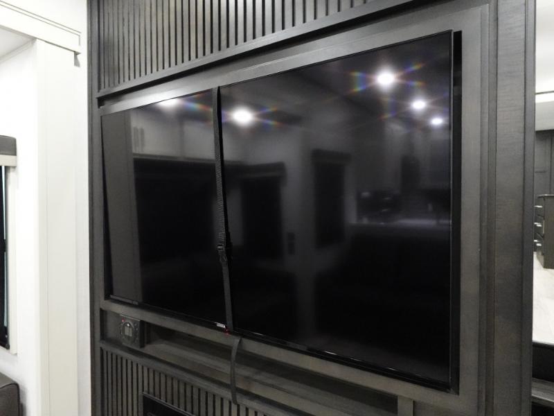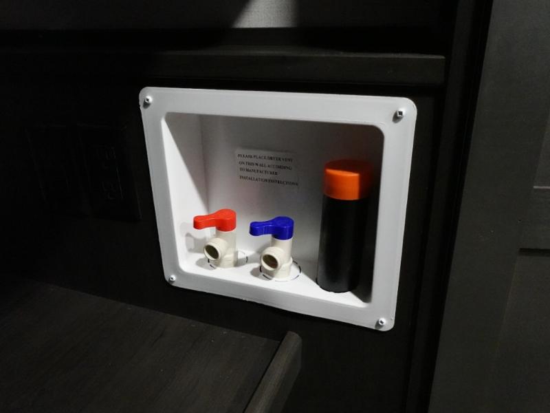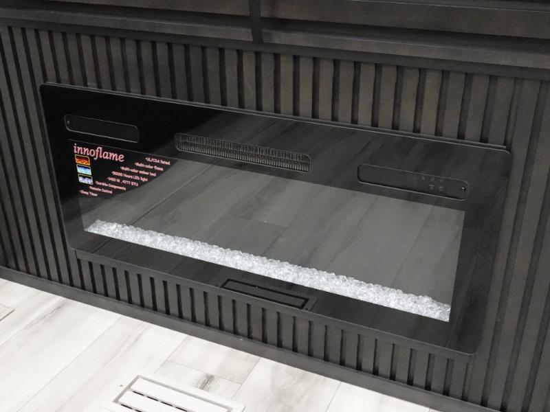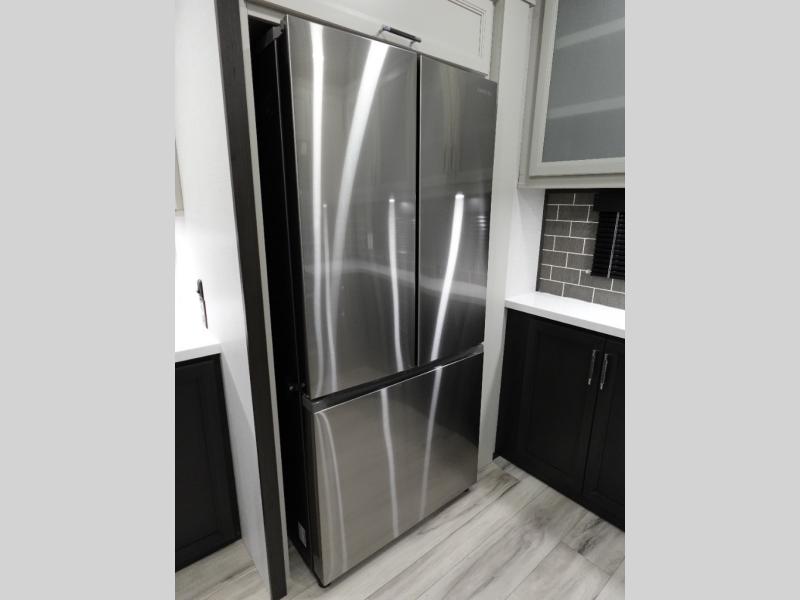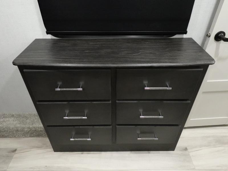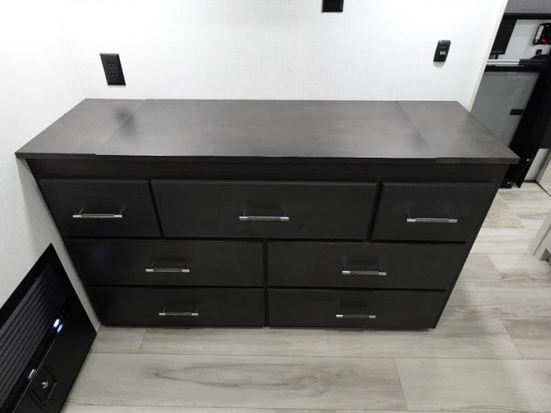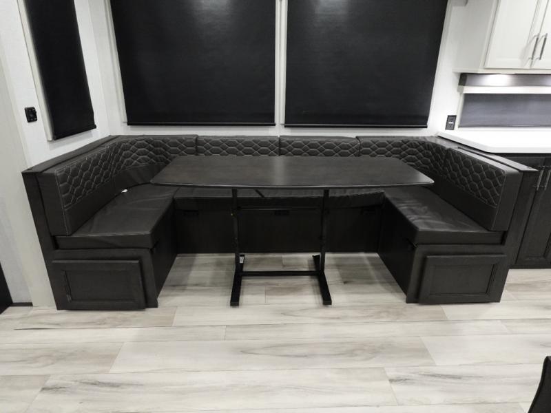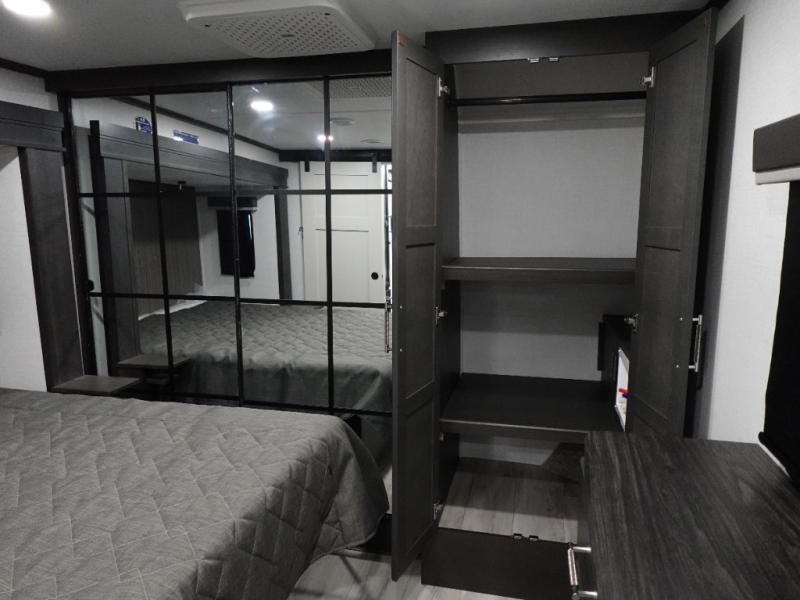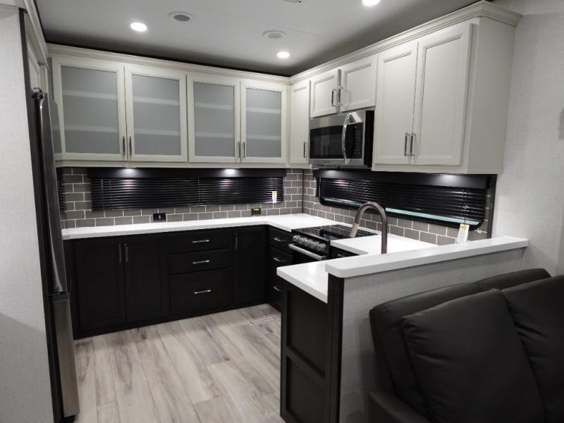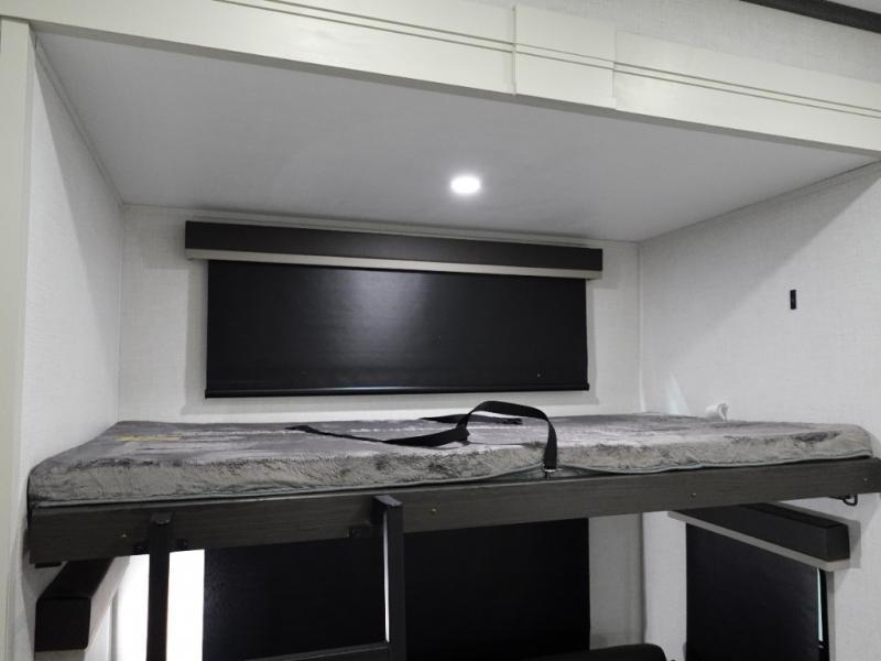 The whole gang will love camping in this fifth wheel since there is space for everyone! A front master bedroom includes a king bed slide out, master closet, and stackable washer and dryer prep if you choose to go full-time. Your guests or little ones will love the middle bunkhouse with a flip bunk above a hide-a-bed sofa, along with a pull-out table and storage space. Everyone can meet in the living area which features dual opposing slides for more space, theater seating, a sleeper sofa, and a U-shaped dinette, providing even more sleeping space. And check out the rear kitchen with its wrap-around counter space, Furrion appliances, and large pantry to keep snacks stocked!