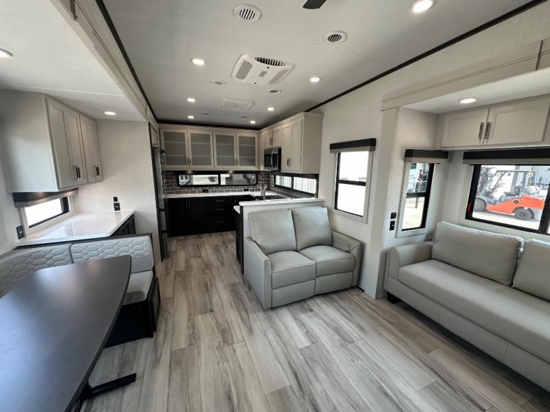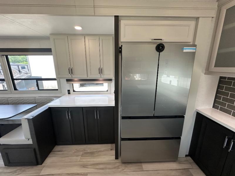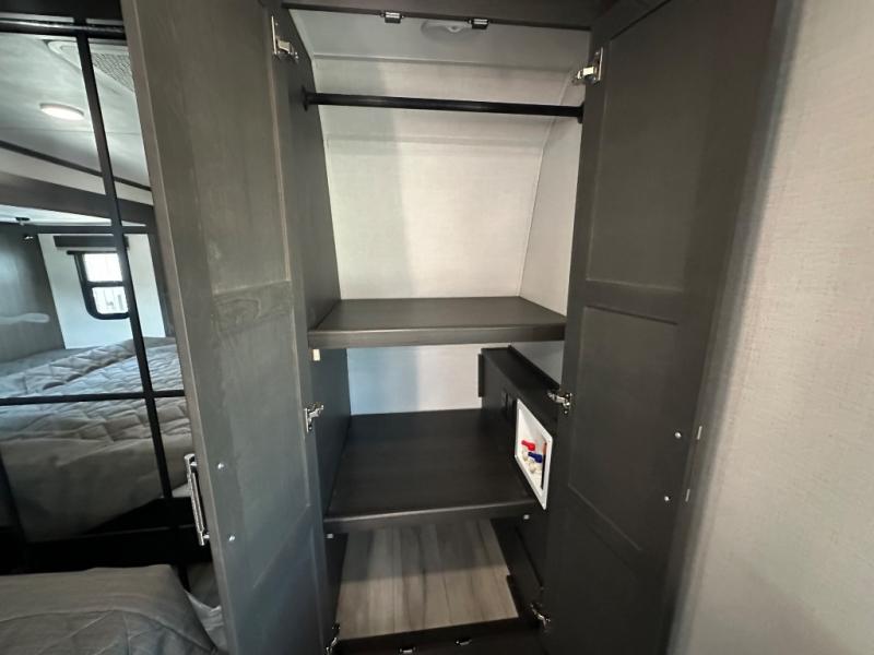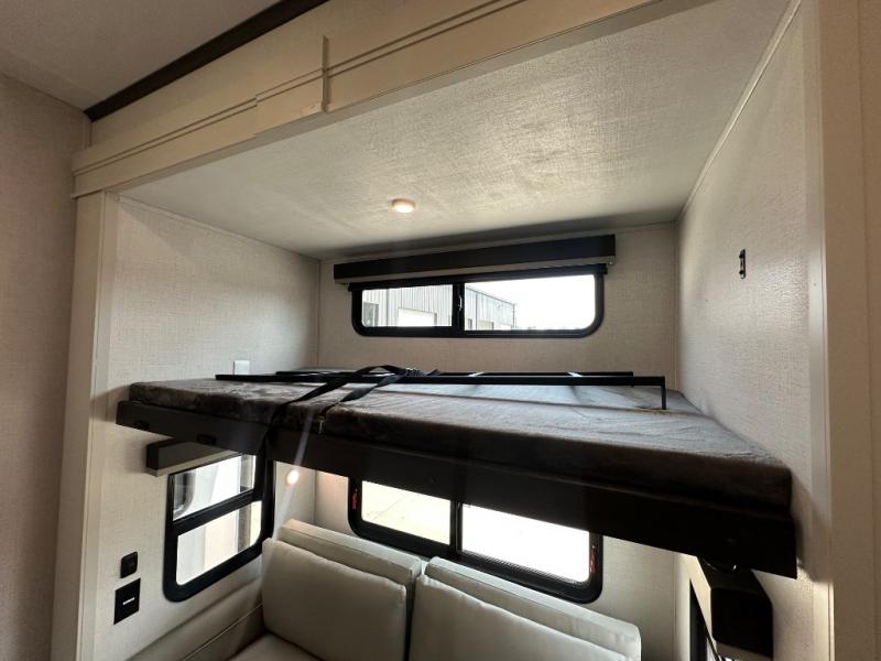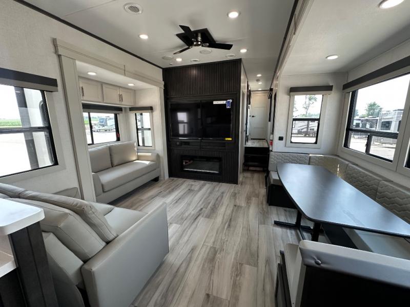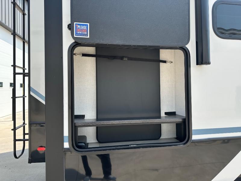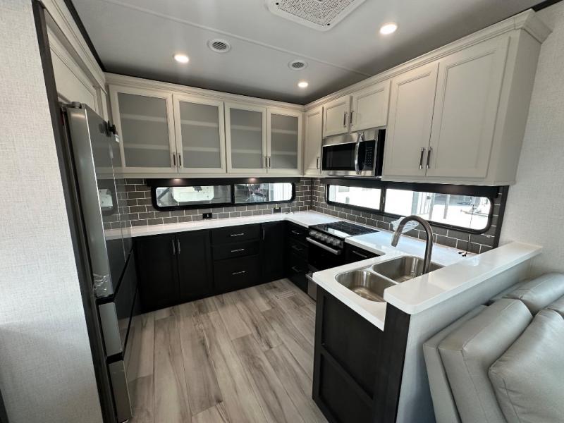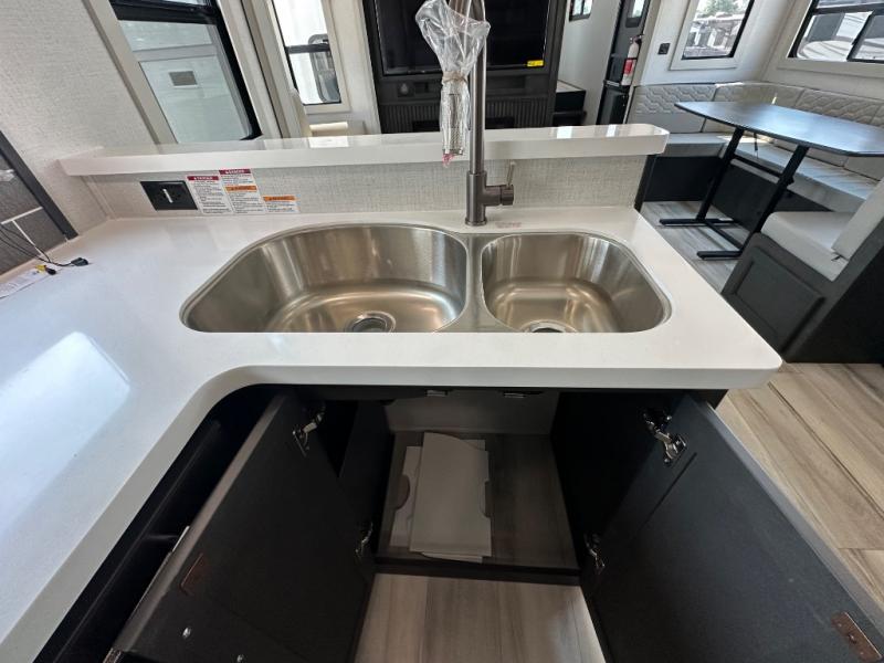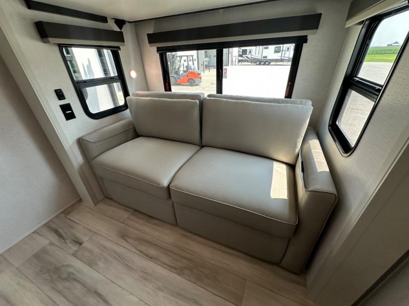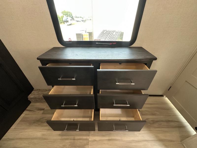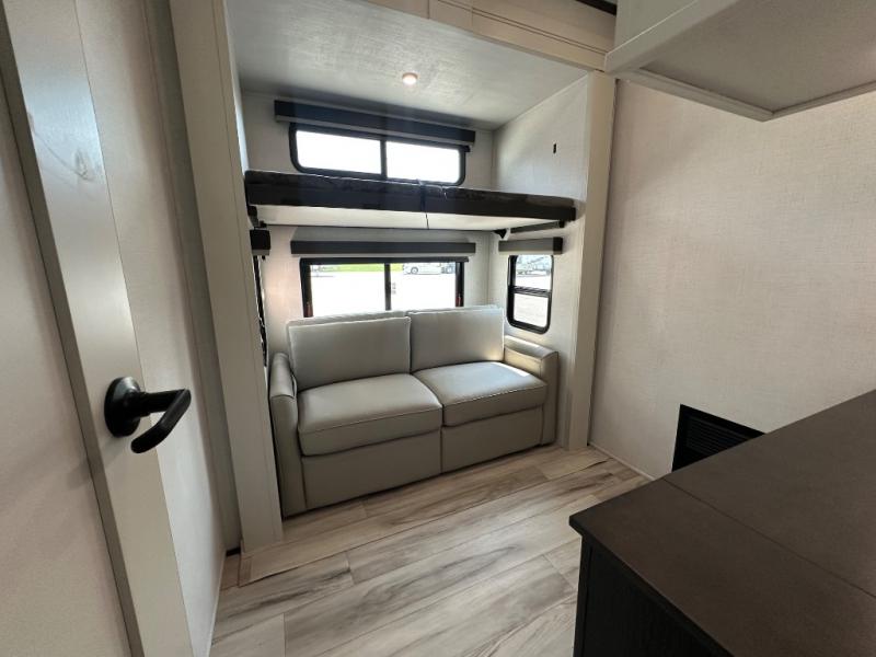 The whole gang will love camping in this fifth wheel since there is space for everyone! A front master bedroom includes a king bed slide out, master closet, and stackable washer and dryer prep if you choose to go full-time. Your guests or little ones will love the middle bunkhouse with a flip bunk above a hide-a-bed sofa, along with a pull-out table and storage space. Everyone can meet in the living area which features dual opposing slides for more space, theater seating, a sleeper sofa, and a U-shaped dinette, providing even more sleeping space. And check out the rear kitchen with its wrap-around counter space, Furrion appliances, and large pantry to keep snacks stocked!
